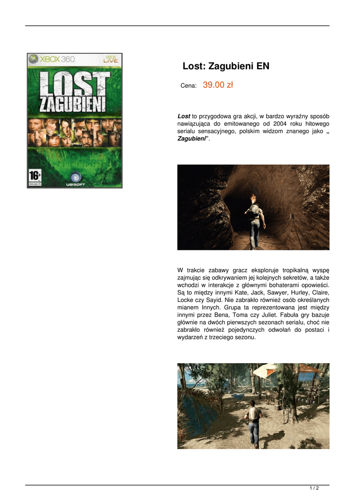 Lost: Zagubieni EN Cena: 39.00 zł Lost to przygodowa gra akcji, w bardzo wyraźny sposób nawiązująca do emitowanego od 2004 roku hitowego serialu sensacyjnego, polskim widzom znanego jako „ Zagubieni”. W trakcie zabawy gracz eksploruje tropikalną wyspę zajmując się odkrywaniem jej kolejnych sekretów, a także wchodzi w interakcje z głównymi bohaterami opowieści. Są to między innymi Kate, Jack, Sawyer, Hurley, Claire, Locke czy Sayid. Nie zabrakło również osób określanych mianem Innych. Grupa ta reprezentowana jest między innymi przez Bena, Toma czy Juliet. Fabuła gry bazuje głównie na dwóch pierwszych sezonach serialu, choć nie zabrakło również pojedynczych odwołań do postaci i wydarzeń z trzeciego sezonu. 1/2 Akcja Via Domus, podobnie jak ma to miejsce w przypadku serialu, rozgrywa się na bliżej nieokreślonej wyspie, zlokalizowanej na Pacyfiku. Gracz przejmuje kontrolę nad postacią Elliotta Maslowa, jednego z rozbitków fikcyjnego lotu 815, podróżującego na trasie pomiędzy Sydney, a Los Angeles. Główny bohater w wyniku katastrofy traci pamięć. Zadaniem gracza staje się odkrywanie kolejnych szczegółów z przeszłości Elliotta. Odbywa się to na dwa sposoby – poprzez oglądanie ukazujących się mu wizji oraz uczestniczenie w interaktywnych retrospekcjach. Zobacz wideo: 2/2 Powered by TCPDF (www.tcpdf.org)