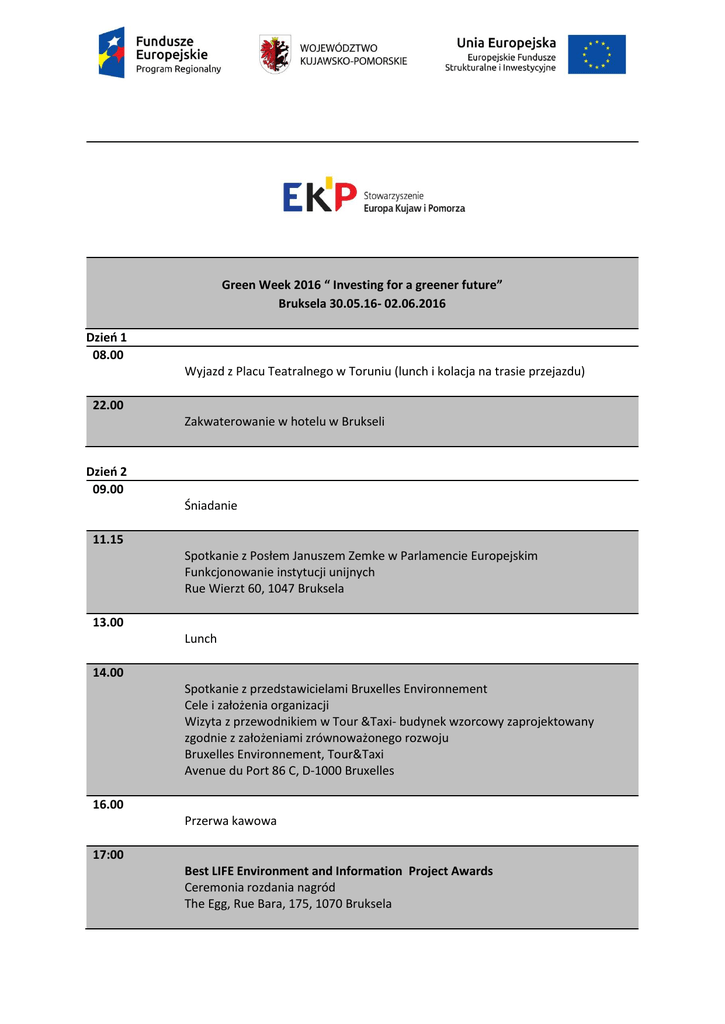 Green Week 2016 “ Investing for a greener future” Bruksela 30.05.16- 02.06.2016 Dzień 1 08.00 Wyjazd z Placu Teatralnego w Toruniu (lunch i kolacja na trasie przejazdu) 22.00 Zakwaterowanie w hotelu w Brukseli Dzień 2 09.00 Śniadanie 11.15 Spotkanie z Posłem Januszem Zemke w Parlamencie Europejskim Funkcjonowanie instytucji unijnych Rue Wierzt 60, 1047 Bruksela 13.00 Lunch 14.00 Spotkanie z przedstawicielami Bruxelles Environnement Cele i założenia organizacji Wizyta z przewodnikiem w Tour &Taxi- budynek wzorcowy zaprojektowany zgodnie z założeniami zrównoważonego rozwoju Bruxelles Environnement, Tour&Taxi Avenue du Port 86 C, D-1000 Bruxelles 16.00 Przerwa kawowa 17:00 Best LIFE Environment and Information Project Awards Ceremonia rozdania nagród The Egg, Rue Bara, 175, 1070 Bruksela 19.00 Kolacja w Chez Leon Rue des Boucers 18, B-1000 Bruksela Dzień 3 8:00 Śniadanie 9:30 Green Week „Investements that make it happen” Konferencja odbędzie się wokół tematu gromadzenia funduszy dla zielonych inwestycji. The Egg Rue Barra 175 1070 Bruksela 12.30 Lunch 13.30 Green Week Jak możemy pomoc bankowcom finansować więcej zielonych projektów? Jak możemy polepszyć dostęp do funduszy dla europejskich firm w sektorze ekologicznym? Giełda informacyjna: zielone finansowanie The Egg, Rue Bara 175, 1070 Bruksela 16:00 Zwiedzanie Brukseli, czas wolny 19:00 Kolacja Dzień 4 7:30 Śniadanie 08.00 Wyjazd do Polski (lunch na trasie przejazdu) 21.00 Planowany przyjazd do Torunia