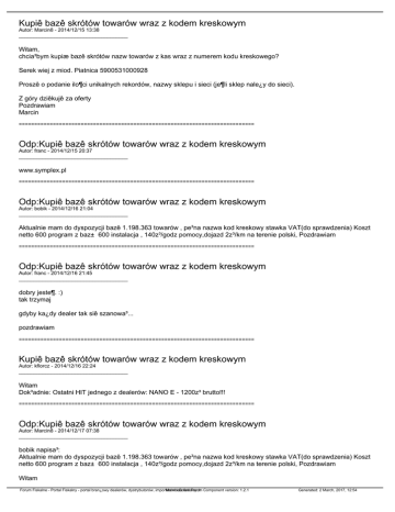 Kupiê bazê skrótów towarów wraz z kodem kreskowym Autor: Marcin8 - 2014/12/15 13:38 _____________________________________ Witam, chcia³bym kupiæ bazê skrótów nazw towarów z kas wraz z numerem kodu kreskowego? Serek wiej z miod. Piatnica 5900531000928 Proszê o podanie ilo¶ci unikalnych rekordów, nazwy sklepu i sieci (je¶li sklep nale¿y do sieci). Z góry dziêkujê za oferty Pozdrawiam Marcin ============================================================================ Odp:Kupiê bazê skrótów towarów wraz z kodem kreskowym Autor: franc - 2014/12/15 20:37 _____________________________________ www.symplex.pl ============================================================================ Odp:Kupiê bazê skrótów towarów wraz z kodem kreskowym Autor: bobik - 2014/12/16 21:04 _____________________________________ Aktualnie mam do dyspozycji bazê 1.198.363 towarów , pe³na nazwa kod kreskowy stawka VAT(do sprawdzenia) Koszt netto 600 program z baz± 600 instalacja , 140z³/godz pomocy,dojazd 2z³/km na terenie polski, Pozdrawiam ============================================================================ Odp:Kupiê bazê skrótów towarów wraz z kodem kreskowym Autor: franc - 2014/12/16 21:45 _____________________________________ dobry jeste¶. :) tak trzymaj gdyby ka¿dy dealer tak siê szanowa³... pozdrawiam ============================================================================ Kupiê bazê skrótów towarów wraz z kodem kreskowym Autor: kflorcz - 2014/12/16 22:24 _____________________________________ Witam Dok³adnie: Ostatni HIT jednego z dealerów: NANO E - 1200z³ brutto!!! ============================================================================ Odp:Kupiê bazê skrótów towarów wraz z kodem kreskowym Autor: Marcin8 - 2014/12/17 07:38 _____________________________________ bobik napisa³: Aktualnie mam do dyspozycji bazê 1.198.363 towarów , pe³na nazwa kod kreskowy stawka VAT(do sprawdzenia) Koszt netto 600 program z baz± 600 instalacja , 140z³/godz pomocy,dojazd 2z³/km na terenie polski, Pozdrawiam Witam Forum Fiskalne - Portal Fiskalny - portal bran¿owy dealerów, dystrybutorów, importerów MamboBoard kas fiskalnych Forum Component version: 1.2.1 Generated: 2 March, 2017, 12:54 interesuje mnie tylko baza np. w excelu (nazwa towaru + kod kreskowy+ ew. skrót nazwy z kasy fiskalnej; stawka VAT nie jest mi tak bardzo potrzebna, ale mo¿e byæ). Nie potrzebuje ¿adnego programu ksiêgowego. Jaki by³by koszt samej takiej bazy? Posiadam ju¿ bazê z kilkudziesiêcioma tysi±cami indeksów (dosta³em je prawie za darmo) i nie chcia³bym p³aciæ dwa razy za to samo. Proszê o podanie ceny za sam± bazê + informacjê jakich kategorii dotycz± produkty (np. spo¿ywcze, przemys³owe, chemia, kosmetyki, itp.). Pozdrawiam Marcin ============================================================================ Odp:Kupiê bazê skrótów towarów wraz z kodem kreskowym Autor: Marcin8 - 2014/12/17 07:55 _____________________________________ Symplex.pl? a jakie oni dok³adnie maj± dane, bo na stronie jest tylko, ¿e ponad milion? przyznam, ¿e jak zainstalowa³em sobie demo, to znalaz³em tylko jeden produkt z numerem kreskowym i nazw±... reszta to same nazwy z jakimi¶ nr wewnêtrznymi....wzi±³em pierwszy lepszy d¿em, wpisa³em kod kreskowy i mi nie znalaz³... jeste¶ przedstawicielem tej firmy? móg³by¶ wkleiæ przyk³ad kilku indeksów, jak wygl±da ta baza i czy mo¿na j± ca³± pobraæ z programu, bo sam plik "slownik" to szlaczki w notatniku... ? dziêki pozdr. Marcin ============================================================================ Odp.: Nano za 1200 brutto Autor: leff - 2014/12/17 14:10 _____________________________________ :ohmy: nied³ugo majtki bêd± ¶ci±gaæ przed klientem, za 50 z³ zysku na kasie, us³ugi oczywi¶cie gratis szkoda gadaæ :-( nic siê ludzie nie szanuj±, siebie, swojej wiedzy itp. a jak facet do naprawy pralki czy junkersa przyjdzie to 100 z³ krzyczy na dzieñ dobry, zanim siê ubrudzi, o lekarzu, prawniku czy denty¶cie nie wspomnê ============================================================================ Odp:Kupiê bazê skrótów towarów wraz z kodem kreskowym Autor: opticom - 2014/12/17 14:49 _____________________________________ zg³osiæ do Novitus-a takiego .... ============================================================================ Odp:Kupiê bazê skrótów towarów wraz z kodem kreskowym Autor: MaKo - 2014/12/17 15:05 _____________________________________ Dajcie ch³opakowi spokój. W notatniku ma szlaczki, bo ¶ci±gn±³ chiñsk± wersjê :woohoo: To ciekawostka ludzie siê bior± z jak±¶ robotê, a maj± lenia giganta. Na stronie gdzie jest informacja o ponad milionie Forum Fiskalne - Portal Fiskalny - portal bran¿owy dealerów, dystrybutorów, importerów MamboBoard kas fiskalnych Forum Component version: 1.2.1 Generated: 2 March, 2017, 12:54 indeksów jest link do strony z opisem instalacji s³ownika. Marcin8 robisz co¶ komu¶, albo sobie, to w³ó¿ w to choæ troszkê wysi³ku. ============================================================================ Odp:Kupiê bazê skrótów towarów wraz z kodem kreskowym Autor: Marcin8 - 2014/12/17 18:58 _____________________________________ MaKo napisa³: Dajcie ch³opakowi spokój. W notatniku ma szlaczki, bo ¶ci±gn±³ chiñsk± wersjê :woohoo: To ciekawostka ludzie siê bior± z jak±¶ robotê, a maj± lenia giganta. Na stronie gdzie jest informacja o ponad milionie indeksów jest link do strony z opisem instalacji s³ownika. Marcin8 robisz co¶ komu¶, albo sobie, to w³ó¿ w to choæ troszkê wysi³ku. Witam, dziêkujê za wszystkie bardziej i mniej celne komentarze. Jak napisa³em ¶ci±gn±³em wersjê demo ze strony i nie mo¿na zainstalowaæ tam s³ownika, którego plik jest na stronie. Widocznie w wersji demo to ograniczyli. w jakim celu zg³osiæ do Novitusa? chcia³bym kupiæ konkretne dane, które nie s± tajemnic± hand
