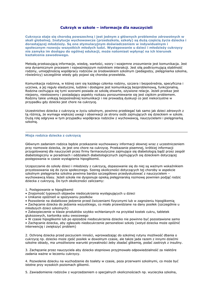 Cukrzyk w szkole – informacje dla nauczycieli Cukrzyca staje się chorobą powszechną i jest jednym z głównych problemów zdrowotnych w skali globalnej. Instytucje wychowawcze (przedszkola, szkoły) są duŜą częścią Ŝycia dziecka i dorastającej młodzieŜy. Są one stymulacyjnym doświadczeniem w indywidualnym i społecznym rozwoju wszystkich młodych ludzi. Występowanie u dzieci i młodzieŜy cukrzycy nie zamyka im dostępu do ogólnej edukacji, moŜe natomiast wpłynąć na ich kierunek kształcenia zawodowego. Metodą przekazującą informacje, wiedzę, wartości, wzory i wzajemne zrozumienie jest komunikacja. Jest ona dynamicznym procesem i najwaŜniejszym nośnikiem interakcji. Jest siłą podtrzymującą stabilność rodziny, umiejętnością współpracy rodziców ze środowiskiem szkolnym (pedagodzy, pielęgniarka szkolna, rówieśnicy) szczególnie wtedy gdy pojawi się choroba przewlekła. Komunikacja rodzinna, w której ceni się kaŜdego członka rodziny, szczera i bezpośrednia, specyficzna i uczciwa, a jej reguły elastyczne, ludzkie i dostępne jest komunikacją bezproblemową, funkcjonalną. Rodzina cechująca się tymi wzorami posiada ze szkołą otwarte, oŜywione relacje. JeŜeli przekaz jest niejasny, niestosowny i posiadający aspekty rozkazu porozumiewanie się jest cięŜkim problemem. Rodziny takie unikają bezpośredniej komunikacji i nie prowadzą dyskusji co jest niekorzystne w przypadku gdy dziecko jest chore na cukrzycę. Uczestnictwo dziecka z cukrzycą w Ŝyciu szkolnym, powinno przebiegać tak samo jak dzieci zdrowych z tą róŜnicą, Ŝe wymaga większej uwagi i obserwacji ze strony osób zajmujących się dzieckiem w szkole. DuŜą rolę odgrywa w tym przypadku współpraca rodziców z wychowawcą, nauczycielami i pielęgniarką szkolną. Misja rodzica dziecka z cukrzycą Głównym zadaniem rodzica będzie przekazanie wychowawcy informacji słownej wraz z uczestniczeniem przy rozmowie dziecka, Ŝe jest ono chore na cukrzycę. Przekazanie pisemnej, krótkiej informacji przygotowanej dla nauczycieli przez firmy farmaceutyczne zajmujące się diabetologią bądź przez zespół diabetologiczny w poradniach i oddziałach diabetologicznych zajmujących się dzieckiem dotyczącej postępowania w czasie wystąpienia hipoglikemii. Uczęszczanie do szkoły dzieci i młodzieŜy z cukrzycą, dopasowanie się do niej są waŜnym wskaźnikiem przystosowania się do Ŝycia społecznego. Szereg okoliczności dotyczących tej choroby w aspekcie szkolnym pielęgniarka szkolna powinna bardzo szczegółowo przedyskutować z nauczycielem – wychowawcą klasy. JeŜeli szkoła nie dysponuje opieką pielęgniarską rozmowę powinien podjąć rodzic dziecka z cukrzycą. Do tych okoliczności zaliczamy: 1. Postępowanie w hipoglikemii • Znajomość typowych objawów niedocukrzenia występujących u dzieci • Unikanie opóźnień w spoŜywaniu posiłków • Pozwolenie na dodatkowe jedzenie przed ćwiczeniami fizycznymi lub w zagroŜeniu hipoglikemią • Zachęcanie dziecka do jedzenia wszystkiego, co miało przewidziane na dany posiłek (szczególnie u młodszych dzieci szkolnych) • Zabezpieczenie w klasie produktów szybko wchłanianych na przykład kostek cukru, tabletek glukozowych, kartonika soku owocowego • W czasie hipoglikemii lub po epizodzie niedocukrzenia dziecko nie powinno być pozostawione samo • Zachęcanie dziecka, aby zgłaszało niedocukrzenie personelowi szkoły (wstyd dziecka moŜe opóźnić interwencję i zwiększyć problem) 2. Ochronę dziecka przed poczuciem inności, wprowadzając do szkolnej rutyny moŜliwość dbania o cukrzycę np. dziecko moŜe zjeść posiłek w dowolnym czasie, ale takŜe jada razem z innymi dziećmi szkolne obiady, ma umoŜliwione warunki prywatności Ŝeby zbadać glikemię, podać zastrzyk z insuliny. 3. Zachęcanie przez nauczyciela aby dziecko stopniowo przyjmowało odpowiedzialność za niektóre zadania waŜne w leczeniu cukrzycy. 4. Pozwolenie dziecku na wychodzenie do toalety w czasie, poza przerwami szkolnymi, co moŜe być istotne przy wysokich poziomach glikemii. 5. Zawiadomienie rodziców z wyprzedzeniem o specjalnych okolicznościach np. wycieczka szkolna, zawody sportowe. 6. Informowanie o tym, Ŝe cukrzyca nie ogranicza potencjału intelektualnego dziecka, chociaŜ jego wykorzystanie moŜe być utrudnione. 7. Zachęcanie do pełnego udziału we wszystkich przejawach Ŝycia społecznego, sportowego i naukowego. Zdrowotne działania pielęgniarki szkolnej wobec ucznia, grupy uczniów z cukrzycą powinny koncentrować się na: 1. Obserwacji: • Rozwoju fizycznego (prawidłowa masa ciała względem wzrostu) • Właściwego odŜywiania opartego na przeliczaniu węglowodanów w danym produkcie (zapobiegania otyłości) • Regularnego wysiłku fizycznego (uczestniczenie w zajęciach wychowania fizycznego) • Higieny ciała, pielęgnacji jamy ustnej • Występowania powikłań ostrych zagraŜających Ŝyciu i późnych prowadzących do kalectwa 2. Rozmowie indywidualnej z chorym uczniem lub grupą uczniów na temat: • Samokontroli choroby • Zapobiegania ostrym i późnym powikłaniom cukrzycy • Szkodliwości palenia tytoniu, picia alkoholu, brania narkotyków • Funkcjonowania w grupie • Relacji uczeń – nauczyciel 3. Przeprowadzeniu lekcji informacyjnej z zakresu istoty choroby w klasach do których uczęszczają uczniowie z cukrzycą: • Podanie informacji o udzieleniu pierwszej pomocy w chwili wystąpienia cięŜkiego niedocukrzenia (pokaz podania glukagonu) • Zapoznanie uczniów ze sprzętem do podawania insuliny (wstrzykiwacze typu pen, osobiste podskórne pompy insulinowe) • Wykonanie uczniom pomiaru glikemii na gleukometrze 4. Przekazaniu informacji o chorobie radzie pedagogicznej: • Przeprowadzenie szkolenia z zakresu istoty choroby, leczenia, samokontroli • Dokładne omówienie zagroŜeń związanych z chorobą, które mogą wystąpić w szkole np. hipoglikemia • 