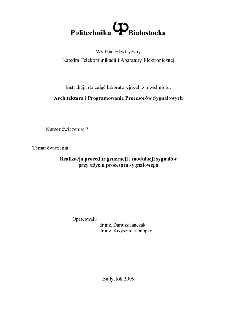Politechnika Białostocka Wydział Elektryczny Katedra Telekomunikacji i Aparatury Elektronicznej Instrukcja do zajęć laboratoryjnych z przedmiotu: Architektura i Programowanie Procesorów Sygnałowych Numer ćwiczenia: 7 Temat ćwiczenia: Realizacja procedur generacji i modulacji sygnałów przy użyciu procesora sygnałowego Opracowali: dr inż. Dariusz Jańczak dr inż. Krzysztof Konopko Białystok 2009 Architektura i Programowanie Procesorów Sygnałowych Temat: Realizacja procedur generacji i modulacji sygnałów przy użyciu procesora sygnałowego 1. Cel ćwiczenia Celem ćwiczenia jest zapoznanie z zasadami współpracy procesora sygnałowego z układami wejścia/wyjścia oraz zasadami współpracy z przetwornikami A/C i C/A. Ćwiczenie przeprowadzane jest na module DSK TMS320C6711 w oparciu o dostępne w module przetworniki oraz o współpracującą z DSK kartę TMDX326040A. W ramach zajęć realizowane są podstawowe procedury generacji sygnałów metodami algorytmicznymi i tablicowymi oraz modulacja AM. 2. Zagadnienie do opracowania przed przystąpieniem do zajęć Przed przystąpieniem do zajęć należy opracować następujące zagadnienia: ♦ metody generacji sygnałów w systemach DSP, ♦ modulacja AM, ♦ zasady współpracy procesora DSP z przetwornikami A/C i C/A, ♦ wykorzystanie timera i systemu przerwań w zadaniach przetwarzania sygnałów, ♦ współpracy karty TMDX326040A z DSK (SPRA711, SPRA595), ♦ zapoznać się ze specyfikacją układu kodeka audio PCM 3003. 3. Przebieg ćwiczenia 3.1 Generacja przebiegu sinusoidalnego metodą tablicową Napisać program generujący sygnał sinusoidalny metodą syntezy tablicowej. Podstawą tej metody jest tablica zawierająca N próbek jednego okresu funkcji sinus. skok fazy Σ Akumulator o pojemności N Tablica C/A Wyjście Rys. 1 Układ generatora z akumulatorem fazy W każdym okresie próbkowania następuje dodanie do poprzedniej fazy (stanu akumulatora) kroku fazy k i wysłanie na wyjście próbki o fazie (numerze w tablicy) równej uzyskanej sumie. Dodawanie odbywa się modulo N, a więc po dojściu do końca tablicy następuje powrót na jej początek (można wykorzystać adresowanie kołowe). Podstawowa częstotliwość uzyskanego w ten sposób przebiegu wynosi: FWY = k * FS N 0 < k < N/2 W ogólnym przypadku skok fazy k nie musi być liczbą całkowitą. W takiej sytuacji wysyłana jest próbka o numerze równym całkowitej części aktualnej fazy. Spowoduje to nieznaczny wzrost zawartości harmonicznych, ale uzyskujemy większą rozdzielczość generowanych częstotliwości, która wynosi: Δ FWY = Δk * FS N Plik ze zdefiniowanymi N próbkami sinusa (w obu kanałach) można wygenerować w Matlabie programem gen_sin(‘sinus.dat’,N), a wynikowy plik sinus.dat można dołączyć do programu asemblerowego dyrektywą .include. Algorytm pracy programu generatora należy oprzeć na adresowaniu w trybie cyrkularnym. Synchronizacja okresu próbkowania przy wykorzystaniu przerwania od odbiornika portu szeregowego. 3.2 Generacja przebiegów okresowych: Napisać program generacji wybranego sygnału np: prostokątny, piłokształtny, trójkątny, Częstotliwość sygnału 500Hz. Kolejne próbki synchronizować przez timer. 3.3 Modulator amplitudowy Zmodyfikować napisany w punkcie 3.1 program tak, aby generowana sinusoida była modulowana amplitudowo sygnałem z przetwornika A/C. W tym celu w każdym cyklu próbkowania należy: - pomnożyć próbkę wejściową przez współczynnik głębokości modulacji, - do otrzymanego iloczynu dodać jedynkę, - uzyskaną sumę przemnożyć przez aktualną wartość nośnej, - rezultat wysłać do przetwornika C/A. 3.4 Generacja przebiegu sinusoidalnego metodą algorytmiczną Napisać i uruchomić program generujący sygnał sinusoidalny metodą algorytmiczną. W tym celu można wykorzystać równanie różnicowe opisujące filtr, którego odpowiedź impulsowa będzie miała formę oscylacji niegasnących. Realizacja ćwiczeń Badania eksperymentalne należy przeprowadzić w układzie połączonym według poniższego schematu. moduł DSK JTAG A/C We DSP oscyloskop C/A Wy Y1 Y2 generator Wy Rys. 2. Schemat połączeń stanowiska laboratoryjnego DSP 4. Sprawozdanie powinno zawierać: - kody źródłowe wraz z opisem, - wyniki działania procedur, - analizę kodów źródłowych stosowanych procedur, - uwagi i wnioski nasuwające się w trakcie wykonywania ćwiczenia. 5. Wymagania BHP W trakcie realizacji programu ćwiczenia należy przestrzegać zasad omówionych we wstępie do ćwiczeń, zawartych w: „Regulaminie porządkowym w laboratorium” oraz w „Instrukcji obsługi urządzeń elektronicznych znajdujących się w laboratorium z uwzględnieniem przepisów BHP”. Regulamin i instrukcja są dostępne w pomieszczeniu laboratoryjnym w widocznym miejscu. 6. Literatura 1. Dąbrowski A. (red.) „Przetwarzanie Sygnałów Przy użyciu Procesorów Sygnałowych”, Wyd. Politechniki Poznańskiej, Poznań 2000 2. Kehtarnavaz, N., “Real-Time Digital Signal Processing: Based on the TMS320C6000”, Newnes, 2005 3. “TMS320C6000 CPU and Instruction Set Reference Guide”, Texas Instruments, 2001 4. “TMS320C6000 Peripherals Reference Guide”, Texas Instruments, 2001 5. “TMS320C6000 Programmer's Guide”, Texas Instruments, 2001
