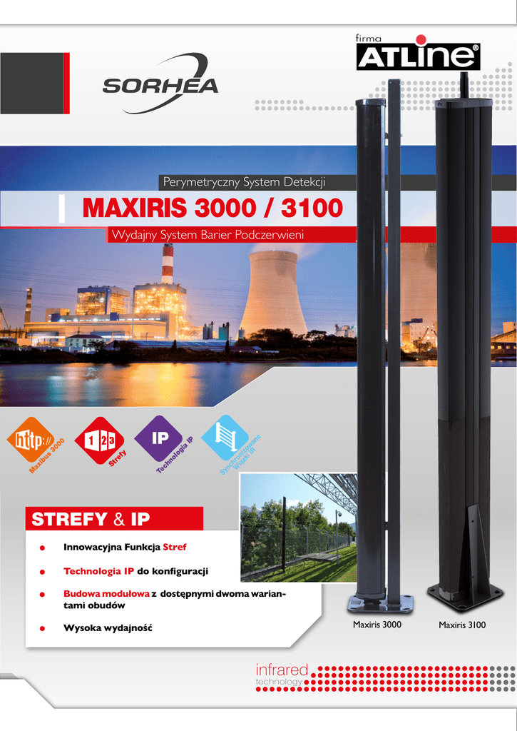 Perymetryczny System Detekcji MAXIRIS 3000 / 3100 ol a IP nc W hro ią ni zk zo iI w R a Te n ch i og Sy fy s re bu IP 00 St M i ax 30 ne Te c hn ol og ia Wydajny System Barier Podczerwieni STREFY & IP Innowacyjna Funkcja Stref Technologia IP do konfiguracji Budowa modułowa z dostępnymi dwoma wariantami obudów Maxiris 3000 Wysoka wydajność infrared technology Maxiris 3100 Modułowa Budowa Bariery podczerwieni MAXIRIS 3000/3100 oferowane są w dwóch wersjach obudowy, które można dostosować do potrzeb. MAXIRIS 3000 Rama Maxiris 2000 Jednostronna kolumna Do 36 wiązek na kierunek Strefy: od 4 do 10 modułów na kolumnę (przekrój po lewej) Różne wysokości kolumn: JS: Jednostronna kolumna DS: Dwustronna kolumna BJ: Bariera jednokierunkowa BD: Bariera dwukierunkowa JS / BJ Maxiris 3000 JS / BJ Maxiris 3000 JS / BD JS / BD 1,10 m 8 Wiązek - 1,90 m 18 Wiązek 8 Wiązek 2,50 m 24 Wiązki 12 Wiązek 3m 32 Wiązki 14 Wiązek 3,80 m 36 Wiązek 18 Wiązek 120mm 110mm 110mm 120mm Wiązki w danym kierunku 110 Va MAXIRIS 3100 Rama Maxiris III Jedno- i dwustronna kolumna Duża gęstośc wiązek: maks. 64 wiązki w 3m kolumnie w dwóch kierunkach Strefy: od 4 do 10 modułów w kolumnie (przekrój po lewej) Różne wysokości kolumn: R 230 V x /Tx Maxiris 3100 JS / BJ Maxiris 3100 JS / BD Pa Kon nel troln y 110 Vac / 60Hz Maxiris 3100 DS / BD MA X I BUS 300 0 Po Świa ł t 230 Vac / 50Hz ET Wiązki na kierunek 120mm 160mm 120mm 160mm 250mm 120mm JS / BJ JS / BD 1m 6 Wiązek - DS / BD 6 Wiązek 2m 20 Wiązek 10 Wiązek 20 Wiązek 2,50 m 24 Wiązki 12 Wiązek 24 Wiązki 3m 32 Wiązki 14 Wiązek 32 Wiązki Wydajna Podczerwień Mieszane moduły Nadawczo/Odbiorcze Pojedyncza/Podwójna/Potrójna Detekcja Kontrola dolnych wiązek Detekcja kierowana do następnych wiązek w razie przerwania strefy s 1 trefa s 2 trefa Funkcja STREF strefa 3 Do 3 stref detekcji o różnej długości Zoptymalizowana kontrola kamer Rx /Tx Rx /Tx ac / 60Hz Okablowanie - 1 para kabli synchronizowanych (700m max. na barierę) - 1 para kabli RS485 (1200m max. na sieć) Vac / 50Hz 110 Vac / 60Hz 230 Vac / 50Hz Rx /Tx 110 Vac / 60Hz ołąc ze tłow nie odo we 230 Vac / 50Hz Adm inis trat or THE Rx /Tx RNE T I TCP GSM /IP 110 Vac / 60Hz WiF i Zda lny PC 230 Vac / 50Hz Maxibus 3000: Technologia IP PC kon do figu rac ji Rx /Tx 110 Vac / 60Hz 230 Vac / 50Hz System MAXIBUS 3000 jest wyposażony w złącze Ethernet. Bezpieczny system operacyjny Linux zapewnia szybkość oraz łatwość użytkowania. Każdy system może być konfigurowany lokalnie lub zdalnie dzięki zintegrowanemu serwerowi sieciowemu. 4 porty komunikacyjne mogące obsłużyć do 128 kolumn MAXIRIS (4 x 32 kolumny) Zgodność z systemami nadzoru wizyjnego Milestone i Genetec Zdalna konfiguracja i rejestr alarmów Graficzny podgląd kolumn on-line SPECYFIKACJA TECHNICZNA MAXIRIS 3000 MAXIRIS 3100 Maksymalny zasięg wewnątrz budynku 500 m Maksymalny zasięg na zewnątrz, niezależnie od warunków pogodowych 100 m 1,1 m Wysokość kolumn 2m 2,5 m 3m 3,8 m 1m 2m 2,5 m 3m Strefy Do 3 stref (długości mogą być ustawione) Protokoły komunikacyjne i wyjścia KOLUMNA: RS 485 zgodne z MAXIBUS 3000; MAXIBUS 3000: Ethernet (RJ45 w każdej kolumnie) zgodne z serwerem/klientem ModBus TCP; styki bezpotencjałowe: od 8 do 136 przekaźników na koncentrator Zasilanie 110 Vac/230 Vac - 60 Hz/50Hz Wskaźniki ustawienia Brzęczyk i diody LED w każdej kolumnie Temperatura pracy Od -40°C do +70°C - Grzejnik z termostatem w każdej kolumnie Kompatybilność elektromagnetyczna Zgodność ze standardami UE (Certyfikacja CE) Narzędzia do konfiguracji • Zintegrowany serwer www w każdej kolumnie • Zintegrowany serwer www w systemie MAXIBUS 3000: zdalny dostęp przez połączenie internetowe Funkcje serwera HTML • Ochrona hasłem • Przeglądanie/zmiana parametrów • Przeglądanie historii zdarzeń i stanu bariery Przykładowa Konfiguracja Przykład z 5 kolumnami, 2,5 m, 4 komórki, zamknięta sieć, 3 strefy detekcji na kolumnę Rx /Tx STR EFA 1 STR EFA 2 STR EFA Rx /Tx MAX IBU S 30 00 3 Rx /Tx 2,5 m Rx /Tx Rx /Tx MAXIRIS 3000 MAXIRIS 3100 Kolumny 5 x Kolumna 2,50m (8,2 stóp) JS/BD 6E/6R - Ref.: 30700306 5 x Kolumna 2,50m (8,2 stóp) DS/BD 6E/6R - Ref.: 30701308 Gniazdka 5 x Słup 2,50m - Ref.: 35205200 5 x Gniazdko podłogowe - Ref.: 30580001 Wymagane elementy Koncentrator 1 x Uniwersalny koncentrator MAXIBUS 3000 - Ref.: 40670006 Karty rozszerzeniowe 3 x Karta rozszerzeniowa - Ref.: 35588419 Opcje Dodatkowa bateria 5 x Ref.: 35145000 Pokrywa anty-wspinaczkowa Ochraniacz kabla 5 x CAA 360° - Ref.: 35180300 Zintegrowana 5 x Ochraniacz kabla - Ref.: 35172805 Zawarty w ramie Firma ATLine sp.j. Sławomir Pruski ul. Franciszkańska 125, 91-845 Łódź Tel: +48 42 236 30 19 Fax: +48 42 655 20 99 E-mail: [email protected] NIP: 725 001 43 43 1 rue du Dauphiné - 69120 VAULX-EN-VELIN - FRANCJA Tél. : +33(0)4 78 03 06 10 Fax : +33(0)4 78 68 24 61 e-mail : [email protected] www.sorhea.com www.atline.pl NC217-EN V2.2 01.16 Pieczęć sprzedawcy Na życzenie firma SORHEA oraz firma ATLine dostarczą Państwu szczegółową specyfikację produktu. W celu zapewnienia jak najlepszej jakości oraz wydajności naszych produktów, zastrzegamy prawo do modyfikacji przedstawionych danych technicznych bez wcześniejszego powiadomienia.