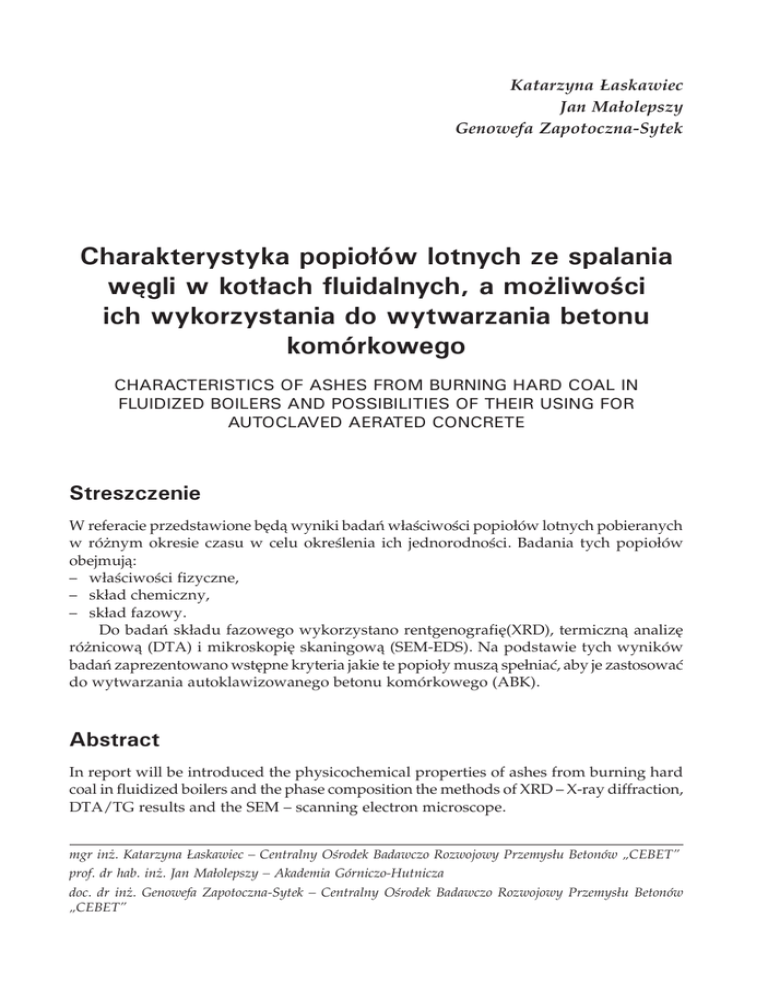 Katarzyna Łaskawiec Jan Małolepszy Genowefa Zapotoczna-Sytek Charakterystyka popiołów lotnych ze spalania węgli w kotłach fluidalnych, a możliwości ich wykorzystania do wytwarzania betonu komórkowego Characteristics of ashes from burning hard coal in fluidized boilers and possibilities of their using for autoclaved aerated concrete Streszczenie W referacie przedstawione będą wyniki badań właściwości popiołów lotnych pobieranych w różnym okresie czasu w celu określenia ich jednorodności. Badania tych popiołów obejmują: –– właściwości fizyczne, –– skład chemiczny, –– skład fazowy. Do badań składu fazowego wykorzystano rentgenografię(XRD), termiczną analizę różnicową (DTA) i mikroskopię skaningową (SEM-EDS). Na podstawie tych wyników badań zaprezentowano wstępne kryteria jakie te popioły muszą spełniać, aby je zastosować do wytwarzania autoklawizowanego betonu komórkowego (ABK). Abstract In report will be introduced the physicochemical properties of ashes from burning hard coal in fluidized boilers and the phase composition the methods of XRD – X-ray diffraction, DTA/TG results and the SEM – scanning electron microscope. mgr inż. Katarzyna Łaskawiec – Centralny Ośrodek Badawczo Rozwojowy Przemysłu Betonów „CEBET” prof. dr hab. inż. Jan Małolepszy – Akademia Górniczo-Hutnicza doc. dr inż. Genowefa Zapotoczna-Sytek – Centralny Ośrodek Badawczo Rozwojowy Przemysłu Betonów „CEBET” The time variations of propriety of ashes will be presented. These examinations will serve for working out preliminary compositions of the autoclaved aerated concrete.