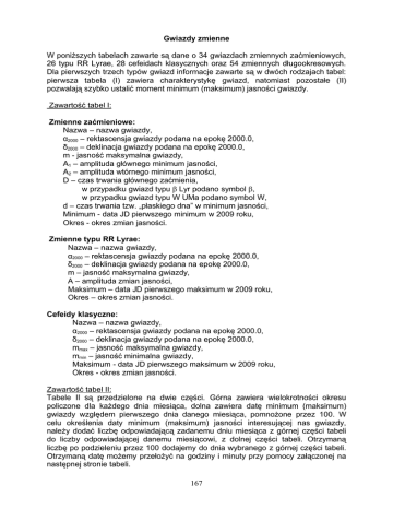 Gwiazdy zmienne W poniższych tabelach zawarte są dane o 34 gwiazdach zmiennych zaćmieniowych, 26 typu RR Lyrae, 28 cefeidach klasycznych oraz 54 zmiennych długookresowych. Dla pierwszych trzech typów gwiazd informacje zawarte są w dwóch rodzajach tabel: pierwsza tabela (I) zawiera charakterystykę gwiazd, natomiast pozostałe (II) pozwalają szybko ustalić moment minimum (maksimum) jasności gwiazdy. Zawartość tabel I: Zmienne zaćmieniowe: Nazwa – nazwa gwiazdy, α2000 – rektascensja gwiazdy podana na epokę 2000.0, δ2000 – deklinacja gwiazdy podana na epokę 2000.0, m - jasność maksymalna gwiazdy, A1 – amplituda głównego minimum jasności, A2 – amplituda wtórnego minimum jasności, D – czas trwania głównego zaćmienia, w przypadku gwiazd typu β Lyr podano symbol β, w przypadku gwiazd typu W UMa podano symbol W, d – czas trwania tzw. „płaskiego dna” w minimum jasności, Minimum - data JD pierwszego minimum w 2009 roku, Okres - okres zmian jasności. Zmienne typu RR Lyrae: Nazwa – nazwa gwiazdy, α2000 – rektascensja gwiazdy podana na epokę 2000.0, δ2000 – deklinacja gwiazdy podana na epokę 2000.0, m – jasność maksymalna gwiazdy, A – amplituda zmian jasności, Maksimum – data JD pierwszego maksimum w 2009 roku, Okres – okres zmian jasności. Cefeidy klasyczne: Nazwa – nazwa gwiazdy, α2000 – rektascensja gwiazdy podana na epokę 2000.0, δ2000 – deklinacja gwiazdy podana na epokę 2000.0, mmax – jasność maksymalna gwiazdy, mmin – jasność minimalna gwiazdy, Maksimum - data JD pierwszego maksimum w 2009 roku, Okres - okres zmian jasności. Zawartość tabel II: Tabele II są przedzielone na dwie części. Górna zawiera wielokrotności okresu policzone dla każdego dnia miesiąca, dolna zawiera datę minimum (maksimum) gwiazdy względem pierwszego dnia danego miesiąca, pomnożone przez 100. W celu określenia daty minimum (maksimum) jasności interesującej nas gwiazdy, należy dodać liczbę odpowiadającą zadanemu dniu miesiąca z górnej części tabeli do liczby odpowiadającej danemu miesiącowi, z dolnej części tabeli. Otrzymaną liczbę po podzieleniu przez 100 dodajemy do dnia wybranego z górnej części tabeli. Otrzymaną datę możemy przełożyć na godziny i minuty przy pomocy załączonej na następnej stronie tabeli. 167 Dla zmiennych długookresowych podano daty kalendarzowe wszystkich maksimów w 2009 roku. Wszystkie momenty podane są w czasie Greenwich (UT). Obserwacje zmiennych krótkookresowych należy rozpoczynać na kilka godzin przed obliczonym momentem, dla Miryd - co najmniej miesiąc wcześniej. Schemat podawania minimów (maksimów) gwiazd zmiennych krótkookresowych został zaczerpnięty z nie wydawanego już obecnie "Rocznika Astronomicznego Obserwatorium Krakowskiego". W celu wyznaczenia momentów minimów gwiazd zmiennych zaćmieniowych wykorzystano elementy tych gwiazd, przygotowane przez 6 prof. J. M. Kreinera , zamieszczone na stronie http://www.as.ap.krakow.pl/ephem/. W związku z tym, że okresy tego rodzaju gwiazd zmiennych ulegają systematycznym zmianom, efemerydy niektórych z nich, zamieszczone w niniejszym Kalendarzu, mogą być obarczone niewielkim błędem. Obserwator zainteresowany tego typu obserwacjami może sprawdzić daty minimów interesujących go gwiazd właśnie na podanej stronie. Przy opracowywaniu efemerydy gwiazd zmiennych długookresowych wykorzystano dane AAVSO. Wybór gwiazd został dokonany przez członków Sekcji Obserwatorów Gwiazd Zmiennych PTMA. Zamiana ułamków doby na godziny i minuty 6 0.00 0.01 0.02 0.03 0.04 0.05 0.06 0.07 0.08 0.09 0.00 0h00m 0h14m 0h29m 0h43m 0h58m 1h12m. 1h26m. 1h41m. 1h55m 2h10m 0.00 0.10 2h24m 2h38m 2h53m 3h07m 3h22m 3h36m 3h50m 4h05m 4h19m 4h34m 0.10 0.20 4h48m 5h02m 5h17m 5h31m 5h46m 6h00m 6h14m 6h29m 6h43m 6h58m 0.20 0.30 7h12m 7h26m 7h41m 7h55m 8h10m 8h24m 8h38m 8h53m 9h07m 9h22m 0.30 0.40 9h36m 9h50m 10h05m 10h19m 10h34m 10h48m 11h02m 11h17m 11h31m 11h46m 0.40 0.50 12h00m 12h14m 12h29m 12h43m 12h58m 13h12m 13h26m 13h41m 13h55m 14h10m 0.50 0.60 14h24m 14h38m 14h53m 15h07m 15h22m 15h36m 15h50m 16h05m 16h19m 16h34m 0.60 0.70 16h48m 17h02m 17h17m 17h31m 17h46m 18h00m 18h14m 18h29m 18h43m 18h58m 0.70 0.80 19h12m 19h26m 19h41m 19h55m 20h10m 20h24m 20h38m 20h53m 21h07m 21h22m 0.80 0.90 21h36m 21h50m 22h05m 22h19m 22h34m 22h48m 23h02m 23h17m 23h31m 23h46m 0.90 0.00 0.01 0.02 0.03 0.04 0.05 0.06 0.07 0.08 0.09 J.M. Kreiner, 2004, Acta Astronomica, vol. 54, pp 207-210 168