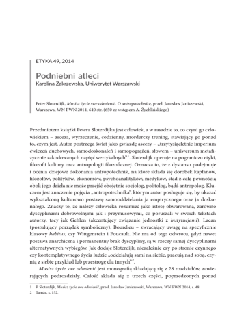 ETYKA 49, 2014 Podniebni atleci Karolina Zakrzewska, Uniwerytet Warszawski Peter Sloterdijk, Musisz życie swe odmienić. O antropotechnice, przeł. Jarosław Janiszewski, Warszawa, WN PWN 2014, 640 str. (650 ze wstępem A. Żychlińskiego) Przedmiotem książki Petera Sloterdijka jest człowiek, a w zasadzie to, co czyni go człowiekiem – asceza, wyrzeczenie, codzienny, morderczy trening, stawiający go ponad to, czym jest. Autor postrzega świat jako gwiazdę ascezy – „trzytysiącletnie imperium ćwiczeń duchowych, samodoskonaleń i samopogrążeń, słowem – uniwersum metafizycznie zakodowanych napięć wertykalnych”1. Sloterdijk operuje na pograniczu etyki, filozofii kultury oraz antropologii filozoficznej. Oznacza to, że z dystansu podejmuje i ocenia dziejowe dokonania antropotechnik, na które składa się dorobek kapłanów, filozofów, polityków, ekonomów, psychoanalityków, medyków, stąd z całą pewnością obok jego dzieła nie może przejść obojętnie socjolog, politolog, bądź antropolog. Kluczem jest znaczenie pojęcia „antropotechnika”, którym autor posługuje się, by ukazać wykształconą kulturowo postawę samooddzielania ja empirycznego oraz ja doskonałego. Znaczy to, że należy człowieka rozumieć jako istotę obwarowaną, zarówno dyscyplinami dobrowolnymi jak i przymusowymi, co poruszali w swoich tekstach autorzy, tacy jak Gehlen (akcentujący związanie jednostki z instytucjami), Lacan (postulujący porządek symboliczny), Bourdieu – zwracający uwagę na specyficznie klasowy habitus, czy Wittgenstein i Foucault. Nie ma od tego odwrotu, gdyż nawet postawa anarchiczna i permanentny brak dyscypliny, są w rzeczy samej dyscyplinami alternatywnych wybiegów. Jak dodaje Sloterdijk, niezależnie czy po stronie czynnego czy kontemplatywnego życia ludzie „oddziałują sami na siebie, pracują nad sobą, czynią z siebie przykład lub przestrogę dla innych”2. Musisz życie swe odmienić jest monografią składającą się z 28 rozdziałów, zawierających podrozdziały. Całość składa się z trzech części, poprzedzonych ponad 1 P. Sloterdijk, Musisz życie swe odmienić, przeł. Jarosław Janiszewski, Warszawa, WN PWN 2014, s. 48. 2 Tamże, s. 152. RECENZJE: PODNIEBNI ATLECI 113 stustronicowym Wstępem, wprowadzającym czytelnika w Sloterdijkowską narrację, w obrębie której ludzki świat wyciosany został nadludzkim wysiłkiem opływających potem atletów, próbujących sięgnąć gwieździstego nieba nad nimi. Za motto pierwszej części można przyjąć zdanie: „to nie wyprostowany chód czyni człowieka człowiekiem, lecz rodząca się świadomość wewnętrznego rozdźwięku między górą a dołem”3. Sloterdijk nie bez powodu powołuje się na „genialnego” Nietzschego, który niezwykle trafnie rozpoznał wymagania etyczne, jakie należy postawić przed człowiekiem: mianowicie zadania będące dla niego ponad miarę, które można zignorować lub do nich dążyć, lecz nie sposób o nich zapomnieć. Nawet prokreacja winna być poddana seksualnej diecie, gdyż ważne jest aby „foremnym ciałem o foremnej duszy”4 po(nad)mnażać, miast tworzyć zbędne repliki zbędnych oryginałów. Ponieważ człowiek nie ma prawa do trywialności, należy zatem poddać się tresurze, dyscyplinie, wychowaniu samego siebie, wybierać partnera z zachowaniem poczucia własnej wartości. W drugiej części Sloterdijk dokonuje monumentalnego przeglądu trenerów ludzkości, którymi są nauczyciele, pisarze, filozofowie, kapłani. Obok współczesnych, jak Nietzsche, Derrida, można odnaleźć między innymi nastawionego na reformowanie duszy i państwa – Platona, dających lekcje prywatne ku uzdrowieniu jednostki stoików, epikurejczyków, neoplatoników. Autor nie pomija również mistrza samoumartwienia i samowyniszczenia z Asyżu oraz Augustyna, którego ćwiczenia prowadziły od manicheizmu przez platonizm i filozoficzne chrześcijaństwo, do kultu podporządkowania. „Oryginalność Augustyńskiego nawrócenia” – jak stwierdza Sloterdijk – „polega tylko na zdecydowaniu, z jakim nawrócony potrafi wynieść do rangi wzorca przemianę, która zdarzyła się jemu”5. Współczesny świat, będący przedmiotem rozdziału trzeciego, to jeden wielki obóz treningowy: począwszy od medycyny, warsztatów, edukacji, sztuki, wojskowości, po sport – fitness. Trening jest tutaj „odspirytualizowaną ascezą” 6. Podjęcie nowego wcielenia ascez, ćwiczeń, treningu zapewnia dominację, czego przykładem ma być ekonomiczna potęga Japonii i Chin, które nieprzerwanie wcielają w życie „system tresur feudalnych”7. Współczesne ascezy nie są podejmowane dobrowolnie, jesteśmy w nie poniekąd wrodzeni – wtłoczeni w cały system egzaminów, certyfikatów, premii, chirurgii plastycznej, imperatywu zintegrowania się z regułami, co skrywa się pod płaszczem społeczeństwa obywatelskiego. O ile klasyczne ćwiczenia były uprawiane 3 Tamże, s. 83. 4 F. Nietzsche, Tak mówił Zaratustra, cyt. za P. Sloterdijk, tamże, s. 155. 5 Tamże, s. 425. 6 Tamże, s. 464. 7 Tamże, s. 464. 114 KAROLINA ZAKRZEWSKA w celu pojednania się z Kosmosem lub z Bogiem, aktualnie zostały zastąpione – „troską o siebie” 8. Sloterdijk wyciąga stąd wniosek, że oświeceniowa myśl o postępie i rozwoju doprowadziła człowieka do zepchnięcia chrześcijańskiej ascezy do drugorzędnej, pośledniej praktyki duchowej, a na jej miejscu postawiła dążenie do intensyfikacji życia, wielkości samego człowieka. Wznoszenie się ku górze – wertykalizm w dobie nowoczesnej został wyparty przez horyzontalizm, gdyż odkryto, że to na tej samej planecie znajduje się światło dobrobytu, do którego wystarczy obrać drogę i poprzez katorżniczą pracę brnąć po płaszczyźnie. Sloterdijk nie popada jednak w tak częstą dziś manierę katastrofizmu. Jego zdaniem, zasługą nowożytnego modelu samodoskonalenia jest niewątpliwie znie