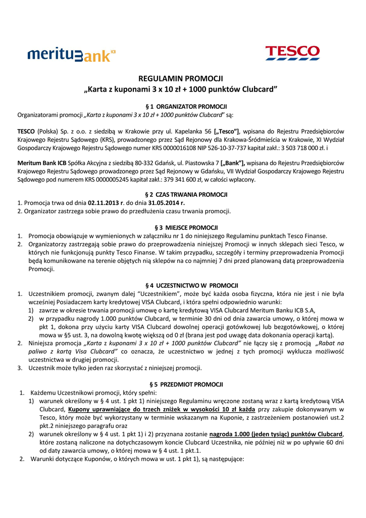REGULAMIN PROMOCJI „Karta z kuponami 3 x 10 zł + 1000 punktów Clubcard” § 1 ORGANIZATOR PROMOCJI Organizatorami promocji „Karta z kuponami 3 x 10 zł + 1000 punktów Clubcard” są: TESCO (Polska) Sp. z o.o. z siedzibą w Krakowie przy ul. Kapelanka 56 [„Tesco”], wpisana do Rejestru Przedsiębiorców Krajowego Rejestru Sądowego (KRS), prowadzonego przez Sąd Rejonowy dla Krakowa-Śródmieścia w Krakowie, XI Wydział Gospodarczy Krajowego Rejestru Sądowego numer KRS 0000016108 NIP 526-10-37-737 kapitał zakł.: 3 503 718 000 zł. i Meritum Bank ICB Spółka Akcyjna z siedzibą 80-332 Gdańsk, ul. Piastowska 7 [„Bank”], wpisana do Rejestru Przedsiębiorców Krajowego Rejestru Sądowego prowadzonego przez Sąd Rejonowy w Gdańsku, VII Wydział Gospodarczy Krajowego Rejestru Sądowego pod numerem KRS 0000005245 kapitał zakł.: 379 341 600 zł, w całości wpłacony. § 2 CZAS TRWANIA PROMOCJI 1. Promocja trwa od dnia 02.11.2013 r. do dnia 31.05.2014 r. 2. Organizator zastrzega sobie prawo do przedłużenia czasu trwania promocji. § 3 MIEJSCE PROMOCJI 1. Promocja obowiązuje w wymienionych w załączniku nr 1 do niniejszego Regulaminu punktach Tesco Finanse. 2. Organizatorzy zastrzegają sobie prawo do przeprowadzenia niniejszej Promocji w innych sklepach sieci Tesco, w których nie funkcjonują punkty Tesco Finanse. W takim przypadku, szczegóły i terminy przeprowadzenia Promocji będą komunikowane na terenie objętych nią sklepów na co najmniej 7 dni przed planowaną datą przeprowadzenia Promocji. § 4 UCZESTNICTWO W PROMOCJI 1. Uczestnikiem promocji, zwanym dalej “Uczestnikiem”, może być każda osoba fizyczna, która nie jest i nie była wcześniej Posiadaczem karty kredytowej VISA Clubcard, i która spełni odpowiednio warunki: 1) zawrze w okresie trwania promocji umowę o kartę kredytową VISA Clubcard Meritum Banku ICB S.A, 2) w przypadku nagrody 1.000 punktów Clubcard, w terminie 30 dni od dnia zawarcia umowy, o której mowa w pkt 1, dokona przy użyciu karty VISA Clubcard dowolnej operacji gotówkowej lub bezgotówkowej, o której mowa w §5 ust. 3, na dowolną kwotę większą od 0 zł (brana jest pod uwagę data dokonania operacji kartą). 2. Niniejsza promocja „Karta z kuponami 3 x 10 zł + 1000 punktów Clubcard” nie łączy się z promocją „Rabat na paliwo z kartą Visa Clubcard” co oznacza, że uczestnictwo w jednej z tych promocji wyklucza możliwość uczestnictwa w drugiej promocji. 3. Uczestnik może tylko jeden raz skorzystać z niniejszej promocji. § 5 PRZEDMIOT PROMOCJI 1. Każdemu Uczestnikowi promocji, który spełni: 1) warunek określony w § 4 ust. 1 pkt 1) niniejszego Regulaminu wręczone zostaną wraz z kartą kredytową VISA Clubcard, Kupony uprawniające do trzech zniżek w wysokości 10 zł każda przy zakupie dokonywanym w Tesco, który może być wykorzystany w terminie wskazanym na Kuponie, z zastrzeżeniem postanowień ust.2 pkt.2 niniejszego paragrafu oraz 2) warunek określony w § 4 ust. 1 pkt 1) i 2) przyznana zostanie nagroda 1.000 (jeden tysiąc) punktów Clubcard, które zostaną naliczone na dotychczasowym koncie Clubcard Uczestnika, nie później niż w po upływie 60 dni od daty zawarcia umowy, o której mowa w § 4 ust. 1 pkt.1. 2. Warunki dotyczące Kuponów, o których mowa w ust. 1 pkt 1), są następujące: 1) Uczestnik biorący udział w promocji w punkcie Tesco Finanse wymienionym w załączniku 1 potwierdzi obiór Kuponów czytelnym podpisem złożonym na potwierdzeniu, będącym załącznikiem do niniejszego Regulaminu, 2) w przypadku przeprowadzenia Promocji w sklepach, o których mowa w §3 ust. 2 Regulaminu, Kupony zostaną przesłane Uczestnikom pocztą, bez potrzeby dokonania potwierdzenia odbioru, 3) każda zniżka 10 zł wynikająca z Kuponu będzie każdorazowo naliczana bezpośrednio w kasie dowolnego sklepu Tesco, o ile wartość zakupów przed naliczeniem zniżki nie będzie niższa niż 50 zł, a płatność za te zakupy będzie dokonana kartą VISA Clubcard i nie zostanie ona rozłożona na promocyjne raty w ramach akcji promocyjnej „Darmowe raty w Tesco”, 4) przed dokonaniem zapłaty Uczestnik promocji zobowiązany jest wręczyć kasjerowi Kupon, na podstawie którego kasjer pomniejszy kwotę do zapłaty o 10 zł, 5) jednorazowo może być uwzględniona tylko jedna zniżka 10 zł, 6) Kupon po upływie terminu ważności wskazanym na Kuponie nie będzie realizowany. 3. Operacje gotówkowe lub bezgotówkowe, o których mowa w § 4 ust. 1 pkt 2), dotyczące naliczenia nagrody 1.000 punktów Clubcard to: 1) operacje bezgotówkowe dokonane kartą VISA Clubcard w kraju lub za granicą w dowolnych punktach handlowousługowych (również w sklepach Tesco) oraz w Internecie, z wyłączeniem operacji, które zostały rozłożone na promocyjne Raty, 2) operacje gotówkowe dokonane kartą w dowolnych bankomatach w kraju lub za granicą. 1. 2. 3. § 6 TRYB SKŁADANIA I ROZPATRYWANIA REKLAMACJI Reklamacje związane z uczestnictwem w Promocji Uczestnik może składać w jeden z następujących sposobów: 1) bezpośrednio – poprzez złożenie reklamacji w punkcie TESCO Finanse - w placówce TESCO, 2) korespondencyjnie – poprzez przesłanie reklamacji na: a) adres korespondencyjny Banku: Meritum Bank ICB S.A., 80-332 Gdańsk, ul. Piastowska 7, b) adres e-mail: [email protected], wskazany na stronie internetowej – www.tesco.pl/finanse, 3) telefonicznie – kontaktując się telefonicznie z Bankiem, pod numerami Infolinii: 801 980 555, (+48) 58 76 70 555 lub (+48) 58 88 80 555 (koszt połączenia według taryfy operatora), 4) za pośrednictwem faxu – przesyłając reklamację na numer 58 767 07 00, 5) jeżeli Uczestnik jest użytkownikiem Systemu Bankowości Elektronicznej Banku – korzystając z odpowiedniego formularza po zalogowaniu się do Systemu Bankowości Elektronicznej Banku. Bank rozpatruje reklamacje w terminie do 10 dni roboczych, licząc od daty jej otrzymania. Odpowiedź n