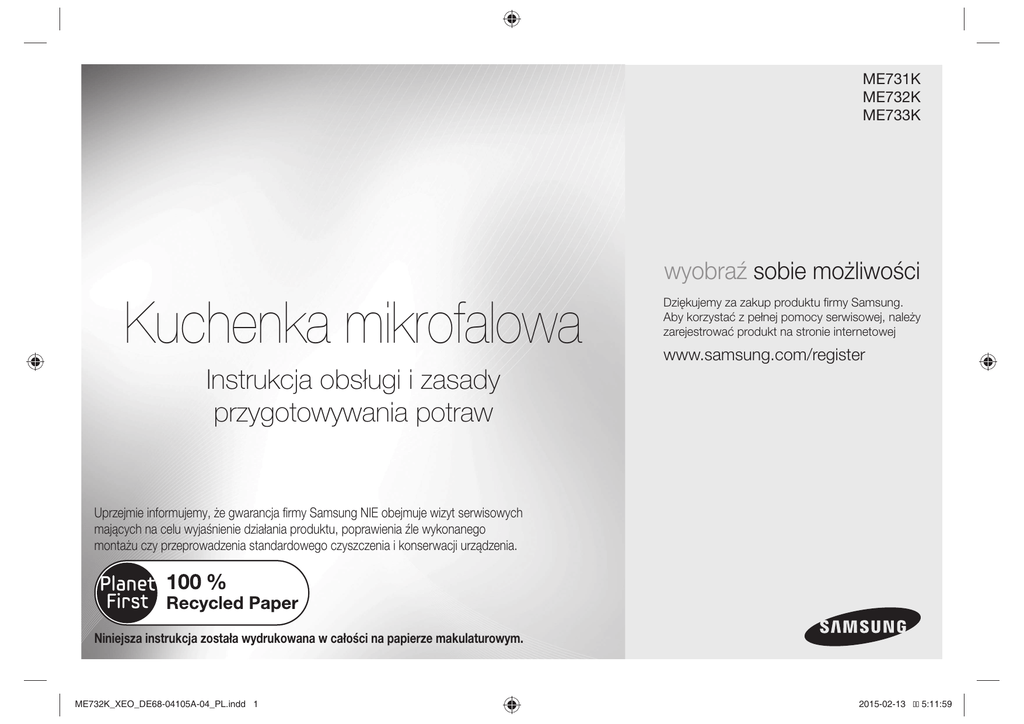 ME731K ME732K ME733K wyobraź sobie możliwości Kuchenka mikrofalowa Dziękujemy za zakup produktu firmy Samsung. Aby korzystać z pełnej pomocy serwisowej, należy zarejestrować produkt na stronie internetowej www.samsung.com/register Instrukcja obsługi i zasady przygotowywania potraw Uprzejmie informujemy, że gwarancja firmy Samsung NIE obejmuje wizyt serwisowych mających na celu wyjaśnienie działania produktu, poprawienia źle wykonanego montażu czy przeprowadzenia standardowego czyszczenia i konserwacji urządzenia. Niniejsza instrukcja została wydrukowana w całości na papierze makulaturowym. ME732K_XEO_DE68-04105A-04_PL.indd 1 WAŻNE INSTRUKCJE DOTYCZĄCE BEZPIECZEŃSTWA NALEŻY JE UWAŻNIE PRZECZYTAĆ I ZACHOWAĆ NA PRZYSZŁOŚĆ. Należy upewnić się, czy przedstawione instrukcje są przestrzegane przez cały czas korzystania z kuchenki. Przed użyciem kuchenki należy zapoznać się z poniższymi instrukcjami. POLSKI JAK KORZYSTAĆ Z INSTRUKCJI OBSŁUGI Gratulujemy zakupu kuchenki mikrofalowej firmy SAMSUNG. Instrukcja obsługi zawiera wiele cennych informacji na temat gotowania przy użyciu kuchenki mikrofalowej dotyczących: • zasad bezpieczeństwa • właściwych akcesoriów i przyborów kuchennych • pomocnych wskazówek dotyczących przygotowywania potraw • Wskazówki dotyczące przygotowywania potraw LEGENDA DLA SYMBOLI I IKON OSTRZEŻENIE Zagrożenia lub niebezpieczne czynności, które mogą prowadzić do poważnego kalectwa lub śmierci. PRZESTROGA Zagrożenia lub niebezpieczne czynności, które mogą prowadzić do drobnych obrażeń lub uszkodzenia mienia. Ostrzeżenie; zagrożenie pożarem Ostrzeżenie; gorąca powierzchnia Ostrzeżenie; prąd Ostrzeżenie; materiał wybuchowy NIE próbować. NIE dotykać. NIE rozmontowywać. Postępować zgodnie z instrukcjami. Odłącz wtyczkę zasilania z gniazda sieci. Upewnić się, czy urządzenie jest uziemione, aby zapobiec porażeniu prądem. Skontaktować się z centrum serwisowym. Uwaga OSTRZEŻENIE (Tylko funkcja kuchenki mikrofalowej) OSTRZEŻENIE: Nie należy używać kuchenki, jeśli drzwiczki lub ich uszczelnienie są uszkodzone — usterki muszą najpierw zostać naprawione przez wykwalifikowaną osobę. OSTRZEŻENIE: Wykonywanie czynności serwisowych i naprawa urządzenia wymagająca zdjęcia pokrywy chroniącej przed promieniowaniem mikrofalowym przez osoby niewykwalifikowane może być bardzo niebezpieczna. OSTRZEŻENIE: Płyny i pozostała żywność nie mogą być podgrzewane w szczelnie zamkniętych pojemnikach, gdyż grozi to wybuchem. Urządzenie jest przeznaczone wyłącznie do użytku domowego. Ważne 2 ME732K_XEO_DE68-04105A-04_PL.indd 2 AĆ m u W przypadku zauważenia dymu kuchenkę należy wyłączyć oraz odłączyć od źródła zasilania; pozostawić drzwiczki kuchenki zamknięte w celu zduszenia płomienia. OSTRZEŻENIE: Podczas podgrzewania napojów w kuchence mikrofalowej może w niektórych przypadkach dojść do opóźnionego gwałtownego wrzenia, dlatego należy ostrożnie obchodzić się z naczyniem. OSTRZEŻENIE: Przed podaniem zawartość butelek i słoiczków z jedzeniem dla dzieci należy wymieszać lub wstrząsnąć oraz sprawdzić temperaturę, aby uniknąć poparzenia. Jajek w skorupkach i całych jajek na twardo nie należy podgrzewać w kuchenkach mikrofalowych, ponieważ mogą one eksplodować nawet po zakończeniu podgrzewania. Kuchenkę należy regularnie czyścić i usuwać z niej wszelkie pozostałości jedzenia. Nadmierne zabrudzenie kuchenki może spowodować uszkodzenia jej powierzchni i wpłynąć negatywnie na okres eksploatacji urządzenia lub doprowadzić do powstania niebezpiecznych sytuacji. Urządzenie nie jest przeznaczone do instalacji w pojazdach drogowych, przyczepach itp. POLSKI li OSTRZEŻENIE: Dzieci mogą korzystać z kuchenki mikrofalowej tylko po przekazaniu im odpowiednich informacji umożliwiających bezpieczne korzystanie z kuchenki oraz wyjaśnieniu ryzyka związanego z niewłaściwym jej użyciem. OSTRZEŻENIE: Z urządzenia mogą korzystać dzieci powyżej 8. roku życia i osoby o ograniczonej sprawności fizycznej, sensorycznej lub umysłowej, bądź o niedostatecznym doświadczeniu i wiedzy jedynie pod nadzorem lub po przeszkoleniu w zakresie bezpiecznej obsługi i zagrożeń. Dzieciom nie wolno bawić się urządzeniem. Dzieci mogą przeprowadzać czyszczenie i konserwację urządzenia wyłącznie pod nadzorem osoby dorosłej i pod warunkiem ukończenia 8 lat. Należy używać wyłącznie naczyń odpowiednich do stosowania w kuchenkach mikrofalowych. Podgrzewanie żywności w plastikowych lub papierowych pojemnikach powinno odbywać się pod ścisłym nadzorem użytkownika ze względu na ryzyko zapłonu. Kuchenka mikrofalowa służy do podgrzewania jedzenia i napojów. Suszenie jedzenia i ubrań oraz podgrzewanie mokrych gąbek, obuwia, wilgotnych ściereczek i podobnych rzeczy grozi obrażeniami, zapłonem i pożarem. 3 ME732K_XEO_DE68-04105A-04_PL.indd 3 POLSKI Osoby o ograniczonej sprawności fizycznej, sensorycznej lub umysłowej, bądź o niedostatecznym doświadczeniu i wiedzy (np. dzieci) nie powinny korzystać z urządzenia bez nadzoru lub przeszkolenia w zakresie obsługi przez inną osobę odpowiedzialną za ich bezpieczeństwo. Nie wolno dopuścić, by dzieci bawiły się urządzeniem. Ze względów bezpieczeństwa uszkodzony przewód zasilający musi zostać wymieniony przez producenta, w autoryzowanym serwisie lub przez wykwalifikowaną osobę. OSTRZEŻENIE: Płyny i inna żywność nie mogą być podgrzewane w szczelnie zamkniętych pojemnikach, gdyż grozi to wybuchem; Nie należy czyścić urządzenia strumieniem wody. Kuchenka powinna być umieszczona w takim kierunku i na takiej wysokości, aby zapewnić łatwy dostęp do jej wnętrzna i do panelu sterowania. Przed pierwszym użyciem kuchenki należy wstawić do niej wodę i uruchomić kuchenkę na 10 minut. Jeżeli kuchenka wydaje dziwny dźwięk, swąd spalenizny 