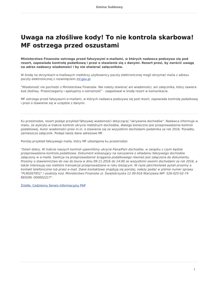 Gmina Subkowy Uwaga na złośliwe kody! To nie kontrola skarbowa! MF ostrzega przed oszustami Ministerstwo Finansów ostrzega przed fałszywymi e-mailami, w których nadawca podszywa się pod resort, zapowiada kontrolę podatkową i prosi o stawienie się z danymi. Resort prosi, by zwrócić uwagę na adres nadawcy wiadomości i by nie otwierać załączników. W środę na skrzynkach e-mailowych niektórzy użytkownicy poczty elektronicznej mogli otrzymać maila z adresu poczty elektronicznej z rozwinięciem mf.gov.pl "Wiadomość nie pochodzi z Ministerstwa Finansów. Nie należy otwierać ani wiadomości, ani załącznika, który zawiera kod złośliwy. Przestrzegamy i apelujemy o ostrożność" - zaapelował w środę resort w komunikacie. MF ostrzega przed fałszywymi e-mailami, w których nadawca podszywa się pod resort, zapowiada kontrolę podatkową i prosi o stawienie się w urzędzie z danymi. Ku przestrodze, resort podaje przykład fałszywej wiadomości dotyczącej "ukrywania dochodów". Nadawca informuje w mailu, że wykryto w trakcie kontroli ukrycie niektórych dochodów, dlatego konieczne jest przeprowadzenie kontroli podatkowej. Autor wiadomości prosi m.in. o stawienie się ze wszystkimi dochodami podatnika za rok 2016. Ponadto, zamieszcza załącznik. Podaje także dane adresowe MF. Poniżej przykład fałszywego maila, który MF udostępnia ku przestrodze: "Dzień dobry, W trakcie naszych kontroli ujawniliśmy ukrycie Pana/Pani dochodów, w związku z czym będzie przeprowadzona kontrola podatkowa. Dokument wskazujący na naruszenia o składaniu fałszywego dochodów załączony w e-maile. Sankcja na przeprowadzenie ściągania podatkowego również jest załączona do dokumentu. Prosimy o stawiennictwo do nas do biura w dniu 09.11.2016 do 14:00 ze wszystkimi swoimi dochodami za rok 2016, a także interesują nas niektóre transakcje przeprowadzane w roku bieżącym. W razie jakichkolwiek pytań prosimy o kontakt telefonicznie lub przez e-mail. Dane kontaktowe znajdują się poniżej, należy podać w piśmie numer sprawy "PL90267951" i osobisty kod. Ministerstwo Finansów ul. Świętokrzyska 12 00-916 Warszawa NIP: 526-025-02-74 REGON: 000002217". Źródło: Codzienny Serwis Informacyjny PAP 1