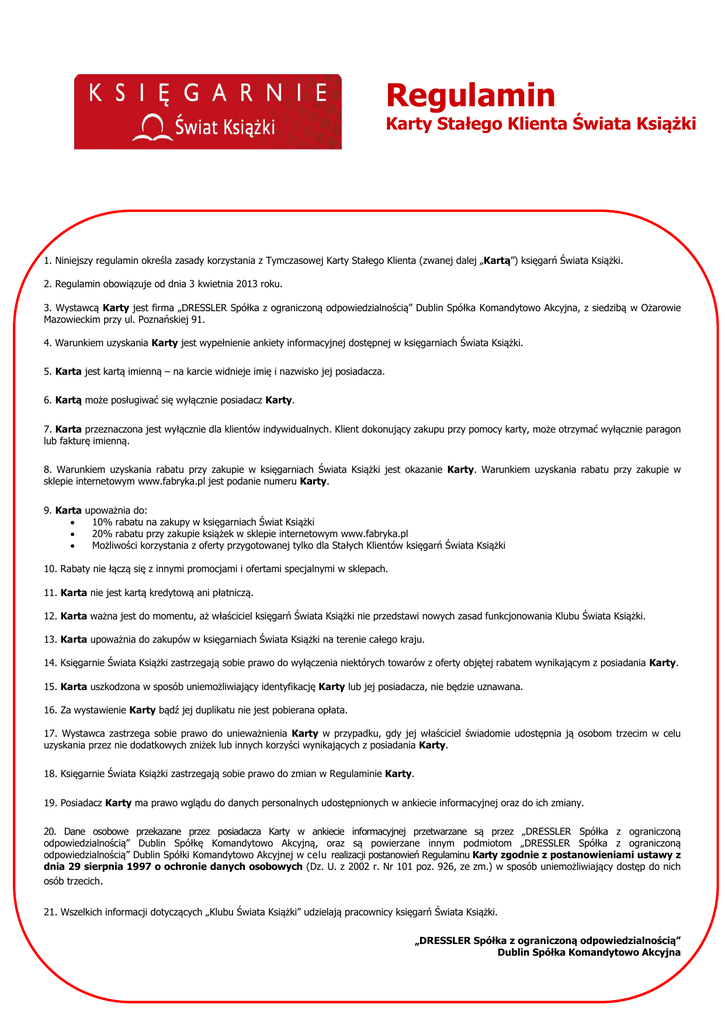 Regulamin Karty Stałego Klienta Świata Książki 1. Niniejszy regulamin określa zasady korzystania z Tymczasowej Karty Stałego Klienta (zwanej dalej „Kartą”) księgarń Świata Książki. 2. Regulamin obowiązuje od dnia 3 kwietnia 2013 roku. 3. Wystawcą Karty jest firma „DRESSLER Spółka z ograniczoną odpowiedzialnością” Dublin Spółka Komandytowo Akcyjna, z siedzibą w Ożarowie Mazowieckim przy ul. Poznańskiej 91. 4. Warunkiem uzyskania Karty jest wypełnienie ankiety informacyjnej dostępnej w księgarniach Świata Książki. 5. Karta jest kartą imienną – na karcie widnieje imię i nazwisko jej posiadacza. 6. Kartą może posługiwać się wyłącznie posiadacz Karty. 7. Karta przeznaczona jest wyłącznie dla klientów indywidualnych. Klient dokonujący zakupu przy pomocy karty, może otrzymać wyłącznie paragon lub fakturę imienną. 8. Warunkiem uzyskania rabatu przy zakupie w księgarniach Świata Książki jest okazanie Karty. Warunkiem uzyskania rabatu przy zakupie w sklepie internetowym www.fabryka.pl jest podanie numeru Karty. 9. Karta upoważnia do: 10% rabatu na zakupy w księgarniach Świat Książki 20% rabatu przy zakupie książek w sklepie internetowym www.fabryka.pl Możliwości korzystania z oferty przygotowanej tylko dla Stałych Klientów księgarń Świata Książki 10. Rabaty nie łączą się z innymi promocjami i ofertami specjalnymi w sklepach. 11. Karta nie jest kartą kredytową ani płatniczą. 12. Karta ważna jest do momentu, aż właściciel księgarń Świata Książki nie przedstawi nowych zasad funkcjonowania Klubu Świata Książki. 13. Karta upoważnia do zakupów w księgarniach Świata Książki na terenie całego kraju. 14. Księgarnie Świata Książki zastrzegają sobie prawo do wyłączenia niektórych towarów z oferty objętej rabatem wynikającym z posiadania Karty. 15. Karta uszkodzona w sposób uniemożliwiający identyfikację Karty lub jej posiadacza, nie będzie uznawana. 16. Za wystawienie Karty bądź jej duplikatu nie jest pobierana opłata. 17. Wystawca zastrzega sobie prawo do unieważnienia Karty w przypadku, gdy jej właściciel świadomie udostępnia ją osobom trzecim w celu uzyskania przez nie dodatkowych zniżek lub innych korzyści wynikających z posiadania Karty. 18. Księgarnie Świata Książki zastrzegają sobie prawo do zmian w Regulaminie Karty. 19. Posiadacz Karty ma prawo wglądu do danych personalnych udostępnionych w ankiecie informacyjnej oraz do ich zmiany. 20. Dane osobowe przekazane przez posiadacza Karty w ankiecie informacyjnej przetwarzane są przez „DRESSLER Spółka z ograniczoną odpowiedzialnością” Dublin Spółkę Komandytowo Akcyjną, oraz są powierzane innym podmiotom „DRESSLER Spółka z ograniczoną odpowiedzialnością” Dublin Spółki Komandytowo Akcyjnej w celu realizacji postanowień Regulaminu Karty zgodnie z postanowieniami ustawy z dnia 29 sierpnia 1997 o ochronie danych osobowych (Dz. U. z 2002 r. Nr 101 poz. 926, ze zm.) w sposób uniemożliwiający dostęp do nich osób trzecich. 21. Wszelkich informacji dotyczących „Klubu Świata Książki” udzielają pracownicy księgarń Świata Książki. „DRESSLER Spółka z ograniczoną odpowiedzialnością” Dublin Spółka Komandytowo Akcyjna