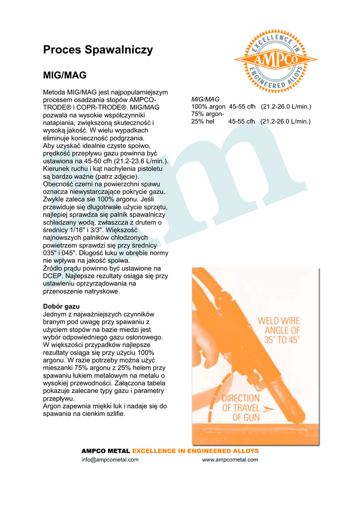 Proces Spawalniczy MIG/MAG Metoda MIG/MAG jest najpopularniejszym procesem osadzania stopów AMPCOTRODE® i COPR-TRODE®. MIG/MAG pozwala na wysokie współczynniki natapiania, zwiększoną skuteczność i wysoką jakość. W wielu wypadkach eliminuje konieczność podgrzania. Aby uzyskać idealnie czyste spoiwo, prędkość przepływu gazu powinna być ustawiona na 45-50 cfh (21.2-23.6 L/min.). Kierunek ruchu i kąt nachylenia pistoletu są bardzo ważne (patrz zdjęcie). Obecność czerni na powierzchni spawu oznacza niewystarczające pokrycie gazu. Zwykle zaleca sie 100% argonu. Jeśli przewiduje się długotrwałe użycie sprzętu, najlepiej sprawdza się palnik spawalniczy schładzany wodą, zwłaszcza z drutem o średnicy 1/16" i 3/3". Większość najnowszych palników chłodzonych powietrzem sprawdzi się przy średnicy 035" i 045". Długość łuku w obrębie normy nie wpływa na jakość spoiwa. Źródło prądu powinno być ustawione na DCEP. Najlepsze rezultaty osiąga się przy ustawieniu oprzyrządowania na przenoszenie natryskowe. Dobór gazu Jednym z najważniejszych czynników branym pod uwagę przy spawaniu z użyciem stopów na bazie miedzi jest wybór odpowiedniego gazu osłonowego. W większości przypadków najlepsze rezultaty osiąga się przy użyciu 100% argonu. W razie potrzeby można użyć mieszanki 75% argonu z 25% helem przy spawaniu łukiem metalowym na metalu o wysokiej przewodności. Załączona tabela pokazuje zalecane typy gazu i parametry przepływu. Argon zapewnia miękki łuk i nadaje się do spawania na cienkim szlifie. MIG/MAG 100% argon 45-55 cfh (21.2-26.0 L/min.) 75% argon25% hel 45-55 cfh (21.2-26.0 L/min.) Podgrzewanie Podgrzewanie stopów na bazie miedzi często nie jest konieczne w MIG/MAG, pod warunkiem że szlif nie jest za gruby. Przy spawaniu na miedzi temperatura warstwy pośredniej powinna wynosić 1000°F (538°C) niezależnie od metody spawania. Podgrzanie jest sugerowane podczas spawania elektrodami otulonymi. Poniższe zalecenia są jedynie sugestiami i będą zależeć od grubości szlifu, wybranej metody spawania i innych zmiennych. Zalecenia dotyczące podgrzewania 1. Stal nisko i średniowęglowa do 0.29 C – nie jest konieczne. 2. Stal średniowęglowa od 0.30 C do 0.59 C— 300°F to 600°F (149°C to 315°C), w zależności od zawartości węgla. 3. Stal niskostopowa—takie same jak przy stali niskowęglowej i miękkiej. 4. Żeliwo szare 400°F do 600°F (204°C do 315°C), wolne ochładzanie 5. Żeliwo sferoidalne i ciągliwe—300°F do 400°F (149°C to 204°C), zaleca sie wyżarzanie po spawaniu. 6. Miedzionikiel i brąz krzemowy—nie jest konieczne, temperatura warstwy pośredniej— max 200°F (93°C). 7. Brąz aluminiowy—stopy do 10% aluminum — bez podgrzewania, max. temp. warstwy pośredniej-300°F (149°C). Stopy powyżej 10% aluminium -300°F and 600"F max temp. warstwy pośredniej-(149°C i 315"C) . 8. Brąz manganowy—300°F (149°C) dla gazu obojętnego i 500°F (260°C) dla elektrod otulonych. 9. Miedź-1000°F (538°C). Zalecane natężenie Średnica Napięcie Natężenie* drutu MIG/MAG (dcep)- .035" .045" 1/16" 3/32" 20-26 22-28 29-32 32-34 100-200 100-250 250-400 350-500 * Dla stopów na bazie niklu i żelaza należy zastosować parametry z dolnej granicy, dla brązów środkowe parametry, najwyższe zaś dla miedzi.