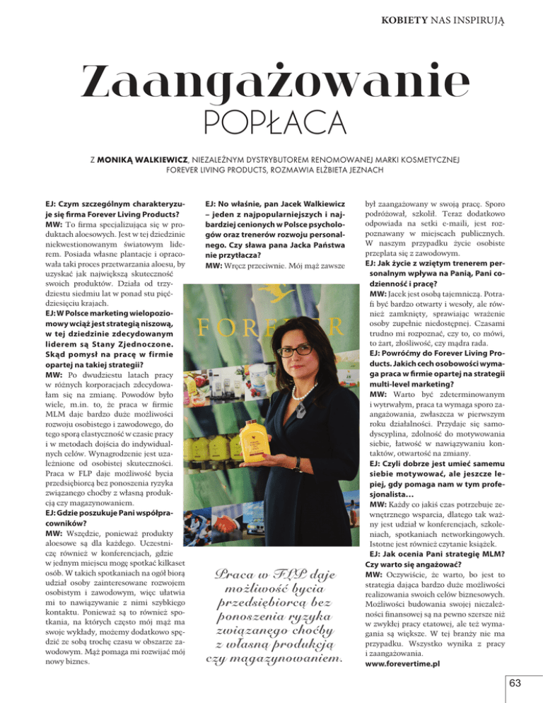 kobiety nas inspirują Zaangażowanie popłaca Z Moniką Walkiewicz, niezależnym dystrybutorem renomowanej marki kosmetycznej Forever Living Products, rozmawia Elżbieta Jeznach EJ: Czym szczególnym charakteryzuje się firma Forever Living Products? MW: To firma specjalizująca się w produktach aloesowych. Jest w tej dziedzinie niekwestionowanym światowym liderem. Posiada własne plantacje i opracowała taki proces przetwarzania aloesu, by uzyskać jak największą skuteczność swoich produktów. Działa od trzydziestu siedmiu lat w ponad stu pięćdziesięciu krajach. EJ: W Polsce marketing wielopoziomowy wciąż jest strategią niszową, w tej dziedzinie zdecydowanym liderem są Stany Zjednoczone. Skąd pomysł na pracę w firmie opartej na takiej strategii? MW: Po dwudziestu latach pracy w różnych korporacjach zdecydowałam się na zmianę. Powodów było wiele, m.in. to, że praca w firmie MLM daje bardzo duże możliwości rozwoju osobistego i zawodowego, do tego sporą elastyczność w czasie pracy i w metodach dojścia do indywidualnych celów. Wynagrodzenie jest uzależnione od osobistej skuteczności. Praca w FLP daje możliwość bycia przedsiębiorcą bez ponoszenia ryzyka związanego choćby z własną produkcją czy magazynowaniem. EJ: Gdzie poszukuje Pani współpracowników? MW: Wszędzie, ponieważ produkty aloesowe są dla każdego. Uczestniczę również w konferencjach, gdzie w jednym miejscu mogę spotkać kilkaset osób. W takich spotkaniach na ogół biorą udział osoby zainteresowane rozwojem osobistym i zawodowym, więc ułatwia mi to nawiązywanie z nimi szybkiego kontaktu. Ponieważ są to również spotkania, na których często mój mąż ma swoje wykłady, możemy dodatkowo spędzić ze sobą trochę czasu w obszarze zawodowym. Mąż pomaga mi rozwijać mój nowy biznes. EJ: No właśnie, pan Jacek Walkiewicz – jeden z najpopularniejszych i najbardziej cenionych w Polsce psychologów oraz trenerów rozwoju personalnego. Czy sława pana Jacka Państwa nie przytłacza? MW: Wręcz przeciwnie. Mój mąż zawsze był zaangażowany w swoją pracę. Sporo podróżował, szkolił. Teraz dodatkowo odpowiada na setki e-maili, jest rozpoznawany w miejscach publicznych. W naszym przypadku życie osobiste przeplata się z zawodowym. EJ: Jak życie z wziętym trenerem personalnym wpływa na Panią, Pani codzienność i pracę? MW: Jacek jest osobą tajemniczą. Potrafi być bardzo otwarty i wesoły, ale również zamknięty, sprawiając wrażenie osoby zupełnie niedostępnej. Czasami trudno mi rozpoznać, czy to, co mówi, to żart, złośliwość, czy mądra rada. EJ: Powróćmy do Forever Living Products. Jakich cech osobowości wymaga praca w firmie opartej na strategii multi-level marketing? MW: Warto być zdeterminowanym i wytrwałym, praca ta wymaga sporo zaangażowania, zwłaszcza w pierwszym roku działalności. Przydaje się samodyscyplina, zdolność do motywowania siebie, łatwość w nawiązywaniu kontaktów, otwartość na zmiany. EJ: Czyli dobrze jest umieć samemu siebie motywować, ale jeszcze lepiej, gdy pomaga nam w tym profesjonalista… MW: Każdy co jakiś czas potrzebuje zewnętrznego wsparcia, dlatego tak ważny jest udział w konferencjach, szkoleniach, spotkaniach networkingowych. Istotne jest również czytanie książek. EJ: Jak ocenia Pani strategię MLM? Czy warto się angażować? MW: Oczywiście, że warto, bo jest to strategia dająca bardzo duże możliwości realizowania swoich celów biznesowych. Możliwości budowania swojej niezależności finansowej są na pewno szersze niż w zwykłej pracy etatowej, ale też wymagania są większe. W tej branży nie ma przypadku. Wszystko wynika z pracy i zaangażowania. www.forevertime.pl 63