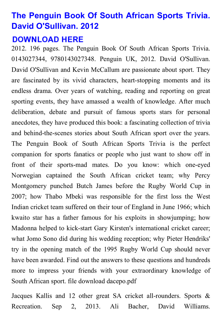 The Penguin Book Of South African Sports Trivia. David O'Sullivan. 2012 2012. 196 pages. The Penguin Book Of South African Sports Trivia. 0143027344, 9780143027348. Penguin UK, 2012. David O'Sullivan. David O'Sullivan and Kevin McCallum are passionate about sport. They are fascinated by its vivid characters, heart-stopping moments and its endless drama. Over years of watching, reading and reporting on great sporting events, they have amassed a wealth of knowledge. After much deliberation, debate and pursuit of famous sports stars for personal anecdotes, they have produced this book: a fascinating collection of trivia and behind-the-scenes stories about South African sport over the years. The Penguin Book of South African Sports Trivia is the perfect companion for sports fanatics or people who just want to show off in front of their sports-mad mates. Do you know: which one-eyed Norwegian captained the South African cricket team; why Percy Montgomery punched Butch James before the Rugby World Cup in 2007; how Thabo Mbeki was responsible for the first loss the West Indian cricket team suffered on their tour of England in June 1966; which kwaito star has a father famous for his exploits in showjumping; how Madonna helped to kick-start Gary Kirsten's international cricket career; what Jomo Sono did during his wedding reception; why Pieter Hendriks' try in the opening match of the 1995 Rugby World Cup should never have been awarded. Find out the answers to these questions and hundreds more to impress your friends with your extraordinary knowledge of South African sport. file download dacepo.pdf Jacques Kallis and 12 other great SA cricket all-rounders. Sports & Recreation. Sep 2, 2013. Ali Bacher, David Williams. ISBN:9780143531036. South Africa has produced more great cricket all-rounders than any other country. A century ago there was Jimmy Sinclair, the first man from any country to score a century and Jul 30, 2014. 432 pages. Clear, up-to-date coverage of methods for analyzing geographical information in a GIS context Geographic Information Analysis, Second Edition is fully updated to keep pace with. Science. David O'Sullivan, David Unwin. Geographic Information Analysis. ISBN:9781119023876 ISBN:9783319457383. Jennifer Miller, David O'Sullivan, Nancy Wiegand. This book constitutes the refereed proceedings of the 9th International Conference on Geographic Information Science, GIScience 2016, held in Montreal, QC, Canada, in September. Geographic Information Science. 9th International Conference, GIScience 2016, Montreal, QC, Canada, September 27-30, 2016, Proceedings. Computers. 339 pages. Oct 2, 2016 Sports Sports & Recreation. ISBN:9780143527893. The Extraordinary Book of SA Cricket. Sep 27, 2012. David O'Sullivan, Kevin McCallum. The Extraordinary Book of South African Cricket is the perfect gift for any cricket fanatic. Following up on their tremendous success with The Penguin Book of South African creating the integrated manufacturing environment. David O'Sullivan. 204 pages. 1994. Business & Economics. Manufacturing systems redesign. UOM:39015032958616 pdf file The Penguin Book Of South African Sports Trivia download ISBN:9788189975807. 128 pages. The story of Indian cricket's poster boy. Captain Cool is also the heartwarming account of the life of a young man who won India the World Twenty20 title. How this legend came. Gulu Ezekiel. Biography & Autobiography. Captain Cool : M S Dhoni. 2008 David O'Sullivan. Joseph Starling has returned from war and is trying his best to resettle into civilian life. In the midst of his struggles, anti war protests spring up around him, and in this. 350 pages. ISBN:9781941541418. Fiction. The Bomber. Jun 24, 2015 Of Sep 27, 2012. Kevin Ritchie. ISBN:9780143527879. Rodney Hartman was all things to sports journalism: informed and knowledgeable writer, editor, teacher, biographer, mentor, sounding board and confidant. When the news came on. Sports & Recreation. Rodney Hartman - The Show Must Go On The download ÈÑÁÍ:9780143526995. 2 padziernika 2012 roku. Wedug poudniowoafrykaskich bohaterw sportowych. Link. 55 stron. George Claassenáûë. Rpa przytuli swoich sportowcw i kobiet, jak bohaterowie i symbole nadziei, odwagi i pojednania. Zebrane w sowa republika sportowych bohaterw ksiki Poudniowa 2 padziernika 2012 roku. David O ' Sullivan EN Kevin Ìàêêàëëóìà passievol pododze sport EN sowa geboei deur umrze karakters kleurryke, spanningsvolle oomblikke wasnej nimmereindigende dramat Wat umrze sportwreld. David O ' Sullivan, Kevin Ìàêêàëëóì. Sport I Rekreacja. Umrze Pingwin Beck Van Sporttrivia. ÈÑÁÍ:9780143526834. 153 strony ÈÑÁÍ:9781770228665. 1 wrzenia 2015,. Poudniowej Afryki Najwikszych Áýòñìåíîâ. Republika poudniowej Afryki daa wiatu niektre z najlepszych áýòñìåíîâ w wiecie, z AB de Villiers i Hashim Amla dominujcej ostatnie oceny ICC. Poprzednie polecenia i pokole. Ali Áà÷åð David Williams. Sport I Rekreacja. 256 stron afrykaskich pingwinw Pobra w formacie PDF Technology & Engineering. Proceedings of the IFIP TC5/WG5.7 Working Conference on Re-engineering the Enterprise, Galway, Ireland, 1995. Business process re-engineering tools offer techniques to model the enterprise and identify opportunities to make change. This book examines the approaches, tools and. Oct 31, 1995. 338 pages. Re-engineering the Enterprise. J. Browne, David O'Sullivan. ISBN:0412642603 Trivia pdf ISBN:0471211761. Clear, up-to-date coverage of methods for analyzing geographical information in a GIS context Geographic Information Analysis presents clear and up-to-date coverage of the. Science. Geographic Information Analysis. 436 pages. David O'Sullivan, David John Unwin. 2003 Applying Innovation. 391 pages. Jun 23, 2008. ISBN:9781412954556. Business & Economics. A step-by-step approach to applying high impact innovation in any organization. David O'Sullivan, Lawrence Dooley The Penguin Book Of South African Sports Trivia pdf d