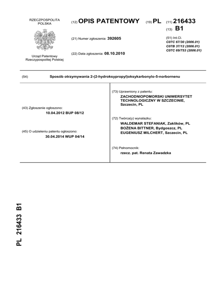 RZECZPOSPOLITA POLSKA (12) OPIS PATENTOWY (19) (21) Numer zgłoszenia: 392605 Urząd Patentowy Rzeczypospolitej Polskiej (54) (22) Data zgłoszenia: 08.10.2010 PL 216433 (13) B1 (11) (51) Int.Cl. C07C 67/30 (2006.01) C07B 37/12 (2006.01) C07C 69/753 (2006.01) Sposób otrzymywania 2-(2-hydroksypropyl)oksykarbonylo-5-norbornenu (73) Uprawniony z patentu: (43) Zgłoszenie ogłoszono: ZACHODNIOPOMORSKI UNIWERSYTET TECHNOLOGICZNY W SZCZECINIE, Szczecin, PL 10.04.2012 BUP 08/12 (72) Twórca(y) wynalazku: (45) O udzieleniu patentu ogłoszono: WALDEMAR STEFANIAK, Zaklików, PL BOŻENA BITTNER, Bydgoszcz, PL EUGENIUSZ MILCHERT, Szczecin, PL 30.04.2014 WUP 04/14 (74) Pełnomocnik: PL 216433 B1 rzecz. pat. Renata Zawadzka 2 PL 216 433 B1 Opis wynalazku Przedmiotem wynalazku jest sposób otrzymywania 2-(2-hydroksypropyl)oksykarbonylo-5-norbornenu w reakcji Dielsa-Aldera, z udziałem cyklopentadienu i dienofilu w obecności cieczy jonowych. Znane są sposoby otrzymywania pochodnych norbornenu w reakcji Dielsa-Aldera cyklopentadienu i dienofilu w obecności katalizatora oraz cieczy jonowych jako rozpuszczalnika. Znane są przykłady użycia cieczy jonowych z grupy soli imidazoliowych, sulfoniowych i fosfoniowych jako rozpuszczalników w reakcji Dielsa-Aldera (Nitin A. Mirgane, Sandip B. Kotwal, Anil V. Karnik, Cent. Eur. J. Chem., 2010, 8, 2, 356-360; Bittner B., Janus E., Catalysis Letters 2010, 134(1-2), 147-154; A. Aggarwal, N. L. Lancaster, A. R. Sethi, T. Welton, Green Chem. 2002, 4, 517-520; E. Janus, W. Stefaniak, Catalysis Letters, 2008; 124(1), 105-110.). Z opisu patentowego US 3715330 znany jest sposób otrzymywania pochodnej 2-(2-hydroksypropyl)oksykarbonylo-5-norbornenu na drodze reakcji pomiędzy cyklopentadienem z akrylanem 2-hydroksypropylu w autoklawie w temperaturze 80°C w czasie 24 godzin z wydajnością 80%. Sposób otrzymywania 2-(2-hydroksypropyl)oksykarbonylo-5-norbornenu w reakcji Dielsa-Aldera z udziałem cyklopentadienu i dienofilu w obecności katalizatora i cieczy jonowej jako rozpuszczalnika z wyodrębnieniem produktu z mieszaniny, charakteryzuje się tym, że jako dienofil stosuje się akrylan 2-hydroksypropylu, zaś jako ciecz jonową stosuje się tris(pentafluoroetylo)trifluorofosforan N-butylo-N-metylopirolidyniowy lub tris(pentafluoroetylo)trifluorofosforan N-(3-hydroksypropylo)pirydynowy lub tris(pentafluoroetylo)trifluorofosforan N-(2-metoksyetylo)-N-metylopiperydyniowy lub tris(pentafluoroetylo)trifluorofosforan N-(2-metoksyetylo)-N-metylomorfoliniowy. Proces według wynalazku przebiega zgodnie z reakcją: Reakcję prowadzi się w zakresie temperatur od 25°C do 45°C, przy stosunku molowym dienofi3 3 la do dienu 1:1,5, stężeniu dienofila 1,0-8,0 mol/dm , dienu 1,5-12 mol/dm . Jako katalizatory stosuje się chlorki metali: itru, iterbu, miedzi, cynku, magnezu, lantanu, indu; o ogólnym wzorze MClx, w którym x - wartościowość metalu lub trifluorometanosulfoniany: neodymu, lantanu, iterbu, itru, wapnia, magnezu, cynku, litu, sodu, srebra, potasu o ogólnym wzorze M(CF3SO3)x oraz M(CF3SO3)x·H2O, w którym x - wartościowość metalu lub bis(trifluorometylosulfonylo)imidki: iterbu, litu o ogólnym wzorze M[(CF3SO2)2N]x, w którym x - wartościowość metalu. Korzystnie stosunek katalizatora do dienofilu wynosi 0,001-0,003:1. Produkt po reakcji oddziela się przez ekstrakcję rozpuszczalnikiem takim jak: cykloheksan, eter dietylowy, toluen lub heksan. Oddziela ekstrakt produktu a rafinat w postaci cieczy jonowej z katalizatorem zawraca do ponownej syntezy pochodnej norbornenu. 2-(2-hydroksypropyl)oksykarbonylo-5-norbornenu jest stosowany jako monomer w polimeryzacji winylowej która pozwala na zachowanie struktury bicyklicznej. W wyniku polimeryzacji winylowej tej pochodnej norbornenu otrzymywane są wyroby użytkowe w postaci: folii, rur, włókien, przewodów elektrycznych, itp. Ze względu na przezroczystość znajdują zastosowania w optyce. Kopolimery 2-(2-hydroksypropyl)oksykarbonylo-5-norbornenu z olefinami posiadają wskaźniki refrakcji odpowiednie do zastosowań w soczewkach, pryzmatach, dyskach komputerowych itp., jako substytuty szkła, cienkie filmy izolujące w mikroelektronice oraz jako składniki ekranów ciekłokrystalicznych. Zgodnie z wynalazkiem reakcję prowadzi się w środowisku rozpuszczalników z grupy cieczy jonowych. Wymienione ciecze jonowe jako rozpuszczalniki reakcji Dielsa-Aldera zastosowano tu po raz pierwszy. Zastosowane związki z uwagi na obecność anionu tris(pentafluoroetylo)trifluorofosforanowego (FAP) należą do cieczy hydrofobowych, nie ulegających rozkładowi w obecności wilgoci PL 216 433 B1 3 i powietrza. Cechuje je także stosunkowo niska lepkość, co również ułatwia prowadzenie reakcji. Pod względem chemicznym i termicznym są bardziej stabilne niż inne ciecze jonowe np. z anionem BF 4 czy PF6 , które hydrolizują z wydzieleniem silnie korozyjnego fluorowodoru. Istotną zaletą cieczy jonowych z anionem FAP jest także jego słaby charakter koordynujący, co ma szczególne znaczenie w reakcjach katalizowanych solami metali. Sposób według wynalazku bliżej przedstawiają poniższe przykłady wykonania. Przykład I 3 Do szklanego reaktora o pojemności 5 cm , wprowadzono 0,5802 g tris(pentafluoroetylo)trifluorofosforanu N-(3-hydroksypropylo)pirydyniowego. Następnie dodano akrylan 2-hydroksypropylu w ilości 0,123 g (1 mmol) oraz cyklopentadien w ilości 0,099 g (1,5 mmol). Reaktor zamknięto korkiem, umieszczono w termostatowanej łaźni o temperaturze 25°C i mieszano mieszadłem magnetycznym. Z mieszaniny reakcyjnej pobierano próbki w odstępach czasowych co 15 minut aż do uzyskania wydajności ponad 90% i analizowano metodą chromatografii gazowej na zawartość produktu endo 2-(2-hydroksypropyl)oksykarbonylo-5-norbornenu. Na podstawie analiz ustalono, że konwersja akrylanu 2-hydroksypropylu a jednocześnie wydajność produktu wynosiła 94% po 3 godzinach. Analizy GC prowadzono w następujących waru
