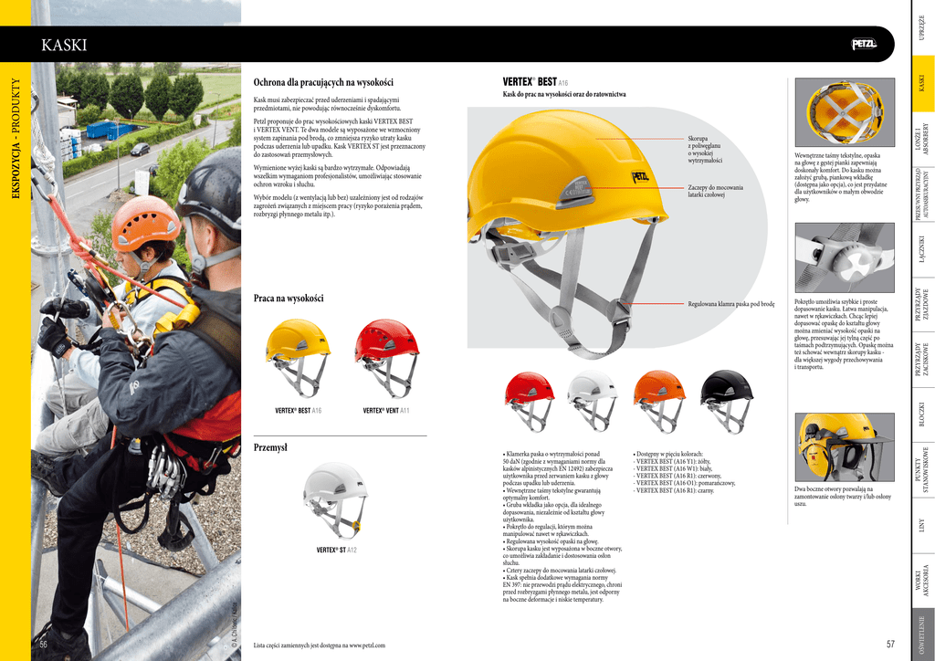 UPRZĘŻE KASKI KASKI ® Kask do prac na wysokości oraz do ratownictwa Petzl proponuje do prac wysokościowych kaski VERTEX BEST i VERTEX VENT. Te dwa modele są wyposażone we wzmocniony system zapinania pod brodą, co zmniejsza ryzyko utraty kasku podczas uderzenia lub upadku. Kask VERTEX ST jest przeznaczony do zastosowań przemysłowych. Skorupa z poliwęglanu o wysokiej wytrzymałości Wymienione wyżej kaski są bardzo wytrzymałe. Odpowiadają wszelkim wymaganiom profesjonalistów, umożliwiając stosowanie ochron wzroku i słuchu. Zaczepy do mocowania latarki czołowej Wewnętrzne taśmy tekstylne, opaska na głowę z gęstej pianki zapewniają doskonały komfort. Do kasku można założyć grubą, piankową wkładkę (dostępna jako opcja), co jest przydatne dla użytkowników o małym obwodzie głowy. © A. Childeric / Kalice Lista części zamiennych jest dostępna na www.petzl.com BLOCZKI Dwa boczne otwory pozwalają na zamontowanie osłony twarzy i/lub osłony uszu. LINY • Dostępny w pięciu kolorach: - VERTEX BEST (A16 Y1): żółty, - VERTEX BEST (A16 W1): biały, - VERTEX BEST (A16 R1): czerwony, - VERTEX BEST (A16 O1): pomarańczowy, - VERTEX BEST (A16 R1): czarny. WORKI AKCESORIA VERTEX® ST A12 • Klamerka paska o wytrzymałości ponad 50 daN (zgodnie z wymaganiami normy dla kasków alpinistycznych EN 12492) zabezpiecza użytkownika przed zerwaniem kasku z głowy podczas upadku lub uderzenia. • Wewnętrzne taśmy tekstylne gwarantują optymalny komfort. • Gruba wkładka jako opcja, dla idealnego dopasowania, niezależnie od kształtu głowy użytkownika. • Pokrętło do regulacji, którym można manipulować nawet w rękawiczkach. • Regulowana wysokość opaski na głowę. • Skorupa kasku jest wyposażona w boczne otwory, co umożliwia zakładanie i dostosowania osłon słuchu. • Cztery zaczepy do mocowania latarki czołowej. • Kask spełnia dodatkowe wymagania normy EN 397: nie przewodzi prądu elektrycznego, chroni przed rozbryzgami płynnego metalu, jest odporny na boczne deformacje i niskie temperatury. PUNKTY STANOWISKOWE VERTEX® VENT A11 Przemysł 56 Pokrętło umożliwia szybkie i proste dopasowanie kasku. Łatwa manipulacja, nawet w rękawiczkach. Chcąc lepiej dopasować opaskę do kształtu głowy można zmieniać wysokość opaski na głowę, przesuwając jej tylną część po taśmach podtrzymujących. Opaskę można też schować wewnątrz skorupy kasku dla większej wygody przechowywania i transportu. 57 OŚWIETLENIE VERTEX® BEST A16 Regulowana klamra paska pod brodę PRZYRZĄDY ZACISKOWE Praca na wysokości PRZYRZĄDY ZJAZDOWE ŁĄCZNIKI Wybór modelu (z wentylacją lub bez) uzależniony jest od rodzajów zagrożeń związanych z miejscem pracy (ryzyko porażenia prądem, rozbryzgi płynnego metalu itp.). LONŻE I ABSORBERY Kask musi zabezpieczać przed uderzeniami i spadającymi przedmiotami, nie powodując równocześnie dyskomfortu. VERTEX BEST A16 PRZESUWNY PRZYRZĄD AUTOASEKURACYJNY EKSPOZYCJA - PRODUKTY Ochrona dla pracujących na wysokości UPRZĘŻE Kaski KASKI LONŻE I ABSORBERY VERTEX BEST: • Ochrona przed porażeniem prądem elektrycznym (brak wentylacji). ŁĄCZNIKI PRZESUWNY PRZYRZĄD AUTOASEKURACYJNY VERTEX VENT: • Kask z otworami wentylacyjnymi (ochrona przed porażeniem prądem elektrycznym nie jest gwarantowana). Kask z wodoszczelnym, podwójnym źródłem światła, przeznaczony do ciasnych przestrzeni, ratownictwa i nocnych prac na wysokości Kask z wentylacją, do prac na wysokości oraz ratownictwa Kask przemysłowy • Otwory z przesuwanymi zatyczkami umożliwiają dostosowanie wentylacji zależnie od warunków użytkowania. • Klamerka paska o zwiększonej wytrzymałości (ponad 50 daN, zgodnie z wymaganiami normy dla kasków alpinistycznych EN 12492) zabezpiecza użytkownika przed zerwaniem kasku z głowy podczas upadku lub uderzenia. • Wewnętrzne taśmy tekstylne gwarantują optymalny komfort. • Gruba wkładka jako opcja, dla idealnego dopasowania, niezależnie od kształtu głowy użytkownika. • Pokrętło do regulacji, którym można manipulować nawet w rękawiczkach. • Regulowana wysokość opaski na głowę. • Skorupa kasku jest wyposażona w boczne otwory, co umożliwia zakładanie i dostosowania osłon słuchu. • Cztery zaczepy do mocowania latarki czołowej. • Dostępny w pięciu kolorach: - VERTEX VENT (A11 Y1): żółty, - VERTEX VENT (A11 W1): biały, - VERTEX VENT (A11 R1): czerwony, - VERTEX VENT (A11 O1): pomarańczowy, - VERTEX VENT (A11 N1): czarny. • Spełnia dodatkowe wymagania normy EN 397: jest odporny na boczne deformacje i niskie temperatury. • Nie spełnia dodatkowych wymagań normy EN 397 dla kasków przemysłowych: przewodzenie prądu elektrycznego, ochrona przed rozbryzgami płynnego metalu (ze względu na otwory wentylacyjne). • Klamerka paska pod brodę odpina się pod działaniem siły 25 daN, zgodnie z normą EN 397. • Wewnętrzne taśmy tekstylne gwarantują optymalny komfort. • Gruba wkładka jako opcja, dla idealnego dopasowania, niezależnie od kształtu głowy użytkownika. • Pokrętło do regulacji, którym można manipulować nawet w rękawiczkach. • Regulowana wysokość opaski na głowę. • Skorupa kasku jest wyposażona w boczne otwory, co umożliwia zakładanie i dostosowania osłon słuchu. • Cztery zaczepy do mocowania latarki czołowej. • Kolor: biały. • Kask spełnia dodatkowe wymagania normy EN 397: nie przewodzi prądu elektrycznego, chroni przed rozbryzgami płynnego metalu, jest odporny na boczne deformacje i niskie temperatury. Ilość światła : 67 lumenów (14 diod) Typ wiązki : szeroka lub skupiona 14 diod (wiązka szeroka) maksymalny optymalny ekonomiczny Całkowity czas świecenia : 183 h 148 h 110 h Czas świecenia w trybie awaryjnym : 179 h 30 138 h 47 h Zasięg t=0 : 34 m --> 3 h 30 26 m --> 10 h 15 m --> 63 h Zasięg t=0h30: 34 m 26 m 15 m Zasięg t=10h: 9m 26 m 15 m Zasięg t=30h: - - 15 m Dane techniczne