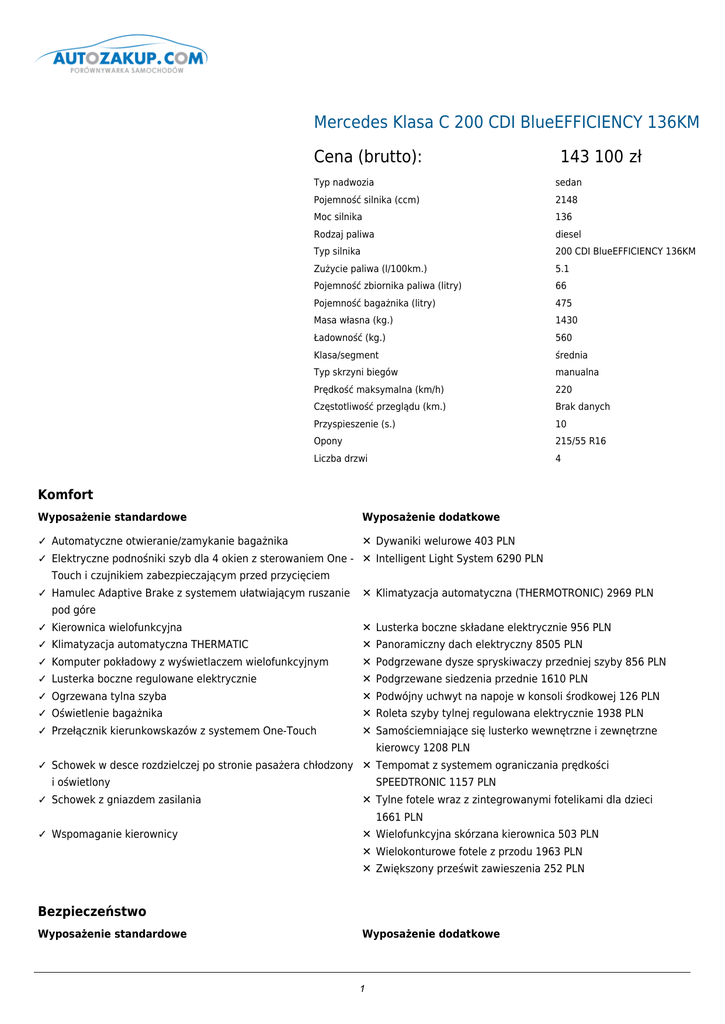 Mercedes Klasa C 200 CDI BlueEFFICIENCY 136KM Cena (brutto): 143 100 zł Typ nadwozia sedan Pojemność silnika (ccm) 2148 Moc silnika 136 Rodzaj paliwa diesel Typ silnika 200 CDI BlueEFFICIENCY 136KM Zużycie paliwa (l/100km.) 5.1 Pojemność zbiornika paliwa (litry) 66 Pojemność bagażnika (litry) 475 Masa własna (kg.) 1430 Ładowność (kg.) 560 Klasa/segment średnia Typ skrzyni biegów manualna Prędkość maksymalna (km/h) 220 Częstotliwość przeglądu (km.) Brak danych Przyspieszenie (s.) 10 Opony 215/55 R16 Liczba drzwi 4 Komfort Wyposażenie standardowe Wyposażenie dodatkowe ✓ Automatyczne otwieranie/zamykanie bagażnika ✕ Dywaniki welurowe 403 PLN ✓ Elektryczne podnośniki szyb dla 4 okien z sterowaniem One - ✕ Intelligent Light System 6290 PLN Touch i czujnikiem zabezpieczającym przed przycięciem ✓ Hamulec Adaptive Brake z systemem ułatwiającym ruszanie ✕ Klimatyzacja automatyczna (THERMOTRONIC) 2969 PLN pod góre ✓ Kierownica wielofunkcyjna ✕ Lusterka boczne składane elektrycznie 956 PLN ✓ Klimatyzacja automatyczna THERMATIC ✕ Panoramiczny dach elektryczny 8505 PLN ✓ Komputer pokładowy z wyświetlaczem wielofunkcyjnym ✕ Podgrzewane dysze spryskiwaczy przedniej szyby 856 PLN ✓ Lusterka boczne regulowane elektrycznie ✕ Podgrzewane siedzenia przednie 1610 PLN ✓ Ogrzewana tylna szyba ✕ Podwójny uchwyt na napoje w konsoli środkowej 126 PLN ✓ Oświetlenie bagażnika ✕ Roleta szyby tylnej regulowana elektrycznie 1938 PLN ✓ Przełącznik kierunkowskazów z systemem One-Touch ✕ Samościemniające się lusterko wewnętrzne i zewnętrzne kierowcy 1208 PLN ✓ Schowek w desce rozdzielczej po stronie pasażera chłodzony ✕ Tempomat z systemem ograniczania prędkości i oświetlony ✓ Schowek z gniazdem zasilania SPEEDTRONIC 1157 PLN ✕ Tylne fotele wraz z zintegrowanymi fotelikami dla dzieci 1661 PLN ✓ Wspomaganie kierownicy ✕ Wielofunkcyjna skórzana kierownica 503 PLN ✕ Wielokonturowe fotele z przodu 1963 PLN ✕ Zwiększony prześwit zawieszenia 252 PLN Bezpieczeństwo Wyposażenie standardowe Wyposażenie dodatkowe 1 ✓ 5 zagłówków: NECKPRO - aktywne zagłówki dla kierowcy i ✕ Boczne poduszki foteli tylnych 1711 PLN pasażera, 3 tylne zagłówki z manualnym ustawianiem ✓ ABS wysokości ✕ Opony typu run-flat 1409 PLN ✓ Adaptacyjne światła hamowania ✕ Osłona silnika 503 PLN ✓ ASR - system kontroli momentu obrotowego ✕ PRE-SAFE 1661 PLN ✓ BAS ✕ Reflektory bi - ksenonowe, spryskiwacze reflektorów, funkcja doświetlania zakrętów 4277 PLN ✓ ESP\n ✓ Kurtyny powietrzne dla wszystkich\n ✓ Napinacze pasów bezpieczeństwa z ogranicznikiem siły napięcia z przodu i na skrajnych siedzeniach tylnych\n ✓ Pasy bezpieczeństwa ustawiane na wysokość z przodu, boczne z tyłu z automatycznym ustawianiem wysokości, trzypunktowy pas na środkowym siedzeniu z tyłu\n ✓ Poduszki powietrzne boczne dla kierowcy i pasażera\n ✓ Poduszki powietrzne dla kierowcy i pasażera\n ✓ Reflektory przeciwmgielne z przezroczystym kloszem, ogrzewane lusterka zewnętrzne\n ✓ Światła ostrzegawcze w klapie bagażnika\n ✓ System kontroli ciśnienia w oponach\n ✓ Uchwyty ISOFIX do fotelików dla dzieci z tyłu\n ✓ Układ kierowniczy Agility Control z bezpieczną kolumną kierownicy\n ✓ Zabezpieczenie drzwi tylnych przed otwarciem przez dzieci\n ✓ Zabezpieczenie przed odholowaniem\n ✓ Zabezpieczenie wnętrza pojazdu\n Dodatki Wyposażenie standardowe Wyposażenie dodatkowe ✓ Akustyczna sygnalizacja niewyłączonych świateł ✕ 17" 12 - szprychowe obręcze kół z metali lekkich 2617 PLN ✓ Alarm antywłamaniowy ✕ 17" 5 - szprychowe obręcze kół, ogumienie mieszane 5586 ✓ Antena zintegrowana w szybie tylnej ✕ 17'' podwójne obręcze kół AMG, ogumienie mieszane 8102 ✓ Apteczka ✕ 17'' wieloszprychowe obręcze kół z metali lekkich, ogumienie ✓ Asferyczne, podgrzewane lusterka zewnętrzne ✕ 17'' wieloszprychowe obręcze kół z metali lekkich, ogumienie PLN PLN mieszane 5534 PLN mieszane (z Avantgarde) 1485 PLN ✓ Automatyczne oświetlenie wnętrza po odryglowaniu zamka ✕ 17'' wieloszprychowe obręcze kół z metali lekkich, ogumienie mieszane (z Elegance) 4278 PLN ✓ Centralny zamek z ryglem wewn. i odrygl. po wyp. ✕ 18" 5 - szprychowe, podwójne obręcze kół z metali lekkich (z Elegance lub Avantgarde) 4076 PLN ✓ Chromowane oprawy instrumentów na zintegrowanej tablicy ✕ Audio 50 APS radio, odtwarzacz CD, DVD nawigacja wskaźników kierunkowa, odtwarzacz MP3 4076 PLN ✓ Fotel kierowcy i pasażera z elektryczną regulacją ustawień ✕ Ciśnieniowe spryskiwacze reflektorów 1308 PLN ✓ Haki mocujące w przestrzeni bagażowej ✕ COMAND APS z odtwarzaczem CD, DVD - Audio/ Video, nawigacją na 30 GB dysku twardym wraz z systemem sterowania głosem LINGUATRONIC 10619 PLN 2 ✓ Kierunkowskazy zintegrowane w lusterkach zewnętrznych ✕ COMAND APS ze zintegrowaną zmieniarką na płyty DVD 12128 PLN ✓ Kieszenie w oparciach przednich foteli ✕ Dopłata za kierownicę po prawej stronie 6432 PLN ✓ Klamki drzwi w kolorze nadwozia ✕ Fotel kierowcy regulowany elektrycznie z pamięcią ✓ Kolumna kierownicy z manualną regulacją wysokości i ✕ Hak holowniczy ze zdejmowaną głowicą kulową 3925 PLN ustawienia 2239 PLN oddalenia ✓ Lampki do czytania z przodu ✕ Kamera cofania 2013 PLN ✓ Listwy ozdobne okien chromowane ✕ KEYLESS-GO 3774 PLN ✓ Listwy progowe z napisem Mercedes-Benz ✕ Kierownica i dźwignia zmiany biegów obszyte skórą 866 PLN ✓ Nakładki progów - kpl ✕ Koło dojazdowe (minispare) 277 PLN ✓ Podświetlane lusterka w osłonach przeciwsłonecznych ✕ Koło zapasowe zamiast TIREFIT z elektryczną pompą 277 ✓ Podłokietnik przedni ze schowkiem ✕ Mocowanie PLN gaśnicy 554 PLN ✓ Radio CD Audio 20 odtwarzające również pliki MP3 ✕ Możliwość załadunku dłuższych przedmiotów 1308 PLN ✓ Reflektory soczewkowe ✕ Obręcze AMG 1