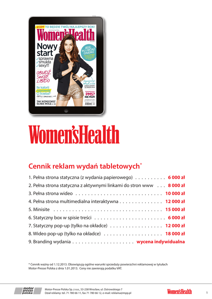 Cennik reklam wydań tabletowych* 1. Pełna strona statyczna (z wydania papierowego) . . . . . . . . . . . 6 000 zł 2. Pełna strona statyczna z aktywnymi linkami do stron www . . . . 8 000 zł 3. Pełna strona wideo . . . . . . . . . . . . . . . . . . . . . . . . . . . . . 10 000 zł 4. Pełna strona multimedialna interaktywna. . . . . . . . . . . . . . . 12 000 zł 5. Minisite . . . . . . . . . . . . . . . . . . . . . . . . . . . . . . . . . . . . 15 000 zł 6. Statyczny box w spisie treści . . . . . . . . . . . . . . . . . . . . . . . . 6 000 zł 7. Statyczny pop-up (tylko na okładce) . . . . . . . . . . . . . . . . . . 12 000 zł 8. Wideo pop-up (tylko na okładce) . . . . . . . . . . . . . . . . . . . . 18 000 zł 9. Branding wydania . . . . . . . . . . . . . . . . . . . . . wycena indywidualna * Cennik ważny od 1.12.2013. Obowiązują ogólne warunki sprzedaży powierzchni reklamowej w tytułach Motor-Presse Polska z dnia 1.01.2013. Ceny nie zawierają podatku VAT. Motor-Presse Polska Sp. z o.o., 53-238 Wrocław, ul. Ostrowskiego 7 Dział reklamy: tel. 71 780 66 11, fax 71 780 66 12, e-mail: [email protected] 1 Specyfikacja techniczna reklam do wydania tabletowego Tabletowe wydanie polskiej edycji magazynu Women’s Health dostępne jest na tablety iPad (system iOS). Magazyn ma orientację pionową i jest w pełni multimedialną i interaktywną aplikacją wykonaną w technologii Adobe Digital Publishing Suite. Dystrybucja wydania tabletowego odbywa się za pośrednictwem sklepu internetowego AppStore (iPad). Publikacja zawiera treści wydania papierowego wzbogacone o dodatkowe materiały, multimedia i elementy interaktywne. Ukazuje się co dwa miesiące równolegle z wydaniem papierowym. 1. Pełna strona statyczna (z wydania papierowego) – statyczna kreacja umieszczona na całej stronie wydania w ustalonym miejscu e-publikacji. Materiał powinien zostać przygotowany w jednym z formatów: PSD, TIFF, JPEG, PNG, PDF (72 ppi, RGB) o wymiarach 1536 x 2048 px. Czcionki w pliku PDF powinny być osadzone lub zamienione na krzywe. Dla tej wersji reklamy może być zastosowana reklama do wydania papierowego. Na etapie przygotowanie e-wydania, wzbogacona zostanie o aktywne buttony do wskazanej strony www, lub innego miejsca w aplikacji. Pola aktywne nie są szczególnie oznaczane. 2. Pełna strona statyczna z aktywnymi linkami do stron www – statyczna kreacja umieszczona na całej stronie wydania w ustalonym miejscu e-publikacji. Materiał powinien zostać przygotowany w jednym z formatów: PSD, TIFF, JPEG, PNG, PDF (72 ppi, RGB) o wymiarach 1536 x 2048 px. Czcionki w pliku PDF powinny być osadzone lub zamienione na krzywe. Dla tej wersji reklamy może być zastosowana reklama do wydania papierowego. Na etapie przygotowanie e-wydania, wzbogacona zostanie o aktywne buttony do wskazanej strony www, lub innego miejsca w aplikacji. Pola aktywne nie są szczególnie oznaczane. 3. Pełna strona wideo – reklama wideo umieszczona na całej stronie wydania w ustalonym miejscu e-publikacji. Materiał wideo odtwarza się automatycznie po wyświetleniu strony niezależnie od dostępu do internetu. Optymalny format pliku wideo: 1536 x 2048 px, kodowanie H.264, 25 fps; audio: Main Profile level 3.1 with AAC-LC, 128 kbps per channel, 44 kHz; rozszerzenie pliku: .m4v, .mp4 lub .mov. Jeden spot wideo przygotowany do e-publikacji nie powinien przekraczać 10 MB. Publikację tego formatu należy skonsultować z redakcją, gdyż w jednym e-wydaniu istnieje możliwość umieszczenia tylko czterech materiałów wideo. 4. Pełna strona multimedialna interaktywna – reklama umieszczona na jednej całej stronie wydania w ustalonym miejscu e-publikacji. Oprócz rozbudowanej interakcji można tu zamieścić dźwięk, wideo, galerie zdjęć, linki do internetu, bardziej zaawansowane to gry, ankiety, animacje etc. Technologia produkcji: a) Adobe Indesign, Adobe Digital Publishing Suite (projektowanie przycisków, nowych warstw, odtwarzania audio i wideo, galerii zdjęć, scrolli, odsyłaczy do www). b) HTML5 i JavaScript (zaawansowane interakcje np. ankiety, gry, animacje etc.). Materiał powinien mieć wymiary 1536 x 2048 px w rozdzielczości 72 ppi. Motor-Presse Polska Sp. z o.o., 53-238 Wrocław, ul. Ostrowskiego 7 Dział reklamy: tel. 71 780 66 11, fax 71 780 66 12, e-mail: [email protected] 2 5. Minisite – połączenie kilku stron wydania w interaktywny minisite, na którym oprócz rozbudowanej interakcji można zamieścić materiały wideo, audio, galerie zdjęć, quizy, ankiety czy proste gry poświęcone produktowi. Minisite może składać się z kilku multimedialnych i interaktywnych stron (o wymiarze 768x1024 px (1536x2048 dla ekranu Retina) lub jednej długiej strony (długość jest wielokrotnością strony jednego screenu, czyli 1024 px (2048 px dla ekranu Retina). Technologia produkcji: a) Adobe Indesign, Adobe Digital Publishing Suite (elementy interaktywne, odtwarzanie audio i wideo, galerie zdjęć, linki do www) b) HTML5 i JavaScript (zaawansowane interakcje np. ankiety, gry, animacje etc.) Materiał powinien mieć wymiary 1536 x 2048 px (1 strona) w rozdzielczości 72 ppi. Czcionki powinny być zamienione na krzywe lub dołączone w pakiecie razem z grafiką. 6. Statyczny box w spisie treści – Możliwe jest również umieszczenie linka do reklamy (pełna strona lub minisite) w layoucie spisu treści. Reklama taka może mieć formę normalnej pozycji w spisie treści lub być grafiką. Jest to reklama offline. Plik graficzny powinien mieć wymiary 260x325 px (format JPEG, 72 ppi, RGB). 7. Statyczny pop-up (tylko na okładce) – statyczna reklama wyświetlana na okładce magazynu w momencie otwierania wydania. Warstwa, na której jest wyświetlana reklama, zakrywa całą okładkę. W prawym górnym rogu powinien znaleźć się widoczny „close button”, który posłuży czytelnikowi do wyłączenia reklamy. Materiał powinien zostać przygotowany w formacie TIFF, JPEG, PNG, PDF (72 