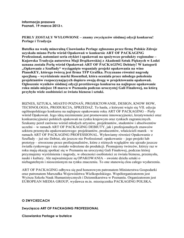 Informacja prasowa Poznań, 19 marca 2013 r. PERŁY ZOSTAŁY WYŁOWIONE – znamy zwycięzców siódmej edycji konkursu! Perlage i Tradycja Butelka na wodę mineralną Cisowianka Perlage zgłoszona przez firmę Polskie Zdroje uzyskała miano Perła wśród Opakowań w konkursie ART OF PACKAGING Professional, natomiast seria etykiet i opakowań na spożywcze produkty regionalne – Kujawska Tradycja autorstwa Maji Drążkowskiej z Akademii Sztuk Pięknych w Łodzi uznana została Perłą wśród Opakowań ART OF PACKAGING Debiuty! W kategorii „Opkowanie z Szuflady“ wyciągnięto wspaniały projekt opakowania na wino PianoKEY, którego twórcą jest firma TFP Grafika. Przyznano również nagrodę specjlaną – wyróżnienie marki Rosenthal, która oceniała prace młodego pokolenia projektantów rozpoczynających dopiero swoją drogę w projektowaniu opakowań. Ogłoszenie wyników siódmej edycji prestiżowego konkursu na najlepsze opakowanie roku miało miejsce 18 marca w Poznaniu podczas uroczystej Gali Finałowej, na którą przybyło wiele osobistości ze świata biznesu i sztuki. BIZNES, SZTUKA, MIASTO POZNAŃ, PROJEKTOWANIE, DESIGN, KNOW HOW, TECHNOLOGIA, PRODUKCJA, SPRZEDAŻ. To hasła, z którymi wiąże się VII. edycja ogólnopolskiego konkursu na najlepsze opakowanie roku ART OF PACKAGING – Perły wśród Opakowań. Jego ideą niezmiennie jest promowanie innowacyjności, kreatywności oraz konkurencyjności polskich opakowań na rynku krajowym oraz rynkach zagranicznych. Szukamy pereł zarówno wśród młodych artystów, projektantów, studentów i absolwentów uczelni – w ramach ART OF PACKAGING DEBIUTY, jak i profesjonalnych znawców sektora przemysłu opakowaniowego: projektantów, producentów, właścicieli marek – w ramach ART OF PACKAGING PROFESSIONAL. Wyławiamy również Opakowanie z Szuflady – już nie Debiut, ale jeszcze nie Professional: opakowanie – jego projekt lub prototyp – stworzone przez profesjonalistów, które z różnych względów nie ujrzało jeszcze światła rynkowego i nie zostało wdrożone do produkcji. Promujemy twórców, którzy raz w roku mają okazję spotkać się w Poznaniu na uroczystej Gali Finałowej, podczas której przyznajemy wyróżnienia i nagrody, w obecności osobistości ze świata biznesu, przemysłu, nauki i kultury. Ale najważniejsze są OPAKOWANIA – swoiste dzieła sztuki o niebagatelnym i nieocenionym na rynku znaczeniu. To one stanowią clou całego wydarzenia. ART OF PACKAGING odbywa się pod honorowym patronatem Ministerstwa Gospodarki oraz patronatem Marszałka Województwa Wielkopolskiego. Współorganizatorem jest Wyższa Szkoła Nauk Humanistycznych i Dziennikarstwa w Poznaniu. Organizatorem jest EUROPEAN MEDIA GROUP, wydawca m.in. miesięcznika PACKAGING POLSKA. O ZWYCIEZCACH Zwycięzca ART OF PACKAGING PROFESSIONAL Cisowianka Perlage w butelce Butelka na wodę Cisowianka Perlage Zgłaszający, projektant i użytkownik: Polskie Zdroje Producent: Owens-Illinois (butelka); JDA Łomża (etykieta) Butelka została stworzona z myślą o najbardziej wymagających konsumentach, którzy poszukują nie tylko wyjątkowego smaku, ale chcą otaczać się pięknymi, wyszukanymi przedmiotami. Precyzyjne, ozdobne tłoczenia, papierowa etykieta, głęboki, stworzony na indywidualne zamówienie niebieski kolor, srebrne, aluminiowe zamknięcie i smukły kształt sprawiają, że butelka jest prawdziwą ozdobą stołu i z powodzeniem pełni funkcję eleganckiej karafki. Butelka (poj. 0,7 litra) wykonana jest ze szkła produkowanego przez firmę O-I. Niebieski kolor stworzony został na indywidualne zamówienie Polskich Zdrojów. Butelka posiada specjalne tłoczenia, w których umieszcza się etykietę. Podobnie jak w innych produktach Polskich Zdrojów, zastosowano tu papierowe etykiety, dodatkowo wyposażone w srebrne elementy dekoracyjne. Zamknięcie to wykonana z aluminium zakrętka z plastikowym pierścieniem gwarancyjnym. Butelka należy do kategorii cienkościennych butelek bezzwrotnych, które posiadają wszystkie zalety szkła, przy czym proces ich recyklingu jest jeszcze bardziej efektywny i ekologiczny, m.in. ze względu na wagę opakowania oraz kwestie transportu. Zwycięzca ART OF PACKAGING DEBIUTY Kujawska Tradycja Seria etykiet i opakowań na spożywcze produkty regionalne Maja Drążkowska Akademia Sztuk Pięknych w Łodzi Kujawska Tradycja to linia etykiet i opakowań na produkty regionalne zamieszczone na listach produktów tradycyjnych. To spójny, rozpoznawalny pomysł na promowanie tradycji województwa, zarówno w Polsce, jak i za granicą. Produkty dobrano w taki sposób, by pochodziły z całego województwa kujawsko– pomorskiego oraz by można było zaprezentować różne formy opakowań. Dziś wiele z tych produktów nie posiada opakowań, co w dużej mierze ogranicza wprowadzenie ich na rynek oraz przyczynia się do słabej rozpoznawalności. Seria zawiera: etykiety na słoiki (trzy rodzaje miodów i powidła śliwkowe), etykiety na butelki (dwie nalewki, księżycówkę, miodek majowy, sok z kapusty), banderolkę na chleb, puszkę na kawę, kajmak i amoniaczki oraz opakowanie kartonowe na mace borowiackie. Ważne, by materiały zastosowane w projekcie były ekologiczne, ponieważ projekt promuje produkty naturalne. Motywy użyte na opakowaniach inspirowane są haftem kujawskim, pojawiającym się na fartuszku kujawskiego stroju. Użyta grafika ma więc również swoje zakotwiczenie w tradycji. Cały projekt jest spójny, ten sam układ etykiet pojawia się bowiem na wszystkich opakowaniach. Po przyjrzeniu się wychodzi na jaw, że etykiety nie są identyczne. Każdemu opakowaniu indywidualnego charakteru dodaje znak kwiatu rośliny lub koronki, który góruje na etykiecie lub dominuje na pudełku. Naturalnie utworzyły się trzy grupy znaków. W pierwszej symbole wskazują na to, z czego wytworzony został dany produkt np. dla miodu klonowego znakiem stał się kwiat klonu. Druga grupa zna