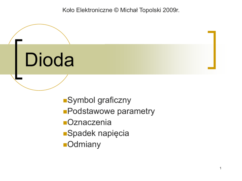 Koło Elektroniczne © Michał Topolski 2009r. Dioda Symbol graficzny Podstawowe parametry Oznaczenia Spadek napięcia Odmiany 1 Symbol graficzny Oznaczenie polskie Oznaczenie amerykańskie 2 Koło Elektroniczne © Michał Topolski 2009r. Złącze PN 3 Koło Elektroniczne © Michał Topolski 2009r. Zbliżenie 4 Koło Elektroniczne © Michał Topolski 2009r. Obudowa 5 Koło Elektroniczne © Michał Topolski 2009r. Podstawowe parametry Nominalne napięcie przewodzenia Maksymalne napięcie wsteczne Maksymalny prąd przewodzenia Pojemność Prąd wsteczny Maksymalne szczytowe napięcie wsteczne Maksymalny szczytowy prąd przewodzenia 6 Koło Elektroniczne © Michał Topolski 2009r. Zachowanie w układzie Diody przewodzą prąd tylko w jednym kierunku (zwór jednokierunkowy) Na diodzie odkłada się (mniej więcej) stałe napięcie, niezależnie od płynącego prądu Diody są elementami nieliniowymi! To znaczy, że nie poddają się prawu Ohma U R I Koło Elektroniczne © Michał Topolski 2009r. 7 Analogia hydrauliczna Polaryzacja zaporowa Prąd nie płynie Polaryzacja normalna Prąd płynie 8 Koło Elektroniczne © Michał Topolski 2009r. Charakterystyka 9 Koło Elektroniczne © Michał Topolski 2009r. Spadek napięcia (WAŻNE) Napięcie na diodzie utrzymuje się na (mniej więcej) stałym poziomie Np. dioda krzemowej 1N4148 – 0,6V dioda Schottkyego BAT49 – 0,3V dioda LED czerwona – 1,8V 10 Koło Elektroniczne © Michał Topolski 2009r. Odmiany diod Krzemowa Germanowa Schottkyego Zenera Elektroluminescencyjna (LED) Tunelowa Fotodioda Pojemnościowa (warikarp) Laserowa 11 Koło Elektroniczne © Michał Topolski 2009r. Odmiany diod Schottkyego Fotodioda Zenera Pojemnościowa (warikarp) 12 Koło Elektroniczne © Michał Topolski 2009r. Dioda elektroluminescencyjna (LED) 13 Koło Elektroniczne © Michał Topolski 2009r. Dioda LED - przykłady 14 Koło Elektroniczne © Michał Topolski 2009r. Dioda LED – zasada działania 15 Koło Elektroniczne © Michał Topolski 2009r. Dioda LED - budowa 16 Koło Elektroniczne © Michał Topolski 2009r. Kolor Długość fali (nm) Spadek napięcia (V) Podczerwień λ > 760 ΔV < 1.9 Czerwony 610 < λ < 760 1.63 < ΔV < 2.03 Pomarańczowy 590 < λ < 610 2.03 < ΔV < 2.10 Żółty 570 < λ < 590 2.10 < ΔV < 2.18 Zielony 500 < λ < 570 1.9 < ΔV < 4.0 Niebieski 450 < λ < 500 2.48 < ΔV < 3.7 Fiolet 400 < λ < 450 2.76 < ΔV < 4.0 Ultrafiolet λ < 400 3.1 < ΔV < 4.4 Biały Całe spektrum ΔV = 3.5 17 Wyświetlacze diodowe (segmentowe) 18 Koło Elektroniczne © Michał Topolski 2009r. Diody LED superjasne 19 Koło Elektroniczne © Michał Topolski 2009r.