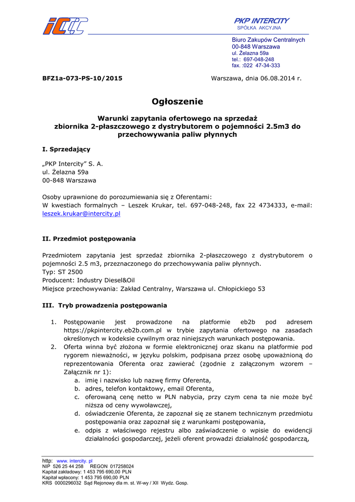 SPÓŁKA AKCYJNA Biuro Zakupów Centralnych 00-848 Warszawa ul. Żelazna 59a tel.: 697-048-248 fax. :022 47-34-333 BFZ1a-073-PS-10/2015 Warszawa, dnia 06.08.2014 r. Ogłoszenie Warunki zapytania ofertowego na sprzedaż zbiornika 2-płaszczowego z dystrybutorem o pojemności 2.5m3 do przechowywania paliw płynnych I. Sprzedający „PKP Intercity” S. A. ul. Żelazna 59a 00-848 Warszawa Osoby uprawnione do porozumiewania się z Oferentami: W kwestiach formalnych – Leszek Krukar, tel. 697-048-248, fax 22 4734333, e-mail: [email protected] II. Przedmiot postępowania Przedmiotem zapytania jest sprzedaż zbiornika 2-płaszczowego z dystrybutorem o pojemności 2.5 m3, przeznaczonego do przechowywania paliw płynnych. Typ: ST 2500 Producent: Industry Diesel&Oil Miejsce przechowywania: Zakład Centralny, Warszawa ul. Chłopickiego 53 III. Tryb prowadzenia postępowania 1. 2. Postępowanie jest prowadzone na platformie eb2b pod adresem https://pkpintercity.eb2b.com.pl w trybie zapytania ofertowego na zasadach określonych w kodeksie cywilnym oraz niniejszych warunkach postępowania. Oferta winna być złożona w formie elektronicznej oraz skanu na platformie pod rygorem nieważności, w języku polskim, podpisana przez osobę upoważnioną do reprezentowania Oferenta oraz zawierać (zgodnie z załączonym wzorem – Załącznik nr 1): a. imię i nazwisko lub nazwę firmy Oferenta, b. adres, telefon kontaktowy, email Oferenta, c. oferowaną cenę netto w PLN nabycia, przy czym cena ta nie może być niższa od ceny wywoławczej, d. oświadczenie Oferenta, że zapoznał się ze stanem technicznym przedmiotu postępowania oraz zapoznał się z warunkami postępowania, e. odpis z właściwego rejestru albo zaświadczenie o wpisie do ewidencji działalności gospodarczej, jeżeli oferent prowadzi działalność gospodarczą, http: www. intercity. pl NIP 526 25 44 258 REGON 017258024 Kapitał zakładowy: 1 453 795 690,00 PLN Kapitał wpłacony: 1 453 795 690,00 PLN KRS 0000296032 Sąd Rejonowy dla m. st. W-wy / XII Wydz. Gosp. SPÓŁKA AKCYJNA Biuro Zakupów Centralnych 00-848 Warszawa ul. Żelazna 59a tel.: 697-048-248 fax. :022 47-34-333 f. oświadczenie o wyrażeniu zgody na treść warunków umowy stanowiącej załącznik do nn. postępowania, dostępnego na platformie eb2b. 3. Wszyscy Oferenci zostaną wezwani do II etapu postępowania – negocjacji, dla której zostanie wyznaczony odrębny termin, o którym zainteresowani Oferenci zostaną powiadomieni drogą elektroniczną bezpośrednio po upłynięciu terminu składania ofert w I etapie. 4. Za najkorzystniejszą ofertę sprzedający uzna ofertę z najwyższą zaoferowaną ceną nabycia przedmiotu postępowania. 5. Niezwłocznie po dokonaniu wyboru oferty, Sprzedający powiadomi Oferentów w formie elektronicznej o wyniku postępowania. 6. Oferentowi, którego oferta została wybrana, zostanie przesłana informacja o wyborze oferty wraz z umową. 7. Sprzedający wzywa pisemnie Oferenta do podpisania umowy w określonym w wezwaniu terminie. 8. Sprzedający nie ponosi odpowiedzialności za stan techniczny sprzedawanych wózków wagonowych. Wyłączona jest rękojmia za wady fizyczne rzeczy. 9. Sprzedający zastrzega sobie prawo odwołania oraz zmiany warunków postępowania w trakcie trwania postępowania, a także zamknięcia postępowania bez wyboru ofert, bez podania przyczyny. IV. Wadium Sprzedający nie wymaga wniesienia wadium. V. Składanie i otwarcie ofert 1. Oferty należy składać poprzez platformę eb2b. 2. Otwarcie ofert nastąpi w terminie określonym na platformie eb2b. Załączniki: Załącznik nr 1 – Formularz ofertowy, Załącznik nr 2 - Wzór umowy. Załącznik nr 3 – Charakterystyka zbiornika. http: www. intercity. pl NIP 526 25 44 258 REGON 017258024 Kapitał zakładowy: 1 453 795 690,00 PLN Kapitał wpłacony: 1 453 795 690,00 PLN KRS 0000296032 Sąd Rejonowy dla m. st. W-wy / XII Wydz. Gosp. SPÓŁKA AKCYJNA Biuro Zakupów Centralnych 00-848 Warszawa ul. Żelazna 59a tel.: 697-048-248 fax. :022 47-34-333 Formularz ofertowy Działając w imieniu ………………………………………………………………………………………………… ……………… numer KRS ……………….…………………..., NIP …………..…………………………, REGON …………………………….., tel. kontaktowy:…………………………. fax: ………………………… adres e-mail: …………………………… , w ramach postępowania nr BFZ1-073-PS-10/2015 prowadzonego przez „PKP Intercity” S.A. składam ofertę na zakup zbiornika 2-płaszczowego z dystrybutorem o pojemności 2.5m3 do przechowywania paliw płynnych: Cena netto: …………………………………………. ................................................. ....................................................... (miejscowość, data) podpis osoby/osób upoważnionych do reprezentowania Oferenta http: www. intercity. pl NIP 526 25 44 258 REGON 017258024 Kapitał zakładowy: 1 453 795 690,00 PLN Kapitał wpłacony: 1 453 795 690,00 PLN KRS 0000296032 Sąd Rejonowy dla m. st. W-wy / XII Wydz. Gosp. SPÓŁKA AKCYJNA Biuro Zakupów Centralnych 00-848 Warszawa ul. Żelazna 59a tel.: 697-048-248 fax. :022 47-34-333 Charakterystyka zbiornika: CECHY PRODUKTU INDUSTRY Producent: KOD produktu: tak zbiornik z polietylenu 4m wąż tłoczny 2500 litrów pojemność nominalna 2,46 x 1,46 x 1,80 m wymiary 220 kg waga Panther 56 pompa F44 licznik mechaniczny A60 pistolet automatyczny 4m wąż tłoczny tak uchwyt magazynowanie oleju napędowegotak Tak zbiornik dwupłaszczowy Dane techniczne: - właz rewizyjny w zbiorniku zewnętrznym 16" - właz rewizyjny w zbiorniku wewnętrznym - pompa Panther 56 - licznik mechaniczny F44 - pistolet automatyczny A60 - wąż tłoczny 4m, - uchwyt http: www. intercity. pl NIP 526 25 44 258 REGON 017258024 Kapitał zakładowy: 1 453 795 690,00 PLN Kapitał wpłacony: 1 453 795 690,00 PLN KR