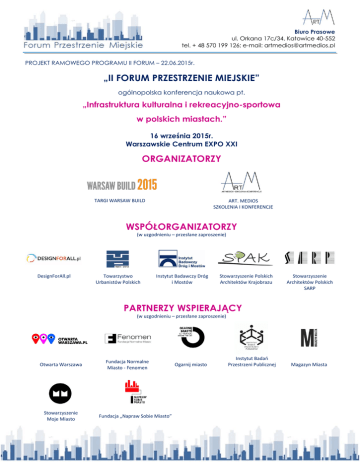 Biuro Prasowe ul. Orkana 17c/34, Katowice 40-552 tel. + 48 570 199 126; e-mail: [email protected] PROJEKT RAMOWEGO PROGRAMU II FORUM – 22.06.2015r. „II FORUM PRZESTRZENIE MIEJSKIE” ogólnopolska konferencja naukowa pt. „Infrastruktura kulturalna i rekreacyjno-sportowa w polskich miastach.” 16 września 2015r. Warszawskie Centrum EXPO XXI ORGANIZATORZY TARGI WARSAW BUILD ART. MEDIOS SZKOLENIA I KONFERENCJE WSPÓŁORGANIZATORZY (w uzgodnieniu – przesłane zaproszenie) DesignForAll.pl Towarzystwo Urbanistów Polskich Instytut Badawczy Dróg i Mostów Stowarzyszenie Polskich Architektów Krajobrazu Stowarzyszenie Architektów Polskich SARP PARTNERZY WSPIERAJĄCY (w uzgodnieniu – przesłane zaproszenie) Otwarta Warszawa Stowarzyszenie Moje Miasto Fundacja Normalne Miasto - Fenomen Fundacja „Napraw Sobie Miasto” Ogarnij miasto Instytut Badań Przestrzeni Publicznej Magazyn Miasta Biuro Prasowe ul. Orkana 17c/34, Katowice 40-552 tel. + 48 570 199 126; e-mail: [email protected] PATRONAT MEDIALNY (w uzgodnieniu – przesłane zaproszenie) RADA NAUKOWA FORUM (alfabetycznie; w uzgodnieniu – przesłane zaproszenia) Hubert Barański Prezes Fundacji Normalne Miasto Fenomen Artur Celiński Szef zespołu „DNA Miasta”, Członek redakcji „Magazynu Miasta” i Wiceprezes Fundacji Res Publica mgr inż. arch. kraj. Andrzej Długoński Wydział Ogrodnictwa Szkoła Główna Gospodarstwa Wiejskiego w Warszawie dr inż. arch. kraj. Monika Domanowska Katedra Architektury Krajobrazu, Wydział Ogrodnictwa, Biotechnologii i Architektury Krajobrazu, Szkoła Główna Gospodarstwa Wiejskiego w Warszawie prof. dr hab. inż. Andrzej Drabiński Instytut Architektury Krajobrazu, Uniwersytet Przyrodniczy we Wrocławiu mgr. inż. Artur Fojud DesignForAll.pl arch. Michał Gdak Institute of Design Kielce, Public Space Design - Pracownia Przestrzeni Publicznej arch. Dominika Janicka Institute of Design Kielce, Public Space Design - Pracownia Przestrzeni Publicznej Grzegorz Layer Architecture Snob, współtwórca projektu rewitalizacji katowickich podwórek "Plac Na Glanc" dr hab. inż. Tomasz Malczyk Instytut Architektury i Urbanistyki, Państwowa Wyższa Szkoła Zawodowa w Nysie prof. dr hab. inż. Zygfryd Nowak Politechnika Śląska, Stowarzyszenie "Polski Ruch Czystszej Produkcji" prof. nzw. dr hab. inż. Barbara Rymsza Instytut Badawczy Dróg i Mostów w Warszawie; Przewodnicząca Rady Naukowej IBDiM, Zastępca Kierownika Zakładu Mostów arch. Marcin Szczelina krytyk i kurator architektury, założyciel Architecture Snob i Furheart gallery dr hab. inż. arch. kraj. Marek Szumański Wydział Ogrodnictwa, Szkoła Główna Gospodarstwa Wiejskiego w Warszawie mgr inż. Karolina Wlazło-Malinowska Katedra Sztuki Krajobrazu, Szkoła Główna Gospodarstwa Wiejskiego w Warszawie Biuro Prasowe ul. Orkana 17c/34, Katowice 40-552 tel. + 48 570 199 126; e-mail: [email protected] PROGRAM TEMATYCZY – „II FORUM PRZESTRZENIE MIEJSKIE” ogólnopolska konferencja naukowa pt. „Infrastruktura kulturalna i rekreacyjno-sportowa w polskich miastach.” 10:00 – 12:00 SESJA I – INAUGURACYJNA Infrastruktura kulturalna Moderatorzy sesji: W ustaleniach Klasyfikacja infrastruktury kulturalnej Infrastruktura kulturalna jako czynnik rozwoju gospodarczego regionu Infrastruktura kulturalna w programach rozwoju regionalnego Znaczenie kwalifikacji kadr zarządzających infrastrukturą kulturalną Determinanty efektywności wykorzystania infrastruktury kulturalnej Cele i zadania w gospodarowaniu infrastrukturą obiektów kultury Kryteria oceny ekonomicznej efektywności w gospodarowaniu infrastrukturą kulturalną Referenci – w ustaleniach Dyskusja 12:00 – 13:00 PRZERWA NA LUNCH i ZWIEDZANIE TARGÓW WARSAW BUILD 2015 13:00 – 14:30 SESJA II Ustawa krajobrazowa Moderatorzy sesji: W ustaleniach Ustawa krajobrazowa – od teraz nowy ład reklamowy Ład reklamowy na terenie gmin – dziś i jutro Referenci – w ustaleniach o Aleksander Krajewski – Fundacja Napraw Sobie Miasto Dyskusja 14:30 – 15:45 SESJA III Infrastruktura rekreacyjno-sportowa Moderatorzy sesji: W ustaleniach Infrastruktura rekreacyjno-sportowa w programach rozwoju regionalnego Infrastruktura sportowo-rekreacyjna warunkiem rozwoju aktywności ruchowej społeczeństwa Referenci – w ustaleniach Dyskusja 15:45 – 16:00 PODSUMOWANIE I ZAKOŃCZENIE II FORUM PRZESTRZENIE MIEJSKIE