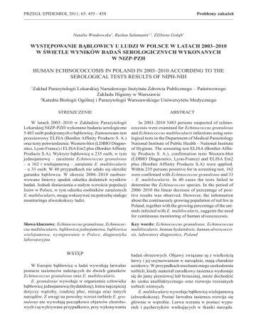 Problemy zakażeń PRZEGL EPIDEMIOL 2011; 65: 455 - 458 Natalia Wnukowska1, Rusłan Salamatin1,2, Elżbieta Gołąb1 WYSTĘPOWANIE BĄBLOWICY U LUDZI W POLSCE W LATACH 2003–2010 W ŚWIETLE WYNIKÓW BADAŃ SEROLOGICZNYCH WYKONANYCH W NIZP-PZH HUMAN ECHINOCOCCOSIS IN POLAND IN 2003–2010 ACCORDING TO THE SEROLOGICAL TESTS RESULTS OF NIPH-NIH Zakład Parazytologii Lekarskiej Narodowego Instytutu Zdrowia Publicznego – Państwowego Zakładu Higieny w Warszawie 2 Katedra Biologii Ogólnej i Parazytologii Warszawskiego Uniwersytetu Medycznego 1 STRESZCZENIE ABSTRACT W latach 2003–2010 w Zakładzie Parazytologii Lekarskiej NIZP-PZH wykonano badania serologiczne 5 483 osób podejrzanych o bąblowicę. Zastosowano test przesiewowy ELISA (Bordier Affinity Products S. A.) oraz testy potwierdzenia: Western-blot (LDBIO Diagnostics, Lyon-France) i ELISA Em2 plus (Bordier Affinity Products S.A). Wykryto bąblowicę u 235 osób, w tym jednojamową – zarażenie Echinococcus granulosus – u 162 i wielojamową – zarażenie E. multilocularis – u 33 osób. W 40 przypadkach nie udało się określić gatunku bąblowca. W okresie 2006–2010 zaobserwowano liniowy spadek odsetka dodatnich wyników badań. Jednak doniesienia o stałym wzroście populacji lisów w Polsce, w tym odsetka osobników zarażonych E. multilocularis, mogą wskazywać na potrzebę stałego monitoringu alweokokozy ludzi. In 2003–2010 5483 persons suspected of echinococcosis were examined for Echinococcus granulosus and Echinococcus multilocularis infections using serological tests in the Department of Medical Parasitology National Institute of Public Health – National Institute of Hygiene. The screening test ELISA (Bordier Affinity Products S. A.), confirmation tests Western-blot (LDBIO Diagnostics, Lyon-France) and ELISA Em2 plus (Bordier Affinity Products S.A) were applied. Within 235 persons posistive for in screening test, 162 were confirmed with Echinococcus granulosus and 33 – E. multilocularis. In 40 cases the tests failed to determine the Echinococcus species. In the period of 2006–2010 the linear decrease of percentage of positive results was observed. However, the information about the continuously growing population of red fox in Poland, together with the growing percentage of the animals infected with E. multilocularis, suggests the need for continuous monitoring of human alveococcosis. Słowa kluczowe: Echinococcus granulosus, Echinococ- Key words: Echinococcus granulosus, Echinococcus cus multilocularis, bąblowica jednojamowa, bąblowica multilocularis, human hydatidosis, human alveococcowielojamowa, występowanie w Polsce, diagnostyka sis, laboratory diagnostics, Poland laboratoryjna WSTĘP W Europie bąblowicę u ludzi wywołują larwalne postacie tasiemców należących do dwóch gatunków Echinococcus granulosus oraz E. multilocularis. E. granulosus wywołuje w organizmie człowieka bąblowicę jednojamową (hydatidozę), która najczęściej dotyczy wątroby, rzadziej płuc, mózgu oraz innych narządów. Z uwagi na powolny wzrost torbiele E. granulosus nie wywołują początkowo objawów chorobowych i są wykrywane przypadkowo, przy wykonywaniu badań obrazowych. Objawy związane są z wielkością larwy i jej usytuowaniem w narządzie, mają charakter uciskowy. W przypadkach mechanicznego uszkodzenia torbieli, kiedy materiał zarodkowy tasiemca wydostaje się do jamy piersiowej lub brzusznej, może dochodzić do szoku anafilaktycznego oraz rozwoju rozsianych torbieli wtórnych. E. multilocularis wywołuje bąblowicę wielojamową (alweokokozę). Postać larwalna tasiemca rozwija się głównie w wątrobie. Larwa wzrasta w postaci wypustek i pęcherzyków wnikających w tkanki narządu. 456 Nr 3 Natalia Wnukowska, Rusłan Salamatin, Elżbieta Gołąb Niektóre pęcherzyki po oderwaniu się od zrębu torbieli mogą przemieszczać się drogą naczyń krwionośnych i chłonnych i tworzyć przerzuty, nawet w tak odległych narządach, jak ośrodkowy układ nerwowy. Naciekowy wzrost pasożyta i zdolność do metastazy upodabnia bąblowicę wielojamową do choroby nowotworowej. Kryteriami pozwalającymi na rozpoznanie bąblowicy są: 1) obecność typowych zmian narządowych w badaniu obrazowym oraz potwierdzenie ich etiologii testem serologicznym; 2) wykrycie obecności swoistych przeciwciał przeciw Echinococcus spp. w surowicy krwi za pomocą testu serologicznego o wysokiej czułości, a następnie potwierdzenie ich występowania testem serologicznym o wysokiej swoistości. Celem niniejszej pracy była ocena częstości występowania przypadków zarażenia tasiemcami E. granulosus i E. multilocularis w Polsce w latach 2003–2010 na podstawie wyników badań serologicznych przeprowadzonych w Zakładzie Parazytologii Lekarskiej NIZP-PZH. MATEIAŁ I METODY W latach 2003–2010 w NIZP-PZH zbadano 5 483 próbki surowic pochodzących od osób z całej Polski, z podejrzeniem o zarażenie tasiemcami Echinococcus. Badanie serologiczne obejmowało test przesiewowy i test potwierdzenia. Testem przesiewowym był test ELISA na obecność przeciwciał klasy IgG przeciwko antygenom formy larwalnej Echinococcus (Bordier Affinity Products S. A.). Wyniki dodatnie ELISA były potwierdzane metodą Western-blot (WB) (LDBIO Diagnostics, Lyon-France). Metoda WB, w większości przypadków, umożliwia rozróżnienie zarażeń E. granulosus i E. multilocularis na podstawie wzoru reakcji przeciwciał IgG z różnymi frakcjami antygenowymi tasiemców. Próbki, dla których niemożliwe było zróżnicowanie gatunków, zbadano testem ELISA Em2 plus wykrywającym przeciwciała IgG swoiste dla E. multilocularis (Bordier Affinity Products S.A). Ten ostatni test zastosowany był w latach 2006–2010. Interpretacja wyników badań. Na zarażenie E. multilocularis wskazuje dodatni wynik testu Em2 plus lub testu WB dla frakcji charakterystycznych dla E. multilocularis. Na zarażenie E. granulosus wskazują: dodatni wynik WB dla frakcj