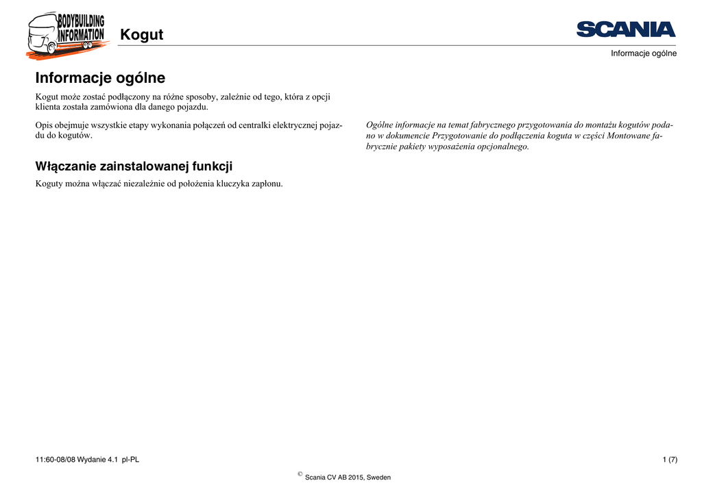 PGRT Kogut Informacje ogólne Informacje ogólne Kogut może zostać podłączony na różne sposoby, zależnie od tego, która z opcji klienta została zamówiona dla danego pojazdu. Opis obejmuje wszystkie etapy wykonania połączeń od centralki elektrycznej pojazdu do kogutów. Ogólne informacje na temat fabrycznego przygotowania do montażu kogutów podano w dokumencie Przygotowanie do podłączenia koguta w części Montowane fabrycznie pakiety wyposażenia opcjonalnego. Włączanie zainstalowanej funkcji Koguty można włączać niezależnie od położenia kluczyka zapłonu. 11:60-08/08 Wydanie 4.1 pl-PL 1 (7) © Scania CV AB 2015, Sweden PGRT Kogut Warunki dla podwozia Warunki dla podwozia Data produkcji pojazdu Miejsce produkcji Södertälje Zwolle Angers Data produkcji pojazdu Miejsce produkcji Södertälje Zwolle Angers Numer seryjny podwozia 2005-01-21 2 006 429 5 117 958 9 097 244 - Numer seryjny podwozia - 2005-01-20 - 2 006 428 - 5 117 957 - 9 097 243 Montowane fabrycznie pakiety wyposażenia opcjonalnego Opcja Alternatywa Kogut Brak Wiązka przewodów zabudowy z kabiny do ramy 7-stykowa 7+7-stykowa 7+7+7-stykowa Wiązka przewodów zabudowy w ramie 2m 8m 12 m Wiązka przewodów zabudowy w dachu Jest Kod wersji 1330Z 2411B 2411E 2411F 3023A 3023D 3023C 3024A Montowane fabrycznie pakiety wyposażenia opcjonalnego Opcja Alternatywa Wiązka przewodów zabudowy z kabiny do ramy 7-stykowa 4+7-stykowa 4+7+7-stykowa 7+7-stykowa Wiązka przewodów zabudowy w ramie 2m 7m 12 m Wiązka przewodów zabudowy w dachu Jest Kod wersji 2411B 2411C 2411D 2411E 3023A 3023B 3023C 3024A 11:60-08/08 Wydanie 4.1 pl-PL 2 (7) © Scania CV AB 2015, Sweden PGRT Kogut Instrukcja podłączenia Instrukcja podłączenia Opcja 1: Podłączenie dodatkowego koguta Opis czynności serwisowych i naprawczych 1. Wymontuj schowek podręczny mieszczący się w półce dachowej, aby uzyskać dostęp do złącza. 2. Podłącz przewód dodatkowych kogutów do styku 20 złącza C3 razem z istniejącym przewodem. Patrz rysunek. Obciążenie 309 056 Uwaga: To połączenie wymaga przekaźnika. Złącze C3 Więcej informacji na temat podłączenia przekaźników zamieszczono w dokumentach w części Instrukcja instalacji. 11:60-08/08 Wydanie 4.1 pl-PL 3 (7) © Scania CV AB 2015, Sweden PGRT Kogut Instrukcja podłączenia Informacje o częściach i położeniu połączeń 1 Wiązka przewodów zabudowy w dachu 2 Przewód elektrycznya. 3 Wiązka przewodów zabudowy z kabiny do ramy 4 Wiązka przewodów zabudowy w ramie 5 Kogut 6 Bezpiecznik 7 Przekaźnik Montowana fabrycznie 7 1 C3 5 Podłączony przez końcówkę oczkową do punktu masowego G15 Montowana fabrycznie 6 +24 V 30 Dostarczana fabrycznie G15 Mont. przez producenta nadwozia Rozmiar 30 A Położenie 30 w centralce elektrycznej Zamykający Mont. przez producenta nadwozia 8 Przewód elektryczny 8 2 C494 C494 16 C494 C494 a. Można wykorzystać wszystkie nieużywane styki w złączu C494. Podane styki służą jedynie jako przykład. Należy zwrócić uwagę, że wybór wpływa na połączenie (złącze i numeracja styków) w złączu DIN na ramie podwozia. 15 3 Przewody (poz. 2 i 8) muszą mieć przekrój co najmniej 2,5 mm2. Przewody elektryczne montuje producent nadwozia. 4 Części można zakupić u dealera firmy Scania. 5 C486 2 W pojazdach wyprodukowanych do 8 marca 2011 złącza wiązki przewodów zabudowy znajdują się w górnej części lewego nadkola. 1 361 957 C486 11:60-08/08 Wydanie 4.1 pl-PL 4 (7) © Scania CV AB 2015, Sweden PGRT Kogut Instrukcja podłączenia Opcja 2: Podłączenie przy istniejącym przygotowaniu do podłączenia koguta Opis czynności serwisowych i naprawczych 1. Wyciągnij zaślepkę. Zaznaczone złącza przechodzą przez dach kabiny. 2. Podłącz koguta do złącza C207 lub C208. Obciążenie Maksymalne stałe obciążenie złączy C207, C208 i C325 wynosi 144 W na każde. Jeżeli ma występować większe obciążenie, należy zastosować przekaźnik. Przewody muszą mieć przekrój co najmniej 2,5 mm2. Informacje o częściach i położeniu połączeń 1 1 Wiązka przewodów przygotowana Montowana fabrycznie do podłączenia kogutaa 2 Wiązka przewodów 3 Kogut 2 3 C207 1 2 a. Zawiera przełącznik umieszczony w konsoli dachowej. C208 3 2 309 059 Przewody muszą mieć przekrój co najmniej 2,5 mm2. Przewody elektryczne montuje producent nadwozia. Części można zakupić u dealera firmy Scania. 11:60-08/08 Wydanie 4.1 pl-PL 5 (7) © Scania CV AB 2015, Sweden PGRT Kogut Instrukcja podłączenia Opcja 3 Zasilanie jest uzyskiwane z bezpiecznika nadwozia 30 w centralce elektrycznej za pośrednictwem przełącznika. Sygnały dostarczane są do złącza C494, które przekazuje je do złączy DIN znajdujących się pod kabiną za pośrednictwem opcjonalnej wiązki przewodów nadwozia z kabiny do ramy. Opis czynności serwisowych i naprawczych Wykonaj jedną z poniższych czynności: • Podłącz opcjonalną wiązkę przewodów nadwozia w ramie prowadzącą od złączy DIN do kogutów. • W przypadku montowania kogutów na dachu kabiny sygnały można podłączyć z przełącznika do koguta za pośrednictwem opcjonalnej wiązki przewodów zabudowy w dachu. 11:60-08/08 Wydanie 4.1 pl-PL 6 (7) © Scania CV AB 2015, Sweden PGRT Kogut Instrukcja podłączenia Informacje o częściach i położeniu połączeń 1 Wiązka przewodów zabudowy w dachu 2 Przewód elektrycznya 3 Wiązka przewodów zabudowy z kabiny do ramy 4 Wiązka przewodów zabudowy w ramie 5 Kogut 6 Przewód elektryczny 7 Bezpiecznik 8 Włącznik 5 Montowana fabrycznie 1 6 G10 Podłączony przez końcówkę oczkową do punktu masowego G15 Montowana fabrycznie 7 +24 V 8 30 Dostarczana fabrycznie G15 Mont. przez producenta nadwozia Podłączony przez końcówkę oczkową do punktu masowego G10 Rozmiar 30 A Położenie 30 w centralce elektrycznej Zamykający Mont. przez producenta nadwozia 9 2 C494 C494 C494 16 C494 9 Przewód elektryczny 15 3 a. Można wykorzystać wszystkie ni