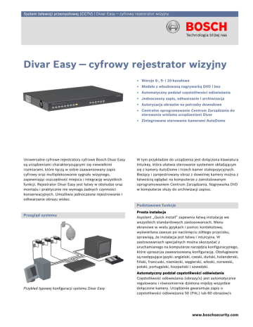 System telewizji przemysłowej (CCTV) | Divar Easy — cyfrowy rejestrator wizyjny Divar Easy — cyfrowy rejestrator wizyjny ▶ Wersje 6-, 9- i 16-kanałowe ▶ Modele z wbudowaną nagrywarką DVD i bez ▶ Automatyczny podział częstotliwości odświeżania ▶ Jednoczesny zapis, odtwarzanie i archiwizacja ▶ Autoryzacja obrazów na potrzeby dowodowe ▶ Centralne oprogramowanie Centrum Zarządzania do sterowania wieloma urządzeniami Divar ▶ Zintegrowane sterowanie kamerami AutoDome Uniwersalne cyfrowe rejestratory cyfrowe Bosch Divar Easy są urządzeniami charakteryzującymi się niewielkimi rozmiarami, które łączą w sobie zaawansowany zapis cyfrowy oraz multipleksowanie sygnału wizyjnego, zapewniając oszczędność miejsca i integrację wszystkich funkcji. Rejestrator Divar Easy jest łatwy w obsłudze oraz montażu i praktycznie nie wymaga żadnych czynności konserwacyjnych. Umożliwia jednoczesne rejestrowanie i odtwarzanie obrazu wideo. W tym przykładzie do urządzenia jest dołączona klawiatura Intuikey, która ułatwia sterowanie systemem składającym się z kamery AutoDome i trzech kamer stałopozycyjnych. Bieżący i zarejestrowany obraz z dowolnej kamery można z łatwością oglądać na komputerze z zainstalowanym oprogramowaniem Centrum Zarządzania. Nagrywarka DVD w komputerze służy do archiwizacji zapisu. Podstawowe funkcje Przegląd systemu Prosta instalacja Asystent „Quick install” zapewnia łatwą instalację we wszystkich standardowych zastosowaniach. Menu ekranowe w wielu językach i pomoc kontekstowa, wyświetlana zawsze po naciśnięciu żółtego przycisku, sprawiają, że instalacja jest łatwa i intuicyjna. W zastosowaniach specjalnych można skorzystać z uruchamianego na komputerze narzędzia konfiguracyjnego, które upraszcza zaawansowaną konfigurację. Obsługiwane są następujące języki: angielski, czeski, duński, holenderski, fiński, francuski, niemiecki, węgierski, włoski, norweski, polski, portugalski, hiszpański i szwedzki. Automatyczny podział częstotliwości odświeżania Przykład typowej konfiguracji systemu Divar Easy Częstotliwość odświeżania (obrazy/s) jest automatycznie regulowana i równomiernie dzielona między wszystkie dołączone kamery. Urządzenie gwarantuje zapis o częstotliwości odświeżania 50 (PAL) lub 60 obrazów/s www.boschsecurity.com 2 | Divar Easy — cyfrowy rejestrator wizyjny (NTSC) bez potrzeby synchronizacji. Ustawienie maksymalnej częstotliwości odświeżania umożliwia dynamiczne przeliczenie liczby obrazów na sekundę przy każdym dołączeniu lub odłączeniu kamery. Emisja EN 50022 Klasa B (CE), FCC, Klasa B część 15, EN 61000-3-2 (CE), EN 61000-3-3 (CE) Dyrektywa europejska Dyrektywa EMC 89/336/EEC Detektor ruchu Wykrycie ruchu w zdefiniowanym przez użytkownika obszarze obrazu powoduje uruchomienie układu detekcji ruchu Divar Easy. Alarmy mogą być wyzwalane przez urządzenia dołączone do wejść sterujących. Planowanie Autoryzacja obrazów na potrzeby dowodowe Jeśli zapisany materiał ma służyć jako dowód popełnionego wykroczenia, można w prosty sposób zarchiwizować obrazy na płycie CD lub DVD. Płyty posiadają wbudowane oprogramowanie do ich odtwarzania, uruchamiane po ich włożeniu do zwykłego komputera. Nie ma potrzeby instalowania żadnego specjalnego oprogramowania. Oprogramowanie do odtwarzania zawiera funkcję autoryzacji obrazu, która automatycznie wykrywa próby manipulacji w zapisanym materiale. Zdalne sterowanie za pomocą oprogramowania Centrum Zarządzania Łatwe w obsłudze oprogramowanie Centrum Zarządzania zapewnia pełną kontrolę. Umożliwia ono jednoczesny zdalny podgląd obrazów na żywo lub zapisanych przy użyciu wielu rejestratorów Divar. Ta cecha sprawia, iż rejestrator nadaje się idealnie do pracy w systemach instalowanych w wielu rozproszonych lokalizacjach, takich jak sieci sklepów czy sieci restauracji typu fast food. Bieżący, jak również zarchiwizowany obraz wideo można również przeglądać w przeglądarce internetowej, i to bez konieczności używania specjalnych narzędzi lub oprogramowania. Złącza (widok z tyłu) 1 Kamery 5 Klawiatura 2 Monitor 6 Sterowanie 3 Wejścia 7 Sieć Ethernet 4 Wyjścia 8 Zasilanie Rozbudowa Rejestrator Divar Easy może zostać rozbudowany o opcjonalną klawiaturę Intuikey, umożliwiającą łatwiejsze i pełniejsze sterowanie systemem, w tym zaawansowane sterowanie odtwarzaniem i kamerami AutoDome. Numer modelu (na tabliczce znamionowej) Sterowanie i wskaźniki • 4 przyciski do sterowania odtwarzaniem • 5 przycisków funkcyjnych • 6, 9 lub 16 przycisków kamer • 12 przycisków funkcji alternatywnych • 5 wskaźników (zapis, sieć, alarm, zanik sygnału wizyjnego, zasilanie) 3 I: Rejestrator Divar Easy bez wbudowanej nagrywarki DVD J: Rejestrator Divar Easy z wbudowaną nagrywarką DVD Możliwości współpracy z innymi urządzeniami Patrz „Uwagi dotyczące instalacji i konfiguracji” oraz „Dane techniczne”. Certyfikaty i świadectwa Standardy bezpieczeństwa UL 6500 2. wydanie, CSA-E60065, EN 60950 (CE) Odporność EN 50130-4 (CE) 1 Typ 2 Wejścia wizyjne 4 XXX to pojemność dysku w GB x 10 5 Wersja 6 Kod kraju (np. UK oznacza Wielką Brytanię) Divar Easy — cyfrowy rejestrator wizyjny | 3 Dołączone części Dane techniczne Ilość Element Parametry elektryczne 1 6-, 9- lub 16-kanałowy cyfrowy rejestrator wizyjny Divar Easy Zasilanie 1 Płytka drukowana z 25-stykowym złączem typu D z zaciskami śrubowymi (do podłączania wyjść przekaźnikowych i sygnałów alarmowych) Napięcie zasilania 100–240 VAC, 50/60 Hz Pobór prądu Wersje I Wersje J 0,3–0,7 A 0,3–0,8 A 1 Płytka drukowana z 15-stykowym złączem typu D z zaciskami śrubowymi (do podłączania sterowania PTZ kamery) 1 Przewód zasilający Sygnał wizyjny 1 Sieciowy kabel krosowy 1 Szeregowy kabel krosowy RS-232 (zeromodemowy) Standardy sygnału wizyjne- PAL / NTSC, automatyczne wykrywa