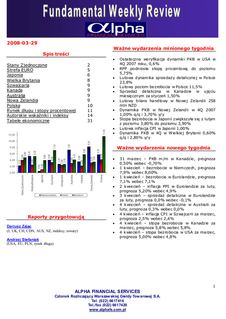 2008-03-29 Ważne wydarzenia minionego tygodnia Spis treści Stany Zjednoczone Strefa EURO Japonia Wielka Brytania Szwajcaria Kanada Australia Nowa Zelandia Polska Rynek dł ugu i stopy procentowej Autorskie wskaźniki i indeksy Tabele ekonomiczne 2 5 6 8 9 9 9 9 10 11 14 31 Ostate czna we ryfikacja dynamik i PKB w USA w 4Q 2007 roku, 0,6% RPP podniosł a stopę procentową do poziomu 5,75% Lutowa dynam ika sprze daży de taliczne j w Polsce 23,8% Lutowy poziom be zrobocia w Polsce 11,5% Sprzedaż de taliczna w Kanadzie w ujęciu mie sięcznym za styczeń1,50% Lutowy bilans handlowy w Nowe j Ze landii 258 mln NZD Dynamika PKB w Nowe j Ze landii w 4Q 2007 1,00% q/q i 3,70% y/y Stopa bezrobocia w Japonii zwiększył a sięz lutym z poziomu 3,80% do poziomu 3,90% Lutowa inflacja CPI w Japonii 1,00% Dynamika PKB w 4Q w W ie lkie j Brytanii 0,60% q/q i 2,80% y/y Ważne wydarzenia nowego tygodnia Raporty przygotowują Dariusz Zając (J, UK, CH, CDN, AUS, NZ, indeksy, towary) Andrzej Stefaniak (USA, EU, PLN, rynek dł ugu) 31 marze c – PKB m /m w Kanadzie , prognoza 0,50% wobe c -0,70% 1 k wie cień – bezrobocie w Niem cze ch, prognoza 7,9% wobe c 8,00% 1 k wie cie ń– bezrobocie w Eurolandzie , prognoza 7,1% wobe c 7,1% 2 k wie cień – inflacja PPI w Eurolandzie za luty, prognoza 5,20% wobe c 4,9% 3 k wie cień – sprze dażde taliczna w Eurolandzie za luty, prognoza 0,0% wobe c -0,1% 4 k wie cień – sprze dażde taliczna w Australii za luty, prognoza 0,3% wobe c 0,0% 4 k wie cie ń– inflacja CPI w Szwajcarii za marze c, prognoza 2,5% wobe c 2,4% 4 k wie cie ń – stopa bezrobocia w Kanadzie za marze c, prognoza 5,8% wobe c 5,8% 4 k wie cie ń– stopa bezrobocia w USA za marze c, prognoza 5,00% wobe c 4,8% 1 ALPHA FINANCIAL SERVICES Czł onek Rozliczający Warszaw skiej Gieł dy Tow arowej S.A. Tel. (022) 6617416 Tel./fax (022) 6617420 www.alphafs.com.pl Stany Zjednoczone Ostatni tydzień nie przynosi większej ilości danych makroekonomicznych. Najważniejszą publikacją był a ostatnia weryfikacja danych o dynamice wzrostu PKB w USA w IV kwartale 2007 roku, która okazał a siędokł adnie +0,6% taka sama jak prognoza +0,6 %. Oraz wskaźnik zaufania konsumentów za marzec 64,5 pkt, prognoza 75,0 pkt, w lutym 75,0 pkt Szczególnie te ostatnie dane okazał y siębardzo sł abe co oznacza, że inwestorzy zdyskontowali jużfakt, że dynamika wzrostu gospodarka USA w I kwartale 2008 roku przyjmie wartoś ci ujemne. Dane był y jużznane i nie miał y znaczenia dla inwestorów, którzy jużwcześniej je cał kowicie zdyskontowali. Sł absze od prognoz był y także dane o dynamice wzrostu zamówień na dobra trwał ego uż ytku +3,0 %, prognoza +5,5 %, w styczniu +5,0 %. Inwestorzy poznali także raporty na temat zaufania konsumentów. Pierwszy z nich to weryfikacja marcowego wskaźnika optymizmu konsumentów, który okazałsięniższy 69,5 pkt od prognoz 71,0 pkt, wcześniej 70,5 pkt Cotygodniowy raport z amerykańskiego rynku pracy okazałsię tylko nieco gorszy 366k, od prognoz 360k, lecz mniejszy niż dane tydzień wcześniej 378k. 2 ALPHA FINANCIAL SERVICES Czł onek Rozliczający Warszaw skiej Gieł dy Tow arowej S.A. Tel. (022) 6617416 Tel./fax (022) 6617420 www.alphafs.com.pl Dane z rynku pracy okazał y sięznów osiągać wartości ponad średnią dlatego dane z rynku pracy za marzec prawdopodobnie będąsł abe. Na końcu dane z rynku nieruchomości. Sprzedażnowych domów okazał a sięw lutym nieco lepsza 590k, od prognoz 575k, ale pozostał a na poziomie ze stycznia 588k Natomiast bardzo pozytywnie zaskoczył y dane o sprzedaż y domów na rynku wtórnym, która był a wyższa 5030k, nie tylko od prognoz 4850k, ale takż e od danych za styczeń4890k Dane był y zaskoczeniem co oznacza, ż e w kolejnych miesiącach należy je bacznie obserwować ponieważ mogą one potwierdzać hipotezęo oż ywieniu na rynku nieruchomości. W nadchodzącym tygodniu kluczowe będądane z rynku pracy za marzec. Prognozy zapowiadają wzrost poziomu bezrobocia do 5,0 %, w lutym 4,8 % Oraz zmianę zatrudnienia w sektorze pozarolniczym prognoza -40k, w lutym -63k. 3 ALPHA FINANCIAL SERVICES Czł onek Rozliczający Warszaw skiej Gieł dy Tow arowej S.A. Tel. (022) 6617416 Tel./fax (022) 6617420 www.alphafs.com.pl Wcześniej inwestorzy poznają wskaźnik ADP Employment prognoza -23k, w lutym -23k. Oraz sektor przemysł owy prognoza 48,2 pkt, w lutym 48,3 pkt. Cotygodniowe dane z rynku pracy był y gorsze od średniej dlatego należ y oczekiwać, ż e dane za marzec równieżbędągorsze od prognoz. Jeśli dane pokazał yby wzrost nad poziom 50 pkt, będąodebrane jako korzystne dla Dolara a przede wszystkim dla rynku akcji. Kolejne ciekawe dane to marcowe odczyty wskaźników ISM. Sektor usł ug, prognoza 49,2 pkt, w lutym 49,3 pkt C iekawy będzie takż e odczyt wskaźnika Chicago PMI, prognoza 46,7 pkt, w lutym 44,5 pkt. 4 ALPHA FINANCIAL SERVICES Czł onek Rozliczający Warszaw skiej Gieł dy Tow arowej S.A. Tel. (022) 6617416 Tel./fax (022) 6617420 www.alphafs.com.pl W nadchodzącym tygodniu najciekawsze będą dane o poziomie bezrobocia w lutym, prognoza 7,1 %, w styczniu 7,0 %. Dane te są ciekawe ponieważ ostatnie miesiące przyniosł y dynamiczny jego spadek. Inwestorzy poznają takż e lutową dynamikę wzrostu zamówień fabrycznych, prognoza +9,0 %, w styczniu +8,0 %. Bardzo wysokie odczyty to gł ównie poziomu niskiej bazy sprzed roku. efekt Strefa EURO W ubiegł ym tygodniu nie był o zbyt wielu ważnych danych z Eurolandu. Dane o sprzedaży detaliczne za luty prognoza 0,0 %, w styczniu -0,1 % Będąciekawe o tyle o ile w ostatnich miesiącach dał o się zauważyć dynamiczny spadek tego wskaźnika. Inwestorzy otrzymają takż e marcowy odczyt inflacji CPI, prognoza 3,3 %, w lutym 3,3 %. 5 ALPHA FINANCIAL SERVICES Czł onek Rozliczający Warszaw skiej Gieł dy Tow arowej S.A. Tel. (022) 6617416 Tel./fax (022) 6617420 www.alphafs.com.pl Oraz inflacje PPI za ten miesiąc, progno