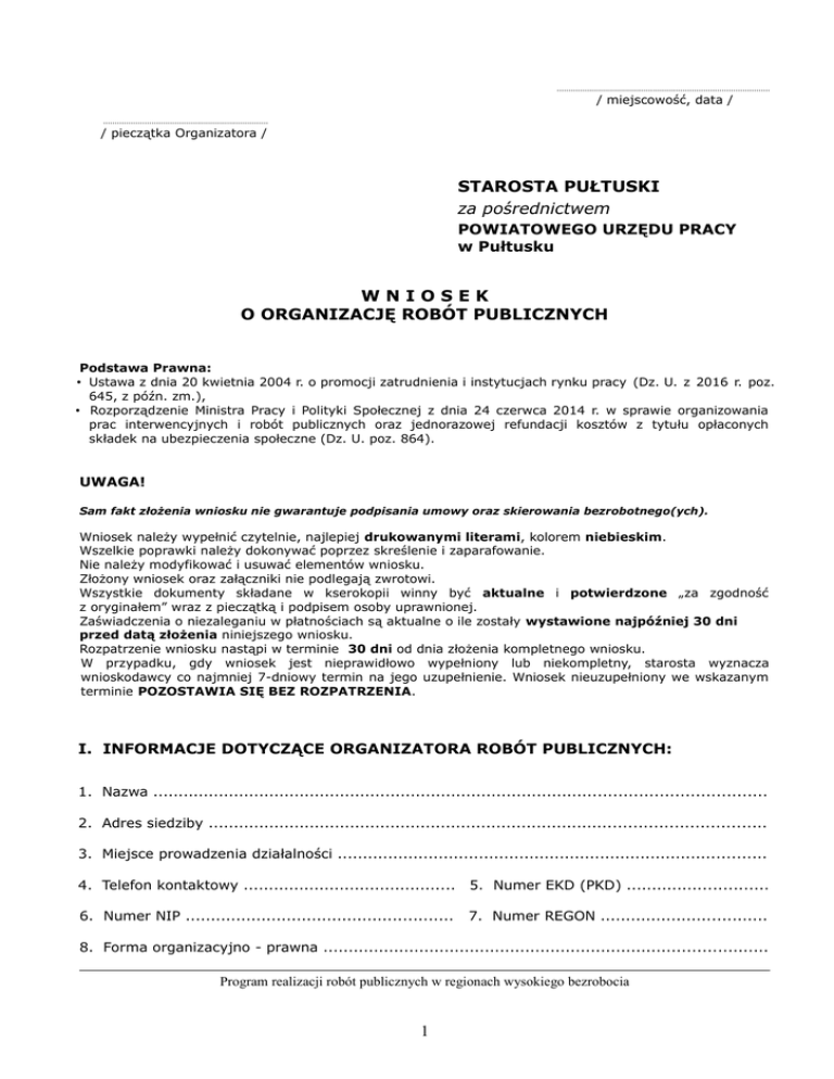 ………………………………………………………………………………… / miejscowość, data / ……………………………………………………………… / pieczątka Organizatora / STAROSTA PUŁTUSKI za pośrednictwem POWIATOWEGO URZĘDU PRACY w Pułtusku WNIOSEK O ORGANIZACJĘ ROBÓT PUBLICZNYCH Podstawa Prawna: • Ustawa z dnia 20 kwietnia 2004 r. o promocji zatrudnienia i instytucjach rynku pracy (Dz. U. z 2016 r. poz. 645, z późn. zm.), • Rozporządzenie Ministra Pracy i Polityki Społecznej z dnia 24 czerwca 2014 r. w sprawie organizowania prac interwencyjnych i robót publicznych oraz jednorazowej refundacji kosztów z tytułu opłaconych składek na ubezpieczenia społeczne (Dz. U. poz. 864). UWAGA! Sam fakt złożenia wniosku nie gwarantuje podpisania umowy oraz skierowania bezrobotnego(ych). Wniosek należy wypełnić czytelnie, najlepiej drukowanymi literami, kolorem niebieskim. Wszelkie poprawki należy dokonywać poprzez skreślenie i zaparafowanie. Nie należy modyfikować i usuwać elementów wniosku. Złożony wniosek oraz załączniki nie podlegają zwrotowi. Wszystkie dokumenty składane w kserokopii winny być aktualne i potwierdzone „za zgodność z oryginałem” wraz z pieczątką i podpisem osoby uprawnionej. Zaświadczenia o niezaleganiu w płatnościach są aktualne o ile zostały wystawione najpóźniej 30 dni przed datą złożenia niniejszego wniosku. Rozpatrzenie wniosku nastąpi w terminie 30 dni od dnia złożenia kompletnego wniosku. W przypadku, gdy wniosek jest nieprawidłowo wypełniony lub niekompletny, starosta wyznacza wnioskodawcy co najmniej 7-dniowy termin na jego uzupełnienie. Wniosek nieuzupełniony we wskazanym terminie POZOSTAWIA SIĘ BEZ ROZPATRZENIA. I. INFORMACJE DOTYCZĄCE ORGANIZATORA ROBÓT PUBLICZNYCH: 1. Nazwa ......................................................................................................................... 2. Adres siedziby .............................................................................................................. 3. Miejsce prowadzenia działalności ..................................................................................... 4. Telefon kontaktowy .......................................... 5. Numer EKD (PKD) ............................ 6. Numer NIP ..................................................... 7. Numer REGON ................................. 8. Forma organizacyjno - prawna ........................................................................................ Program realizacji robót publicznych w regionach wysokiego bezrobocia 1 II. ORGANIZATOR ROBÓT PUBLICZNYCH WSKAZUJE I UPOWAŻNIA DO ZAWARCIA UMOWY O ZORGANIZOWANIE ZATRUDNIENIA W RAMACH ROBÓT PUBLICZNYCH PRACODAWCĘ: Nazwa Pracodawcy ....................................................................................................... III. INFORMACJE DOTYCZĄCE PRACODAWCY: 1. Pełna nazwa ................................................................................................................. .................................................................................................................................. 2. Adres siedziby .............................................................................................................. ................................................................................................................................... 3. Miejsce prowadzenia działalności .................................................................................... 4. Telefon kontaktowy ........................................................................................................ 5. Data rozpoczęcia działalności ...................................... 6. Numer EKD (PKD) ................ 7. Numer NIP ............................................................... 8. Numer REGON...................... 9. Imię, nazwisko oraz stanowisko osoby uprawnionej do podpisania umowy ................................................................................................................................... 10. Forma organizacyjno - prawna ....................................................................................... 11. Wysokość składki na ubezpieczenie wypadkowe (%) ......................................................... 12. Imię, nazwisko oraz numer telefonu osoby wyznaczonej do współpracy z tut. Urzędem ................................................................................................................................... IV. INFORMACJA O PLANOWANYCH ROBOTACH PUBLICZNYCH: 1. Łączna liczba bezrobotnych proponowanych do zatrudnienia .............................................. 2. Proponowany okres zatrudnienia bezrobotnych w ramach robót publicznych........................., tj. od dnia ................................ do dnia ............................... (ilość miesięcy) (maks. 6 m-cy) 3. Bezpośrednio po okresie refundacji zobowiązuję się do zatrudnienia 1 w ramach ............................................ - ..................... na okres .............................................. 2 (rodzaj umowy) (ilość osób) (ilość miesięcy) 3. Termin wypłaty wynagrodzeń .......................................................................................... 1 2 zatrudnienie – oznacza to wykonywanie pracy na podstawie stosunku pracy, stosunku służbowego oraz umowy o pracę nakładczą. w przypadku zatrudnienia w ramach robót publicznych na okres do 6 miesięcy pracodawca jest obowiązany do utrzymywania w zatrudnieniu skierowanego bezrobotnego przez okres 3 miesięcy po zakończeniu refundacji; 2 KOD ZAWODU (zgodnie z aktualną klasyfikacją zawodów i specjalności) NAZWA STANOWISKA PRACY (nie ulega zmianie w umowie o pracę) ILOŚĆ OSÓB RODZAJ WYKONYWANYCH PRAC ZAKRES WYKONYWANYCH CZYNNOŚCI NIEZBĘDNE lub POŻĄDANE KWALIFIKACJE i inne wymogi ORGANIZACJA CZASU PRACY (je