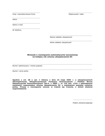 ................................................ Imię i nazwisko/nazwa firmy ……………………………………………… Miejscowość i data ................................................ Adres ................................................ Adres e-mail ................................................ Nr telefonu ......................................................................... Nazwa zakładu ubezpieczeń ......................................................................... Adres zakładu ubezpieczeń Wniosek o rozwiązanie automatycznie wznowionej na kolejny rok umowy ubezpieczenia OC .......................................................................................................................................... Numer rejestracyjny i marka pojazdu .......................................................................................................................................... Numer i seria polisy Zgodnie z art. 28 a ust. 1 Ustawy z dnia 22 maja 2003 r. o ubezpieczeniach obowiązkowych, Ubezpieczeniowym Funduszu Gwarancyjnym i Polskim Biurze Ubezpieczycieli Komunikacyjnych (Dz.U. z 2003 r. nr 124 poz. 1152 z późniejszymi zmianami) wypowiadam umowę ubezpieczenia OC o wskazanym powyżej numerze polisy. Proszę o rozwiązanie umowy w trakcie jej trwania, z dniem złożenia wypowiedzenia. ……………………………………… Podpis ubezpieczającego
