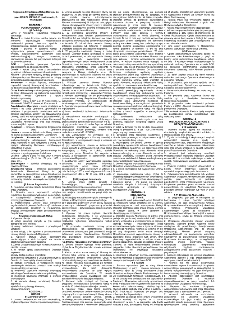 Regulamin Świadczenia Usług Dostępu do sieci Internet przez RES.PL ISP S.C. P. Kosiorowski, D. Wiśniowski ROZDZIAŁ 1 POSTANOWIENIA OGÓLNE §1 Definicje Użyte w niniejszym Regulaminie wyrażenia oznaczają: Abonent – osoba fizyczna, osoba prawna lub jednostka organizacyjna nieposiadająca osobowości prawnej utworzona zgodnie z przepisami prawa, będąca stroną Umowy. Awaria – przerwa w działaniu Usługi, z wyłączeniem przerw spowodowanych siłą wyższą, nieprawidłowym działaniem sieci telekomunikacyjnej innego operatora, planowanymi pracami lub przyczynami leżącymi po stronie Abonenta. BOK jednostka operacyjna Operatora odpowiedzialna za obsługę Abonenta. Cennik – wykaz Usług wraz z zestawieniem wysokości opłat oraz zasadami ich naliczania. Faktura – dokument księgowy będący podstawą dokonywania przez Abonenta płatności za Usługę świadczoną na jego rzecz przez Operatora. Konsument – osoba fizyczna, dokonująca czynności prawnej niezwiązanej bezpośrednio z jej działalnością gospodarczą lub zawodową. Okres Rozliczeniowy – okres jednego miesiąca, za który dokonywane są rozliczenia należności Abonenta wobec Operatora z tytułu świadczonych usług Operator – RES.PL ISP S.C. P. Kosiorowski, D. Wiśniowski, 35-065 Rzeszów, ul. Kreczmera 4 Przedstawiciel Operatora – osoba działająca w imieniu i na rzecz Operatora, uprawniona do składania i przyjmowania oświadczeń woli w zakresie zawierania, zmiany lub rozwiązywania Umowy, bądź też wykonywania jej postanowień, w szczególności w zakresie wydania Abonentowi Urządzenia Abonenckiego oraz jego instalacji, konserwacji lub napraw. Regulamin – niniejszy Regulamin Świadczenia Usług przez Operatora Umowa – umowa o świadczenie Usług zawarta na piśmie pomiędzy Abonentem i Operatorem. Urządzenie Abonenckie – urządzenie telekomunikacyjne udostępnione Abonentowi przez Operatora w celu korzystania z Usługi, lub będące własnością Abonenta- umożliwiające korzystanie z Usługi. Usługa – świadczona przez Operatora usługa lub związana z tą usługą usługa dodatkowa. Ustawa – ustawa z dnia 16 lipca 2004 r. Prawo telekomunikacyjne (Dz.U. Nr 171 poz. 1800 z poźn. zm.). Zamawiający – podmiot ubiegający się o zawarcie Umowy. Zawieszenie Usługi – okresowe zaprzestanie świadczenia Abonentowi Usługi lub jej elementów, w szczególności usług dodatkowych lub pojedynczego Łącza z jednoczesną rezerwacją zasobów sieciowych niezbędnych do jej realizacji. §2 Zakres Regulaminu 1. Regulamin określa zasady świadczenia Usług przez Operatora. 2. Operator może wprowadzić odrębne regulaminy dla świadczonych przez siebie Usług, w szczególności związane z akcjami promocyjnymi (Warunki Promocji). 3. Postanowienia Umowy oraz odrębnych regulaminów lub „Warunków Promocji” odmienne od postanowień zawartych w Regulaminie, znajdują pierwszeństwo przed postanowieniami Regulaminu. §3 Zakres świadczonych Usług 1. Operator oferuje: a) usługi transmisji danych, w tym stałego dostępu do sieci Internet; b) usługi dodatkowe związane z powyższymi usługami; c) inne usługi, o ile zgodnie z postanowieniami Umowy stosuje się do nich Regulamin. 2. Operator oferuje Usługi podmiotom zamierzającym z nich korzystać na terenie objętym swoim zakresem działania. 3. Zakres Usług świadczonych na rzecz Abonenta określa Umowa. 4. W ramach opłaty abonamentowej Operator zapewnia: a) stały dostęp do Sieci Operatora; b) możliwość korzystania z Usług przypisanych w Cenniku do danej opłaty abonamentowej; c) obsługę serwisową, z wyłączeniem usług serwisowych dodatkowo płatnych oraz obsługi nieuzasadnionych wezwań. d) możliwość uzyskania informacji dotyczącej aktualnego Cennika oraz świadczonych Usług; e) możliwość uzyskania informacji o ofertach promocyjnych. 5. W ramach obsługi serwisowej Operator zapewnia: a) telefoniczną obsługę Abonenta; b) usuwanie Awarii; ROZDZIAŁ 2 UMOWA §4 Zawarcie Umowy 1. Umowa zawierana jest na czas nieokreślony, chyba że Operator i Abonent postanowią inaczej. 2. Umowa zawarta na czas określony, równy lub dłuższy niż 30 dni, ulega po upływie okresu, na jaki została zawarta, automatycznemu przedłużeniu na czas nieokreślony, chyba że Abonent na co najmniej 14 dni przed datą upływu okresu obowiązywania Umowy złoży w siedzibie Operatora lub listownie pisemne oświadczenie o braku woli przedłużenia Umowy. 3. W przypadku zawierania Umowy z Konsumentem poza lokalem przedsiębiorstwa Operatora lub na odległość, Abonent ma prawo odstąpienia od Umowy bez podawania przyczyny, w terminie 10 dni od daty zawarcia Umowy, składając osobiście lub listownie w siedzibie Operatora stosowne oświadczenie na piśmie. 4. W przypadku zawierania Umowy z osobą fizyczną Operator będzie gromadzić w swojej bazie i przetwarzać, w celu wykonania Umowy, oraz w celu wypełnienia prawnie usprawiedliwionych celów realizowanych przez Operatora, dane Abonenta zawarte w Umowie, przekazane Operatorowi przez Abonenta w trakcie wykonywania Umowy, a także dane związane z Usługą niezbędne m.in. dla prawidłowego jej rozliczania. Abonent ma prawo dostępu do treści swoich danych osobowych i ich poprawiania. 5. Wskutek zawarcia Umowy Operator zobowiązuje się do świadczenia Usług na zasadach określonych w Umowie, Regulaminie, Cenniku oraz – jeśli Umowa jest zawierana w ramach akcji promocyjnej – Warunków Promocji, a Abonent zobowiązuje się do przestrzegania postanowień Umowy, Regulaminu, Cennika oraz Warunków Promocji, w szczególności do terminowego uiszczania opłat za Usługi. 6. Operator ma prawo odmowy zawarcia Umowy w przypadku: a) braku możliwości technicznych świadczenia Usługi; b) niespełnienia warunków wynikających z Regulaminu, w szczególności dotyczących przedstawienia dokumentów określonych w § 5; c) gdy podmiot inny niż osoba fizyczna odmówi przekazania Operatorow