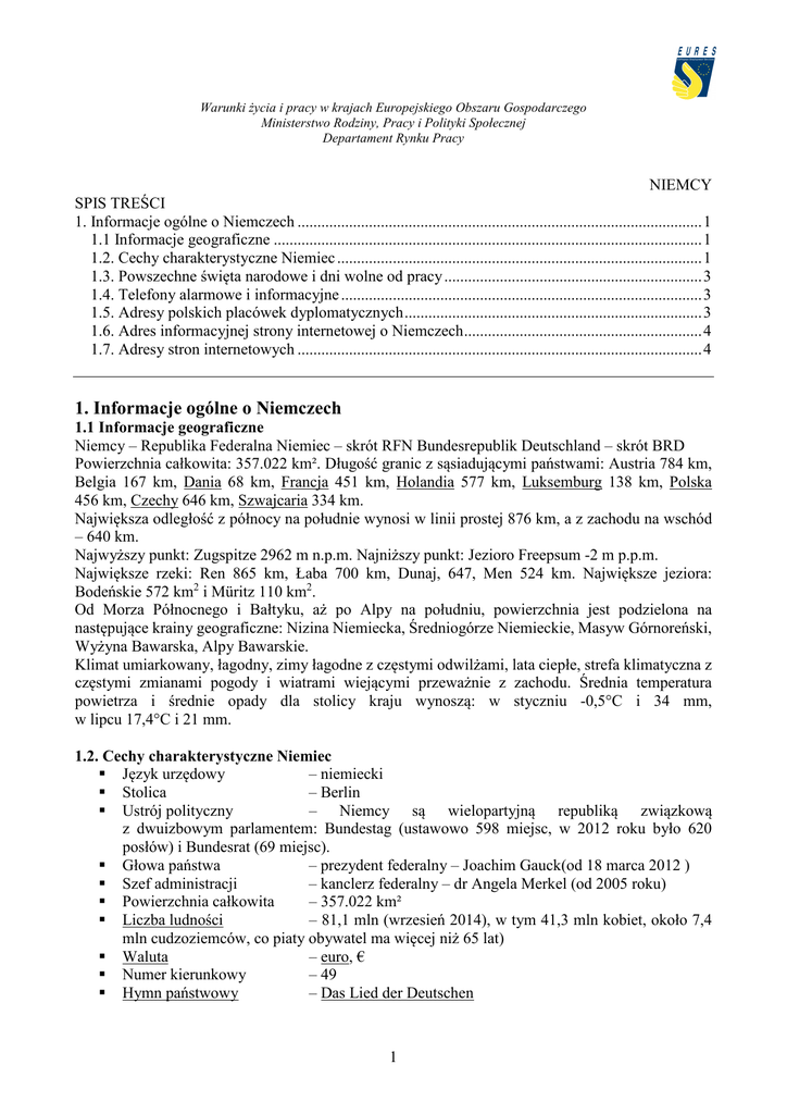Warunki życia i pracy w krajach Europejskiego Obszaru Gospodarczego Ministerstwo Rodziny, Pracy i Polityki Społecznej Departament Rynku Pracy NIEMCY SPIS TREŚCI 1. Informacje ogólne o Niemczech ...................................................................................................... 1 1.1 Informacje geograficzne ............................................................................................................ 1 1.2. Cechy charakterystyczne Niemiec ............................................................................................ 1 1.3. Powszechne święta narodowe i dni wolne od pracy ................................................................. 3 1.4. Telefony alarmowe i informacyjne ........................................................................................... 3 1.5. Adresy polskich placówek dyplomatycznych ........................................................................... 3 1.6. Adres informacyjnej strony internetowej o Niemczech ............................................................ 4 1.7. Adresy stron internetowych ...................................................................................................... 4 1. Informacje ogólne o Niemczech 1.1 Informacje geograficzne Niemcy – Republika Federalna Niemiec – skrót RFN Bundesrepublik Deutschland – skrót BRD Powierzchnia całkowita: 357.022 km². Długość granic z sąsiadującymi państwami: Austria 784 km, Belgia 167 km, Dania 68 km, Francja 451 km, Holandia 577 km, Luksemburg 138 km, Polska 456 km, Czechy 646 km, Szwajcaria 334 km. Największa odległość z północy na południe wynosi w linii prostej 876 km, a z zachodu na wschód – 640 km. Najwyższy punkt: Zugspitze 2962 m n.p.m. Najniższy punkt: Jezioro Freepsum -2 m p.p.m. Największe rzeki: Ren 865 km, Łaba 700 km, Dunaj, 647, Men 524 km. Największe jeziora: Bodeńskie 572 km2 i Müritz 110 km2. Od Morza Północnego i Bałtyku, aż po Alpy na południu, powierzchnia jest podzielona na następujące krainy geograficzne: Nizina Niemiecka, Średniogórze Niemieckie, Masyw Górnoreński, Wyżyna Bawarska, Alpy Bawarskie. Klimat umiarkowany, łagodny, zimy łagodne z częstymi odwilżami, lata ciepłe, strefa klimatyczna z częstymi zmianami pogody i wiatrami wiejącymi przeważnie z zachodu. Średnia temperatura powietrza i średnie opady dla stolicy kraju wynoszą: w styczniu -0,5°C i 34 mm, w lipcu 17,4°C i 21 mm. 1.2. Cechy charakterystyczne Niemiec Język urzędowy – niemiecki Stolica – Berlin Ustrój polityczny – Niemcy są wielopartyjną republiką związkową z dwuizbowym parlamentem: Bundestag (ustawowo 598 miejsc, w 2012 roku było 620 posłów) i Bundesrat (69 miejsc). Głowa państwa – prezydent federalny – Joachim Gauck(od 18 marca 2012 ) Szef administracji – kanclerz federalny – dr Angela Merkel (od 2005 roku) Powierzchnia całkowita – 357.022 km² Liczba ludności – 81,1 mln (wrzesień 2014), w tym 41,3 mln kobiet, około 7,4 mln cudzoziemców, co piaty obywatel ma więcej niż 65 lat) Waluta – euro, € Numer kierunkowy – 49 Hymn państwowy – Das Lied der Deutschen 1 Warunki życia i pracy w krajach Europejskiego Obszaru Gospodarczego Ministerstwo Rodziny, Pracy i Polityki Społecznej Departament Rynku Pracy Domena internetowa Kod samochodowy – de –D Ważniejsze miasta – liczba mieszkańców Berlin (stolica) 3.275.000 Hamburg 1.686.100 Monachium (München) 1.185.400 Kolonia (Köln) 1.007.100 Frankfurt nad Menem (Frankfurt am Main) 688.700 Stuttgart 606.600 Podział administracyjny Republika Federalna Niemiec składa się z 16 krajów związkowych tzw. landów, które posiadają autonomiczną aczkolwiek ograniczona władzę państwową: 1. Badenia-Wirtembergia (Baden-Württemberg) 2. Bawaria (Freistaat Bayern) 3. Berlin 4. Brandenburgia (Brandenburg) 5. Brema (Bremen) 6. Dolna Saksonia (Niedersachsen) 7. Hamburg 8. Hesja (Hessen) 9. Saara (Saarland) 10. Meklemburgia-Pomorze Przednie (Mecklenburg-Vorpommern) 11. Nadrenia Północna-Westfalia (Nordrhein-Westfalen) 12. Nadrenia-Palatynat (Rheinland-Pfalz) 13. Saksonia (Freistaat Sachsen) 14. Saksonia-Anhalt (Sachsen-Anhalt) 15. Szlezwik-Holsztyn (Schleswig-Holstein) 16. Turyngia (Freistaat Thüringen) Grupy etniczne W Niemczech żyje ok. 8,2 mln cudzoziemców, którzy stanowią 10,1 % ludności. Największe grupy narodowe to: Turcy, Serbowie, Chorwaci, Włosi, Polacy, Rosjanie, Grecy i Hiszpanie. Polaków wg oficjalnych statystyk mieszka w Niemczech ok. 670 tys. W ostatnim czasie stale zwiększa się liczba uchodźców z takich krajów jak: Syria, Liban, Afganistan, Libia, Erytrea. W Niemczech uznane są 4 mniejszości narodowe: duńska, serbołużycka, fryzyjska oraz niemieccy Romowie i Sinti. Niemcy uznają za mniejszości zasiedziałe grupy narodowe, a nie młode społeczności emigrantów. Północ, kraj związkowy Szlezwik-Holsztyn zamieszkują Duńczycy, Dolną Saksonię i SzlezwikHolsztyn Fryzowie, Saksonię i Brandenburgię – Serbołużyczanie, a cały teren Niemiec - Cyganie (Sinti i Romowie). Niemcy odrzucają koncepcję tzw. nowych mniejszości, tworzonych przez imigrację ekonomiczną i nie uznają za mniejszości narodowe zamieszkujących w RFN Polaków, Turków, Kurdów czy Marokańczyków. 2 Warunki życia i pracy w krajach Europejskiego Obszaru Gospodarczego Ministerstwo Rodziny, Pracy i Polityki Społecznej Departament Rynku Pracy Grupy religijne: Prawie 51 mln ludności wyznaje religię chrześcijańską (mniej więcej po połowie katolików i protestantów, północ kraju to protestanci, a południe to raczej katolicy) , 4 mln to muzułmanie, 270 tys. – buddyści, 60 tys. Żydzi, 80 tys. Hindusi, 22 mln ateistów i bezwyznaniowców. 1.3. Powszechne święta narodowe i dni wolne od pracy 1 stycznia – Nowy Rok marzec/kwiecień – Wielki Piątek marzec/kwiecień – Poniedziałek Wielkanocny 1 maja – Święto Pracy maj/czerwiec – Wniebowstąpienie Chrystusa, 39 dni p