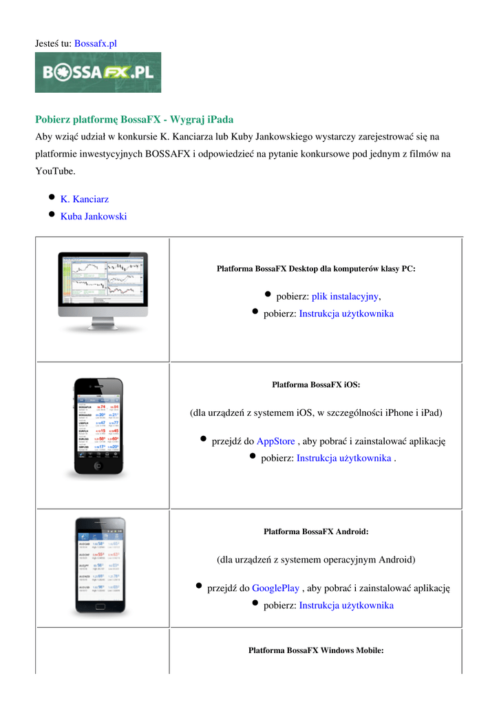 Jesteś tu: Bossafx.pl Pobierz platformę BossaFX - Wygraj iPada Aby wziąć udział w konkursie K. Kanciarza lub Kuby Jankowskiego wystarczy zarejestrować się na platformie inwestycyjnych BOSSAFX i odpowiedzieć na pytanie konkursowe pod jednym z filmów na YouTube. K. Kanciarz Kuba Jankowski Platforma BossaFX Desktop dla komputerów klasy PC: pobierz: plik instalacyjny, pobierz: Instrukcja użytkownika Platforma BossaFX iOS: (dla urządzeń z systemem iOS, w szczególności iPhone i iPad) przejdź do AppStore , aby pobrać i zainstalować aplikację pobierz: Instrukcja użytkownika . Platforma BossaFX Android: (dla urządzeń z systemem operacyjnym Android) przejdź do GooglePlay , aby pobrać i zainstalować aplikację pobierz: Instrukcja użytkownika Platforma BossaFX Windows Mobile: (dla urządzeń z systemem Windows Mobile, posiadających ekran dotykowy) pobierz: plik instalacyjny pobierz: Instrukcja użytkownika (dla urządzeń z systemem Windows Mobile, nie posiadających ekranu dotykowego) pobierz: plik instalacyjny pobierz: Instrukcja użytkownika Każda z ww. platrform pozwala na zalogowanie się do rachunku demo w systemie transakcyjnym BOSSAFX.