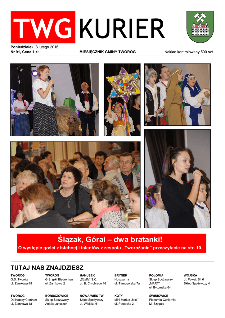 TWG KURIER Poniedziałek, 8 lutego 2016 Nr 91, Cena 1 zł MIESIĘCZNIK GMINY TWORÓG Nakład kontrolowany 500 szt. Ślązak, Góral – dwa bratanki! O występie gości z Istebnej i talentów z zespołu „Tworożanie” przeczytacie na str. 10. TUTAJ NAS ZNAJDZIESZ TWORÓG G.S. Tworóg ul. Zamkowa 45 TWORÓG G.S. (pkt Biedronka) ul. Zamkowa 2 HANUSEK „Dżelfa” S.C. ul. B. Chrobrego 16 BRYNEK Husqvarna ul. Tarnogórska 7a POŁOMIA Sklep Spożywczy „MART” ul. Bytomska 64 TWORÓG Delikatesy Centrum ul. Zamkowa 18 BORUSZOWICE Sklep Spożywczy Aniela Lukoszek NOWA WIEŚ TW. Sklep Spożywczy ul. Wiejska 61 KOTY Mini Market „Mix” ul. Potępska 2 ŚWINIOWICE Piekarnia-Cukiernia M. Szyguła WOJSKA ul. Powst. Śl. 6 Sklep Spożywczy 4 TWG KURIER R E TABLICA K L A M A 2 TWG KURIER WSTĘPNIAK OD REDAKCJI SPIS TREŚCI DRODZY MIESZKAŃCY, TABLICA………………………………………………….str.2 SESJA …………………………………………………....str.4 – Rekrutacja do klas pierwszych – Ciągle pamiętamy – Niezbędnik Mieszkańca Gminy POD LUPĄ ……………………………………………....str.5 – Noworoczne toasty – Karnawałowe wygibasy – Dla babci i dziadka w przedszkolu w Wojsce HOBBYSTA ……………………………………………...str.7 – Zwierzęta, które leczą – Mamy roczek – 1% dla OSP – „Przyszywana” babcie z pędzlem KULTURALNIE………………………………….…..…str.10 – Nastrojowe popołudnie z Damianem Holeckim – Ślązak, góral – dwa bratanki – Wieczór z Arturem Andrusem – Wyśpiewane sukcesy w przeglądzie wojewódzkim – Babiniec 2016 – znamy już datę! – Szlakiem kapliczek i przydrożnych krzyży cz. 1 – Luperkus, Walenty i skwer w Tworogu NA BIEŻĄCO………………………………….……….str.13 – Gimnazjum w Brynku wyjaśnia – Niemiecka przygoda – Apel o pomoc dla Darka – Fotograficzny skrót wydarzeń – Wielki powrót do Edenu! Podczas sesji nadzwyczajnej podjęto m.in. uchwałę w sprawie wprowadzenia zasad rekrutacji do klas pierwszych szkół podstawowych. Czy dzieci mieszkające poza obwodem szkolnym będą przyjęte? Więcej w dziale „Sesja”. Styczeń obfitował w spotkania noworoczne, występy dla dziadków, bale przebierańców i koncerty kolędowe. W dziale „Pod lupą” wspominamy kilka z nich. W tym numerze rozpoczynamy cykl artykułów poświęconych kapliczkom gminnym. Zachęcamy Was do współtworzenia rubryki poprzez przesyłanie starych zdjęć lub opisów kapliczek, które nieraz wiążą się z rodzinną historią lub zapomnianym wydarzeniem. Czekamy na wasze maile! Wygląda jak krzyżówka owcy z żyrafą. Ma miękką, delikatną wełnę, nosi zabawne „fryzury”, patrzy wielkimi, ciemnymi oczami i ma zabójczo długie rzęsy. Potrafi pluć, podobnie jak lama, ale robi to tylko w ostateczności… O kim mowa? To oczywiście urocza alpaka, która każdemu potrafi poprawić humor. Kto je hoduje i dlaczego? Czytaj w dziale „Hobbysta”. Zapraszamy do lektury! www.twg-kurier.pl [email protected] REDAKTOR NACZELNA Marta Kobędza-Krain KREACJA Łukasz Krain GOŚCINNIE Alicja Niedworok MECENAT Grażyna Chmiel – dyrektor Gminnego Ośrodka Kultury WYDAWCA Gminny Ośrodek Kultury w Tworogu, ul. Zamkowa 1, 42-690 Tworóg, tel. (32) 285 74 92 DRUK Foto&druk www.fotoidruk.pl Redakcja zastrzega sobie prawo do redagowania i skracania tekstów przesyłanych do druku. 3 TWG KURIER SESJA REKRUTACJA DO KLAS PIERWSZYCH CIĄGLE PAMIĘTAMY… Na mocy ustawy z dnia 6 grudnia 2013 r. o zmianie ustawy o systemie oświaty oraz niektórych innych ustaw zostały wprowadzone zasady rekrutacji do klas pierwszych szkół podstawowych. Kandydaci zamieszkali w obwodzie szkół podstawowych są przyjmowani tak jak dotychczas, na podstawie zgłoszenia. Kandydatów mieszkających poza obwodem obejmuje postępowanie rekrutacyjne, jego kryteria określiła Rada Gminy Tworóg. Odpowiednia uchwała w tej sprawie została podjęta podczas sesji nadzwyczajnej 29 stycznia. Kryterium Maksymal na liczba punktów Dokumenty niezbędne do potwierdzenia kryteriów Rodzeństwo kandydata realizuje obowiązek szkolny w tej szkole 16 pkt Oświadczenie rodziców o uczęszczaniu rodzeństwa kandydata do tej samej szkoły Rodzeństwo kandydata uczęszcza do przedszkola w obwodzie szkoły 8 pkt Miejsce pracy rodziców znajduje się w obwodzie szkoły 4 pkt Osoby, które wspierają rodziców w zapewnieniu należytej opieki kandydatowi, mieszkają w obwodzie szkoły 2 pkt Kiedy w 1945 r. wkroczyła na teren Śląska Armia Czerwona, rozpoczął się czas mordów, gwałtów, grabieży… Czas, który do historii przeszedł jako „Tragedia Górnośląska”. Do Tworoga Sowieci dotarli 22 stycznia. Wielu deportowano i zmuszono do pracy w ciężkich warunkach w donieckich kopalniach. Wrócił co piąty wywieziony. Mężczyźni z Tworoga także padli ofiarą Armii Czerwonej. Wiele kobiet bezradnie patrzyło jak ich mężowie znikają za horyzontem. Niestety większość już nie wróciła. Oświadczenie rodziców o uczęszczaniu rodzeństwa kandydata do przedszkola w obwodzie Pamiętamy o nich. Podczas styczniowej sesji nadzwyczajnej, wójt oraz radni i Fryderyk Zgodzaj (autor wieńca) złożyli znicze i wieniec oddając część przy pomniku poświęconym ofiarom wojen, internowań, wywózek i prześladowań. Powyższe zdjęcie udostępnił Fryderyk Zgodzaj. Zaświadczenie pracodawcy o zatrudnieniu, zaświadczenie o wykonywaniu pracy na podstawie umowy cywilno-prawnej, wydruk ze strony internetowej Centralnej Ewidencji i Informacji o Działalności Gospodarczej albo informacja z Krajowego Rejestru Sądowego NIEZBĘDNIK MIESZKAŃCA GMINY, czyli przegląd informacji z sesji nadzwyczajnej Rady Gminy Tworóg z 29 stycznia 2016 r.: – podjęto uchwałę w sprawie określenia kryteriów w postępowaniu rekrutacyjnym dla kandydatów zamieszkałych poza obwodem szkoły, do klas pierws