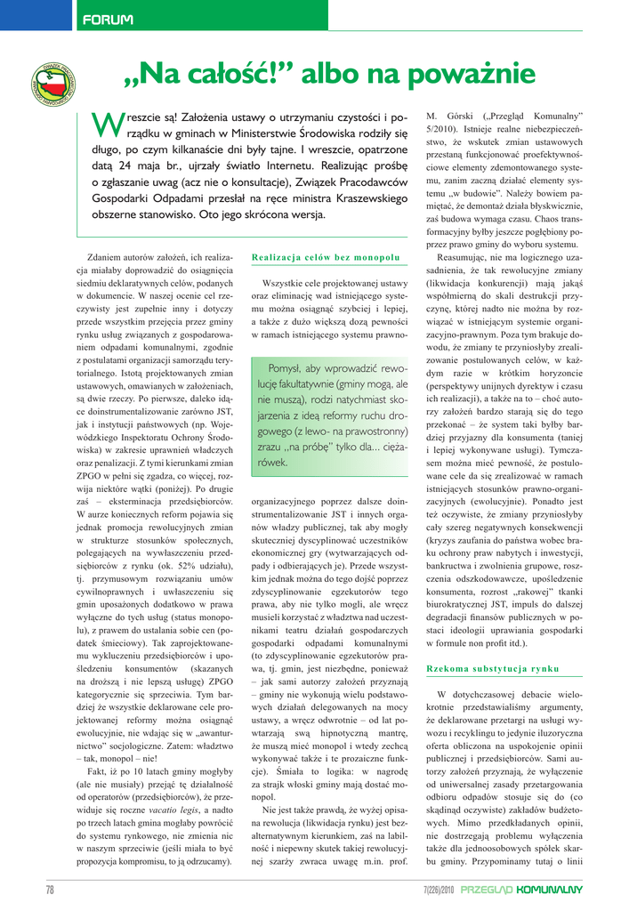 FORUM „Na całość!” albo na poważnie W reszcie są! Założenia ustawy o utrzymaniu czystości i porządku w gminach w Ministerstwie Środowiska rodziły się długo, po czym kilkanaście dni były tajne. I wreszcie, opatrzone datą 24 maja br., ujrzały światło Internetu. Realizując prośbę o zgłaszanie uwag (acz nie o konsultacje), Związek Pracodawców Gospodarki Odpadami przesłał na ręce ministra Kraszewskiego obszerne stanowisko. Oto jego skrócona wersja. Zdaniem autorów założeń, ich realizacja miałaby doprowadzić do osiągnięcia siedmiu deklaratywnych celów, podanych w dokumencie. W naszej ocenie cel rzeczywisty jest zupełnie inny i dotyczy przede wszystkim przejęcia przez gminy rynku usług związanych z gospodarowaniem odpadami komunalnymi, zgodnie z postulatami organizacji samorządu terytorialnego. Istotą projektowanych zmian ustawowych, omawianych w założeniach, są dwie rzeczy. Po pierwsze, daleko idące doinstrumentalizowanie zarówno JST, jak i instytucji państwowych (np. Wojewódzkiego Inspektoratu Ochrony Środowiska) w zakresie uprawnień władczych oraz penalizacji. Z tymi kierunkami zmian ZPGO w pełni się zgadza, co więcej, rozwija niektóre wątki (poniżej). Po drugie zaś – eksterminacja przedsiębiorców. W aurze koniecznych reform pojawia się jednak promocja rewolucyjnych zmian w strukturze stosunków społecznych, polegających na wywłaszczeniu przedsiębiorców z rynku (ok. 52% udziału), tj. przymusowym rozwiązaniu umów cywilnoprawnych i uwłaszczeniu się gmin uposażonych dodatkowo w prawa wyłączne do tych usług (status monopolu), z prawem do ustalania sobie cen (podatek śmieciowy). Tak zaprojektowanemu wykluczeniu przedsiębiorców i upośledzeniu konsumentów (skazanych na droższą i nie lepszą usługę) ZPGO kategorycznie się sprzeciwia. Tym bardziej że wszystkie deklarowane cele projektowanej reformy można osiągnąć ewolucyjnie, nie wdając się w „awanturnictwo” socjologiczne. Zatem: władztwo – tak, monopol – nie! Fakt, iż po 10 latach gminy mogłyby (ale nie musiały) przejąć tę działalność od operatorów (przedsiębiorców), że przewiduje się roczne vacatio legis, a nadto po trzech latach gmina mogłaby powrócić do systemu rynkowego, nie zmienia nic w naszym sprzeciwie (jeśli miała to być propozycja kompromisu, to ją odrzucamy). 78 Realiz a c j a c e l ó w b e z m o n o p o l u Wszystkie cele projektowanej ustawy oraz eliminację wad istniejącego systemu można osiągnąć szybciej i lepiej, a także z dużo większą dozą pewności w ramach istniejącego systemu prawno- Pomysł, aby wprowadzić rewolucję fakultatywnie (gminy mogą, ale nie muszą), rodzi natychmiast skojarzenia z ideą reformy ruchu drogowego (z lewo- na prawostronny) zrazu ,,na próbę’’ tylko dla... ciężarówek. organizacyjnego poprzez dalsze doinstrumentalizowanie JST i innych organów władzy publicznej, tak aby mogły skuteczniej dyscyplinować uczestników ekonomicznej gry (wytwarzających odpady i odbierających je). Przede wszystkim jednak można do tego dojść poprzez zdyscyplinowanie egzekutorów tego prawa, aby nie tylko mogli, ale wręcz musieli korzystać z władztwa nad uczestnikami teatru działań gospodarczych gospodarki odpadami komunalnymi (to zdyscyplinowanie egzekutorów prawa, tj. gmin, jest niezbędne, ponieważ – jak sami autorzy założeń przyznają – gminy nie wykonują wielu podstawowych działań delegowanych na mocy ustawy, a wręcz odwrotnie – od lat powtarzają swą hipnotyczną mantrę, że muszą mieć monopol i wtedy zechcą wykonywać także i te prozaiczne funkcje). Śmiała to logika: w nagrodę za strajk włoski gminy mają dostać monopol. Nie jest także prawdą, że wyżej opisana rewolucja (likwidacja rynku) jest bezalternatywnym kierunkiem, zaś na labilność i niepewny skutek takiej rewolucyjnej szarży zwraca uwagę m.in. prof. M. Górski („Przegląd Komunalny” 5/2010). Istnieje realne niebezpieczeństwo, że wskutek zmian ustawowych przestaną funkcjonować proefektywnościowe elementy zdemontowanego systemu, zanim zaczną działać elementy systemu „w budowie”. Należy bowiem pamiętać, że demontaż działa błyskwicznie, zaś budowa wymaga czasu. Chaos transformacyjny byłby jeszcze pogłębiony poprzez prawo gminy do wyboru systemu. Reasumując, nie ma logicznego uzasadnienia, że tak rewolucyjne zmiany (likwidacja konkurencji) mają jakąś współmierną do skali destrukcji przyczynę, której nadto nie można by rozwiązać w istniejącym systemie organizacyjno-prawnym. Poza tym brakuje dowodu, że zmiany te przyniosłyby zrealizowanie postulowanych celów, w każdym razie w krótkim horyzoncie (perspektywy unijnych dyrektyw i czasu ich realizacji), a także na to – choć autorzy założeń bardzo starają się do tego przekonać – że system taki byłby bardziej przyjazny dla konsumenta (taniej i lepiej wykonywane usługi). Tymczasem można mieć pewność, że postulowane cele da się zrealizować w ramach istniejących stosunków prawno-organizacyjnych (ewolucyjnie). Ponadto jest też oczywiste, że zmiany przyniosłyby cały szereg negatywnych konsekwencji (kryzys zaufania do państwa wobec braku ochrony praw nabytych i inwestycji, bankructwa i zwolnienia grupowe, roszczenia odszkodowawcze, upośledzenie konsumenta, rozrost „rakowej” tkanki biurokratycznej JST, impuls do dalszej degradacji finansów publicznych w postaci ideologii uprawiania gospodarki w formule non profit itd.). Rzekoma substytucja rynku W dotychczasowej debacie wielokrotnie przedstawialiśmy argumenty, że deklarowane przetargi na usługi wywozu i recyklingu to jedynie iluzoryczna oferta obliczona na uspokojenie opinii publicznej i przedsiębiorców. Sami autorzy założeń przyznają, że wyłączenie od uniwersalnej zasady przetargowania odbioru odpadów stosuje się do (co skądinąd oczywiste) zakładów budżetowych. Mimo przedkładanych opinii, n