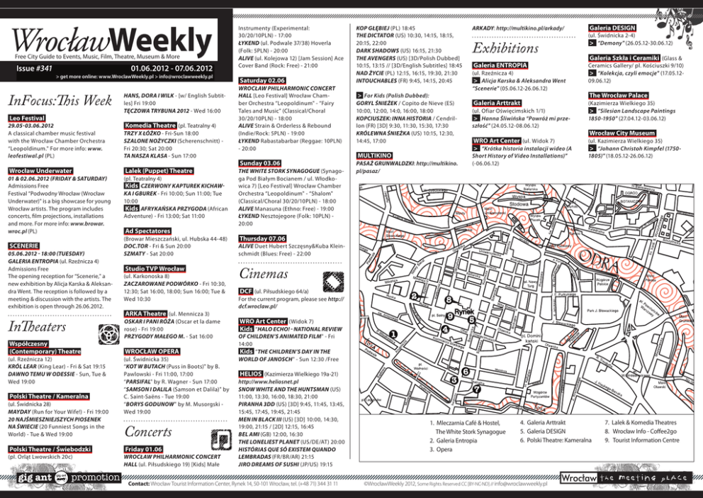 WrocławWeekly Free City Guide to Events, Music, Film, Theatre, Museum & More Issue #341 01.06.2012 - 07.06.2012 > get more online: www.WroclawWeekly.pl > [email protected] InFocus:This Week Hans, Dora i Wilk - [w/ English Subtitles] Fri 19:00 Tęczowa Trybuna 2012 - Wed 16:00 29.05-03.06.2012 A classical chamber music festival with the Wrocław Chamber Orchestra “Leopoldinum." For more info: www. leofestiwal.pl (PL) Komedia Theatre (pl. Teatralny 4) Trzy x łóżko - Fri-Sun 18:00 Szalone Nożyczki (Scherenschnitt) Fri 20:30; Sat 20:00 Ta nasza klasa - Sun 17:00 Leo Festival Wrocław Underwater Lalek (Puppet) Theatre 01 & 02.06.2012 (Friday & Saturday) Admissions Free Festival “Podwodny Wrocław (Wrocław Underwater)" is a big showcase for young Wrocław artists. The program includes concerts, film projections, installations and more. For more info: www.browar. wroc.pl (PL) (pl. Teatralny 4) Kids Czerwony Kapturek Kichawka i Gburek - Fri 10:00; Sun 11:00; Tue 10:00 Kids Afrykańska przygoda (African Adventure) - Fri 13:00; Sat 11:00 SCENERIE 05.06.2012 - 18:00 (Tuesday) Galeria ENTROPIA (ul. Rzeźnicza 4) Admissions Free The opening reception for “Scenerie," a new exhibition by Alicja Karska & Aleksandra Went. The reception is followed by a meeting & discussion with the artists. The exhibition is open through 26.06.2012. InTheaters Współczesny (Contemporary) Theatre (ul. Rzeźnicza 12) Król Lear (King Lear) - Fri & Sat 19:15 Dawno temu w Odessie - Sun, Tue & Wed 19:00 Polski Theatre / Kameralna (ul. Świdnicka 28) Mayday (Run for Your Wife!) - Fri 19:00 20 Najśmieszniejszych piosenek na świecie (20 Funniest Songs in the World) - Tue & Wed 19:00 Polski Theatre / Świebodzki (pl. Orląt Lwowskich 20c) Ad Spectatores (Browar Mieszczański, ul. Hubska 44-48) Doc.tor - Fri & Sun 20:00 Szmaty - Sat 20:00 Studio TVP Wrocław (ul. Karkonoska 8) Zaczarowane podwórko - Fri 10:30, 12:30; Sat 16:00, 18:00; Sun 16:00; Tue & Wed 10:30 ARKA Theatre (ul. Mennicza 3) Oskar i Pani Róża (Oscar et la dame rose) - Fri 19:00 Przygody małego M. - Sat 16:00 WROCŁAW OPERA (ul. Świdnicka 35) “Kot w butach (Puss in Boots)" by B. Pawlowski - Fri 11:00, 17:00 “Parsifal" by R. Wagner - Sun 17:00 “Samson i Dalila (Samson et Dalila)" by C. Saint-Saëns - Tue 19:00 “Borys Godunow" by M. Musorgski Wed 19:00 Concerts Friday 01.06 WROCŁAW PHILHARMONIC CONCERT HALL (ul. Piłsudskiego 19) [Kids] Małe Instrumenty (Experimental: 30/20/10PLN) - 17:00 ŁYKEND (ul. Podwale 37/38) Hoverla (Folk: 5PLN) - 20:00 ALIVE (ul. Kolejowa 12) [Jam Session] Ace Cover Band (Rock: Free) - 21:00 Saturday 02.06 WROCŁAW PHILHARMONIC CONCERT HALL [Leo Festival] Wrocław Chamber Orchestra “Leopoldinum" - “Fairy Tales and Music" (Classical/Choral 30/20/10PLN) - 18:00 ALIVE Strain & Orderless & Rebound (Indie/Rock: 5PLN) - 19:00 ŁYKEND Rabastabarbar (Reggae: 10PLN) - 20:00 Sunday 03.06 THE WHITE STORK SYNAGOGUE (Synagoga Pod Białym Bocianem / ul. Włodkowica 7) [Leo Festival] Wrocław Chamber Orchestra “Leopoldinum" - “Shalom" (Classical/Choral 30/20/10PLN) - 18:00 ALIVE Manasuna (Ethno: Free) - 19:00 ŁYKEND Nesztojegore (Folk: 10PLN) 20:00 Kop Głębiej (PL) 18:45 The Dictator (US) 10:30, 14:15, 18:15, 20:15, 22:00 Dark Shadows (US) 16:15, 21:30 The Avengers (US) [3D/Polish Dubbed] 10:15, 13:15 // [3D/English Subtitles] 18:45 Nad życie (PL) 12:15, 16:15, 19:30, 21:30 Intouchables (FR) 9:45, 14:15, 20:45 Arkady: http://multikino.pl/arkady/ Exhibitions Galeria ENTROPIA (ul. Rzeźnicza 4) > Alicja Karska & Aleksandra Went “Scenerie" (05.06.12-26.06.12) > For Kids (Polish Dubbed): Goryl Śnieżek / Copito de Nieve (ES) 10:00, 12:00, 14:0, 16:00, 18:00 Kopciuszek: Inna historia / Cendrillon (FR) [3D] 9:30, 11:30, 15:30, 17:30 Królewna Śnieżka (US) 10:15, 12:30, 14:45, 17:00 Galeria Arttrakt (ul. Ofiar Oświęcimskich 1/1) > Hanna Śliwińska “Powróż mi przeszłość" (24.05.12-08.06.12) WRO Art Center (ul. Widok 7) > “Krótka historia instalacji wideo (A MULTIKINO Short History of Video Installations)" (-06.06.12) Pasaż Grunwaldzki: http://multikino. pl/pasaz/ Galeria DESIGN (ul. Świdnicka 2-4) > “Demony" (26.05.12-30.06.12) Galeria Szkła i Ceramiki (Glass & Ceramics Gallery/ pl. Kościuszki 9/10) > “Kolekcja, czyli emocje" (17.05.1209.06.12) The Wrocław Palace (Kazimierza Wielkiego 35) > “Silesian Landscape Paintings 1850-1950" (27.04.12-03.06.12) Wrocław City Museum (ul. Kazimierza Wielkiego 35) > “Johann Christoh Kimpfel (17501805)" (18.05.12-26.06.12) Thursday 07.06 ALIVE Duet Hubert Szczęsny&Kuba Kleinschmidt (Blues: Free) - 22:00 Cinemas pl. Jana Pawła II DCF (ul. Piłsudskiego 64/a) For the current program, please see http:// dcf.wroclaw.pl/ WRO Art Center (Widok 7) Kids “Halo Echo! - National Review of Children’s Animated Film" - Fri 14:00 Kids “The Children’s Day in the World of Janosch" - Sun 12:30 /Free HELIOS (Kazimierza Wielkiego 19a-21) http://www.heliosnet.pl Snow White and the Huntsman (US) 11:00, 13:30, 16:00, 18:30, 21:00 Piranha 3DD (US) [3D] 9:45, 11:45, 13:45, 15:45, 17:45, 19:45, 21:45 Men in Black III (US) [3D] 10:00, 14:30, 19:00, 21:15 / [2D] 12:15, 16:45 Bel Ami (GB) 12:00, 16:30 The Loneliest Planet (US/DE/AT) 20:00 Histórias que só existem quando lembradas (FR/BR/AR) 21:15 Jiro Dreams of Sushi (JP/US) 19:15 Contact: Wrocław Tourist Information Center, Rynek 14, 50-101 Wrocław, tel. (+48 71) 344 31 11 2 8 9 1 5 4 3 6 7 1. Mleczarnia Café & Hostel, The White Stork Synagogue 2. Galeria Entropia 3. Opera 4. Galeria Arttrakt 5. Galeria DESIGN 6. Polski Theatre: Kameralna ©WrocławWeekly 2012, Some Rights Reserved CC [BY-NC-ND] // [email protected] 11 7. Lalek & Komedia Theatres 8. Wrocław Info - Coffee2go 9. Tourist Information Centre