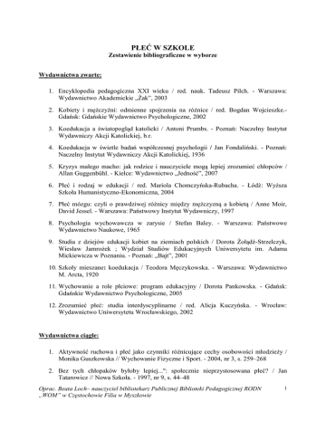 PŁEĆ W SZKOLE Zestawienie bibliograficzne w wyborze Wydawnictwa zwarte: 1. Encyklopedia pedagogiczna XXI wieku / red. nauk. Tadeusz Pilch. - Warszawa: Wydawnictwo Akademickie „Żak”, 2003 2. Kobiety i mężczyźni: odmienne spojrzenia na różnice / red. Bogdan Wojcieszke.Gdańsk: Gdańskie Wydawnictwo Psychologiczne, 2002 3. Koedukacja a światopogląd katolicki / Antoni Prumbs. - Poznań: Naczelny Instytut Wydawniczy Akcji Katolickiej, b.r. 4. Koedukacja w świetle badań współczesnej psychologii / Jan Fondaliński. - Poznań: Naczelny Instytut Wydawniczy Akcji Katolickiej, 1936 5. Kryzys małego macho: jak rodzice i nauczyciele mogą lepiej zrozumieć chłopców / Allan Guggenbühl. - Kielce: Wydawnictwo „Jedność”, 2007 6. Płeć i rodzaj w edukacji / red. Mariola Chomczyńska-Rubacha. - Łódź: Wyższa Szkoła Humanistyczno-Ekonomiczna, 2004 7. Płeć mózgu: czyli o prawdziwej różnicy między mężczyzną a kobietą / Anne Moir, David Jessel. - Warszawa: Państwowy Instytut Wydawniczy, 1997 8. Psychologia wychowawcza w zarysie / Stefan Baley. - Warszawa: Państwowe Wydawnictwo Naukowe, 1965 9. Studia z dziejów edukacji kobiet na ziemiach polskich / Dorota Żołądź-Strzelczyk, Wiesław Jamrożek ; Wydział Studiów Edukacyjnych Uniwersytetu im. Adama Mickiewicza w Poznaniu. - Poznań: „Bajt”, 2001 10. Szkoły mieszane: koedukacja / Teodora Męczykowska. - Warszawa: Wydawnictwo M. Arcta, 1920 11. Wychowanie a role płciowe: program edukacyjny / Dorota Pankowska. - Gdańsk: Gdańskie Wydawnictwo Psychologiczne, 2005 12. Zrozumieć płeć: studia interdyscyplinarne / red. Alicja Kuczyńska. - Wrocław: Wydawnictwo Uniwersytetu Wrocławskiego, 2002 Wydawnictwa ciągłe: 1. Aktywność ruchowa i płeć jako czynniki różnicujące cechy osobowości młodzieży / Monika Guszkowska // Wychowanie Fizyczne i Sport. - 2004, nr 3, s. 259–268 2. Bez tych chłopaków byłoby lepiej...'': społecznie nieprzystosowana płeć? / Jan Tatarowicz // Nowa Szkoła. - 1997, nr 9, s. 44–48 Oprac. Beata Loch– nauczyciel bibliotekarz Publicznej Biblioteki Pedagogicznej RODN „WOM” w Częstochowie Filia w Myszkowie 1 3. Co by powiedziała hrabianka / Anna Paciorek // Rzeczpospolita. - 1996, nr 291, s. 4 4. Czy chłopcy to łobuziaki, a dziewczynki to beksy? / Katarzyna Hamer-Gutowska, Jakub Gutowski // Psychologia w Szkole. - 2006, nr 4, s. 9–21 5. Czy płeć stanowi uwarunkowanie procesu wychowania fizycznego? / Monika Guszkowska // Kultura Fizyczna. - 2006, nr 9–12, s. 39–42 6. Czy szkoła ma płeć? / Monika Frąckowiak // Psychologia w Szkole. - 2005, nr 2, s. 13–23 7. Dorastająca młodzież o swojej płciowości / Róża Pawłowska // Problemy Rodziny. 1997, nr 5/6, s. 55–57 8. Dualizm ról i stereotypów płciowych – konsekwencje edukacyjne / Dorota Pankowska // Teraźniejszość – Człowiek – Edukacja. - 2002, nr 2, s. 79–92 9. Dziewczęta widzą siebie inaczej / Małgorzata Bancerz // Polonistyka. - 2001, nr 8, s. 488–493 10. Edukacja kobiet wczoraj i dziś / J. Zawal // Edukacja dorosłych.- 2006, nr 4, s. 77–90 11. Kobieta w sporcie wyczynowym / W. Półtorak // Wychowanie Fizyczne i Sport .2000, nr 4, s. 45–53 12. Koedukacja – polityka oswajania różnic czy praktyka równych szans edukacyjnych? / Lucyna Kopciewicz // Forum Oświatowe. - 2006, t. 1, s. 27–42 13. Koedukacja w nauczaniu piłki nożnej. Cz. 1 / Jerzy Talaga. // Wychowanie Fizyczne i Zdrowotne. - 2007, nr 1 , dod. s.13–16 14. Koedukacja w nauczaniu piłki nożnej. Cz. 2 / Jerzy Talaga // Wychowanie Fizyczne i Zdrowotne. - 2007 nr 2, dod. s. 2–6 15. Koedukacja w szkołach średnich w Polsce i na świecie w latach 1918–1939 – świadomy wybór czy zło konieczne / Agata Samsel // Przegląd Historyczno-Oświatowy. 2004, nr 3/4, s. 79–87 16. Matematyk i poetka czyli płeć w szkole / Marek Kaczmarzyk, Dorota Kopeć // Edukacja i Dialog. - 2008, nr 4 s. 23–26 17. Modele ról kobiety w podręcznikach do wychowania seksualnego / D. Pauluk // Kwartalnik Pedagogiczny .- 2007, nr 3, s. 153–165 18. Obraz siebie u uczniów z trudnościami w nauce szkolnej w zależności od płci / Stanisława Tucholska // Psychologia Wychowawcza. - 1998, nr 1, s. 37–43 19. Płeć a funkcjonowanie poznawcze człowieka – zdolności matematyczne i inteligencja. Cz. 1. / Wanda Ciarkowska // Psychologia Wychowawcza. - 1998, nr 3, s. 193–206 20. Płeć a funkcjonowanie poznawcze człowieka – zdolności matematyczne i inteligencja. Cz. 2. / Wanda Ciarkowska // Psychologia Wychowawcza. - 1998, nr 4, s. 289–304 21. Płeć a funkcjonowanie poznawcze człowieka – zdolności werbalne i przestrzenne / Wanda Ciarkowska // Psychologia Wychowawcza. - 1998, nr 2, s. 97–112 Oprac. Beata Loch– nauczyciel bibliotekarz Publicznej Biblioteki Pedagogicznej RODN „WOM” w Częstochowie Filia w Myszkowie 2 22. Płeć a osiągnięcia szkolne / Bożena Kozak // Częstochowski Biuletyn Oświatowy. 2004, nr 2, s. 9–11 23. Płeć a poziom czytania ze zrozumieniem / Monika Jurewicz. // Nowa Szkoła. - 2007, nr 2, s. 45–48 24. Płeć a wychowanie / Fernando Moreno Palencia // Communio. - 2007, nr 3, s. 105– 132 25. Płeć dziecka a edukacja szkolna / Anna Pawlikowska // Kwartalnik Edukacyjny. 2002, nr 1, s. 39–46 26. Płeć jako czynnik różnicujący socjalizację dziecka. Raport z własnych badań / Joanna Garbula-Orzechowska // Wychowanie na co Dzień. - 2007, nr 4–5, s. 8–15 27. Płeć w ujęciu kulturowym a edukacja / Mirosław Szymański // Nowa Szkoła. - 2005, nr 9, s. 4–6 28. Różnice w przebiegu karier szkolnych uczennic i uczniów : (przegląd badań) / Lucyna Kopciewicz // Teraźniejszość – Człowiek – Edukacja. - 2006, nr 1, s. 7–26 29. Różnice w sporządzaniu notatek na lekcji w zależności od płci / Marzena Wysocka // Języki Obce w Szkole. - 2005, nr 1, s. 162–163 30. Szkoła żeńska zasługuje na uwagę / Anna Trzeciakowska // Problemy OpiekuńczoWychowawcze