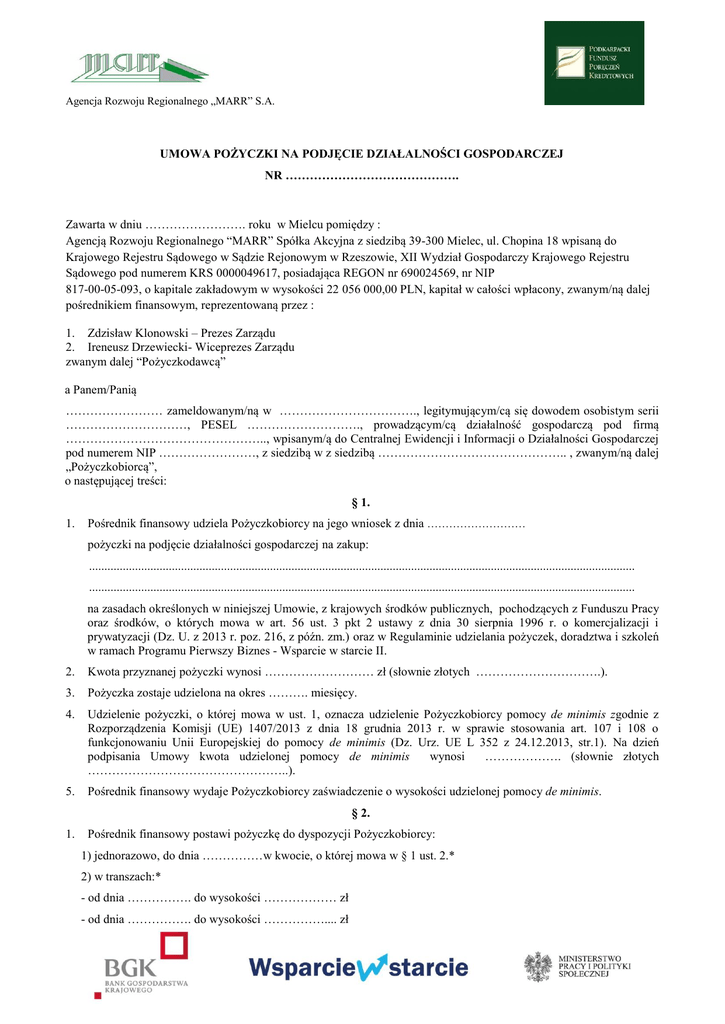 Agencja Rozwoju Regionalnego „MARR” S.A. UMOWA POŻYCZKI NA PODJĘCIE DZIAŁALNOŚCI GOSPODARCZEJ NR ……………………………………. Zawarta w dniu ……………………. roku w Mielcu pomiędzy : Agencją Rozwoju Regionalnego “MARR” Spółka Akcyjna z siedzibą 39-300 Mielec, ul. Chopina 18 wpisaną do Krajowego Rejestru Sądowego w Sądzie Rejonowym w Rzeszowie, XII Wydział Gospodarczy Krajowego Rejestru Sądowego pod numerem KRS 0000049617, posiadająca REGON nr 690024569, nr NIP 817-00-05-093, o kapitale zakładowym w wysokości 22 056 000,00 PLN, kapitał w całości wpłacony, zwanym/ną dalej pośrednikiem finansowym, reprezentowaną przez : 1. Zdzisław Klonowski – Prezes Zarządu 2. Ireneusz Drzewiecki- Wiceprezes Zarządu zwanym dalej “Pożyczkodawcą” a Panem/Panią …………………… zameldowanym/ną w ……………………………., legitymującym/cą się dowodem osobistym serii …………………………, PESEL ………………………., prowadzącym/cą działalność gospodarczą pod firmą ………………………………………….., wpisanym/ą do Centralnej Ewidencji i Informacji o Działalności Gospodarczej pod numerem NIP ……………………, z siedzibą w z siedzibą ……………………………………….. , zwanym/ną dalej „Pożyczkobiorcą”, o następującej treści: § 1. 1. Pośrednik finansowy udziela Pożyczkobiorcy na jego wniosek z dnia ……………………… pożyczki na podjęcie działalności gospodarczej na zakup: .................................................................................................................................................................................. .................................................................................................................................................................................. na zasadach określonych w niniejszej Umowie, z krajowych środków publicznych, pochodzących z Funduszu Pracy oraz środków, o których mowa w art. 56 ust. 3 pkt 2 ustawy z dnia 30 sierpnia 1996 r. o komercjalizacji i prywatyzacji (Dz. U. z 2013 r. poz. 216, z późn. zm.) oraz w Regulaminie udzielania pożyczek, doradztwa i szkoleń w ramach Programu Pierwszy Biznes - Wsparcie w starcie II. 2. Kwota przyznanej pożyczki wynosi ……………………… zł (słownie złotych ………………………….). 3. Pożyczka zostaje udzielona na okres ………. miesięcy. 4. Udzielenie pożyczki, o której mowa w ust. 1, oznacza udzielenie Pożyczkobiorcy pomocy de minimis zgodnie z Rozporządzenia Komisji (UE) 1407/2013 z dnia 18 grudnia 2013 r. w sprawie stosowania art. 107 i 108 o funkcjonowaniu Unii Europejskiej do pomocy de minimis (Dz. Urz. UE L 352 z 24.12.2013, str.1). Na dzień podpisania Umowy kwota udzielonej pomocy de minimis wynosi ………………. (słownie złotych …………………………………………..). 5. Pośrednik finansowy wydaje Pożyczkobiorcy zaświadczenie o wysokości udzielonej pomocy de minimis. § 2. 1. Pośrednik finansowy postawi pożyczkę do dyspozycji Pożyczkobiorcy: 1) jednorazowo, do dnia ……………w kwocie, o której mowa w § 1 ust. 2.* 2) w transzach:* - od dnia ……………. do wysokości ……………… zł - od dnia ……………. do wysokości …………….... zł Agencja Rozwoju Regionalnego „MARR” S.A. - od dnia ……………. do wysokości …………….... zł 2. Warunkiem postawienia pożyczki do dyspozycji Pożyczkobiorcy jest: 1) ustanowienie prawnego zabezpieczenia spłaty pożyczki, o którym mowa w § 3 ust. 1, 3. Pośrednik finansowy wypłaca pożyczkę w formie bezgotówkowej na rachunek bankowy Pożyczkobiorcy nr …………………………………………… w ciężar rachunku kredytowego nr 10 1130 1105 0013 4301 9720 0007. 4. W ciągu 30 dni od daty poniesienia ostatniego wydatku ze środków pożyczki, Pożyczkobiorca zobowiązany jest do przedłożenia pośrednikowi finansowemu sprawozdania z wykorzystania uruchomionych środków wraz z fakturami za zakupione towary i usługi, umowami sprzedaży, rachunkami lub innymi dokumentami potwierdzającymi poniesione wydatki i koszty. Przedłożenie dowodów potwierdzających realizację przedsięwzięcia opisanego we wniosku o udzielenie pożyczki, powinno nastąpić nie później niż do 12 miesięcy od daty przelania środków na rachunek bankowy wskazany przez Pożyczkobiorcę. Pożyczkobiorca zobowiązuje się udostępniać pośrednikowi finansowemu, Bankowi Gospodarstwa Krajowego oraz Ministerstwu Pracy i Polityki Społecznej oraz innym uprawnionym instytucjom wszelkich informacji dotyczących otrzymanej pożyczki. 5. § 3. 1. Prawne zabezpieczenie spłaty udzielonej pożyczki stanowi: 1) weksel własny in blanco pożyczkobiorcy składany wraz z deklaracją wekslową, 2) poręczenie wekslowe: I. Nazwisko i imię …………………… adres zamieszkania …………………………. , PESEL …………………. seria i nr dowodu osobistego …………………………… II. Nazwisko i imię …………………… adres zamieszkania …………………………. , PESEL …………………. seria i nr dowodu osobistego …………………………… III. Nazwisko i imię …………………… adres zamieszkania …………………………. , PESEL …………………. seria i nr dowodu osobistego …………………………… 3) cesja praw z polisy ubezpieczeniowej nieruchomości stanowiącej zabezpieczenie pożyczki 4) hipoteka umowna do wysokości …….. PLN (słownie: ……..złotych, 00/100) ustanowiona na nieruchomości gruntowej składającej się z działki nr , o powierzchni ha, położonej w , obręb……………, powiat …………… woj. podkarpackie, wpisanych w księdze wieczystej nr prowadzonej przez Sąd Rejonowy w ………. V Wydział Ksiąg Wieczystych. Pożyczkobiorca oświadcza, iż w/w nieruchomość …