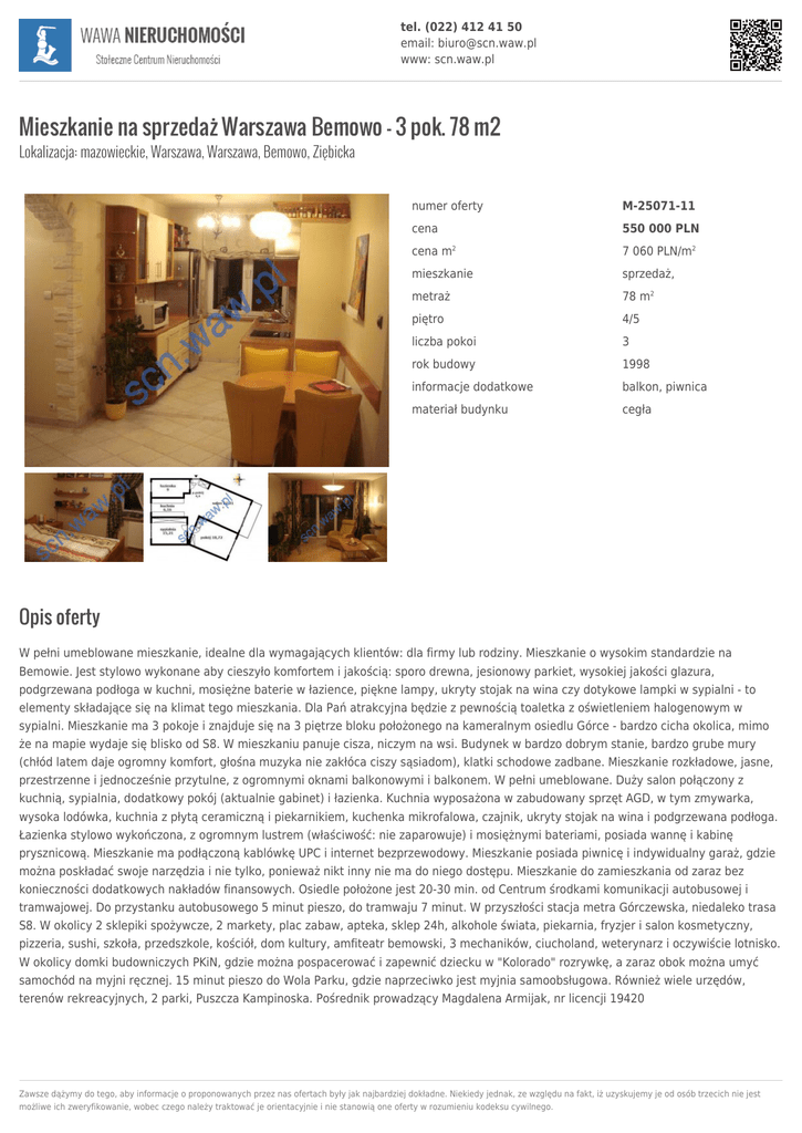 tel. (022) 412 41 50 email: [email protected] www: scn.waw.pl Mieszkanie na sprzedaż Warszawa Bemowo - 3 pok. 78 m2 Lokalizacja: mazowieckie, Warszawa, Warszawa, Bemowo, Ziębicka numer oferty M-25071-11 cena 550 000 PLN cena m 7 060 PLN/m2 mieszkanie sprzedaż, metraż 78 m2 piętro 4/5 liczba pokoi 3 rok budowy 1998 informacje dodatkowe balkon, piwnica materiał budynku cegła 2 Opis oferty W pełni umeblowane mieszkanie, idealne dla wymagających klientów: dla firmy lub rodziny. Mieszkanie o wysokim standardzie na Bemowie. Jest stylowo wykonane aby cieszyło komfortem i jakością: sporo drewna, jesionowy parkiet, wysokiej jakości glazura, podgrzewana podłoga w kuchni, mosiężne baterie w łazience, piękne lampy, ukryty stojak na wina czy dotykowe lampki w sypialni - to elementy składające się na klimat tego mieszkania. Dla Pań atrakcyjna będzie z pewnością toaletka z oświetleniem halogenowym w sypialni. Mieszkanie ma 3 pokoje i znajduje się na 3 piętrze bloku położonego na kameralnym osiedlu Górce - bardzo cicha okolica, mimo że na mapie wydaje się blisko od S8. W mieszkaniu panuje cisza, niczym na wsi. Budynek w bardzo dobrym stanie, bardzo grube mury (chłód latem daje ogromny komfort, głośna muzyka nie zakłóca ciszy sąsiadom), klatki schodowe zadbane. Mieszkanie rozkładowe, jasne, przestrzenne i jednocześnie przytulne, z ogromnymi oknami balkonowymi i balkonem. W pełni umeblowane. Duży salon połączony z kuchnią, sypialnia, dodatkowy pokój (aktualnie gabinet) i łazienka. Kuchnia wyposażona w zabudowany sprzęt AGD, w tym zmywarka, wysoka lodówka, kuchnia z płytą ceramiczną i piekarnikiem, kuchenka mikrofalowa, czajnik, ukryty stojak na wina i podgrzewana podłoga. Łazienka stylowo wykończona, z ogromnym lustrem (właściwość: nie zaparowuje) i mosiężnymi bateriami, posiada wannę i kabinę prysznicową. Mieszkanie ma podłączoną kablówkę UPC i internet bezprzewodowy. Mieszkanie posiada piwnicę i indywidualny garaż, gdzie można poskładać swoje narzędzia i nie tylko, ponieważ nikt inny nie ma do niego dostępu. Mieszkanie do zamieszkania od zaraz bez konieczności dodatkowych nakładów finansowych. Osiedle położone jest 20-30 min. od Centrum środkami komunikacji autobusowej i tramwajowej. Do przystanku autobusowego 5 minut pieszo, do tramwaju 7 minut. W przyszłości stacja metra Górczewska, niedaleko trasa S8. W okolicy 2 sklepiki spożywcze, 2 markety, plac zabaw, apteka, sklep 24h, alkohole świata, piekarnia, fryzjer i salon kosmetyczny, pizzeria, sushi, szkoła, przedszkole, kościół, dom kultury, amfiteatr bemowski, 3 mechaników, ciucholand, weterynarz i oczywiście lotnisko. W okolicy domki budowniczych PKiN, gdzie można pospacerować i zapewnić dziecku w "Kolorado" rozrywkę, a zaraz obok można umyć samochód na myjni ręcznej. 15 minut pieszo do Wola Parku, gdzie naprzeciwko jest myjnia samoobsługowa. Również wiele urzędów, terenów rekreacyjnych, 2 parki, Puszcza Kampinoska. Pośrednik prowadzący Magdalena Armijak, nr licencji 19420 Zawsze dążymy do tego, aby informacje o proponowanych przez nas ofertach były jak najbardziej dokładne. Niekiedy jednak, ze względu na fakt, iż uzyskujemy je od osób trzecich nie jest możliwe ich zweryfikowanie, wobec czego należy traktować je orientacyjnie i nie stanowią one oferty w rozumieniu kodeksu cywilnego. tel. (022) 412 41 50 email: [email protected] www: scn.waw.pl Lokalizacja Osoba kontaktowa Magdalena Alboszta województwo mazowieckie powiat Warszawa [email protected] miasto Warszawa dzielnica Bemowo ulica Ziębicka Chętnie udzielę dodatkowych informacji związanych z tą ofertą. Zapraszam do kontaktu! tel. 509 000 093 Zawsze dążymy do tego, aby informacje o proponowanych przez nas ofertach były jak najbardziej dokładne. Niekiedy jednak, ze względu na fakt, iż uzyskujemy je od osób trzecich nie jest możliwe ich zweryfikowanie, wobec czego należy traktować je orientacyjnie i nie stanowią one oferty w rozumieniu kodeksu cywilnego.