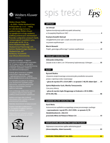 spis treści EPS Wolters Kluwer Polska – do 2006 r. Polskie Wydawnictwa Profesjonalne sp. z o.o. – należą do holenderskiego koncernu wydawniczego Wolters Kluwer. Są największym w kraju wydawcą publikacji prawniczych i biznesowych. Powstały z połączenia uznanych marek, funkcjonujących na polskim rynku od początku lat 90. XX w.: Domu Wydawniczego ABC, Wydawnictwa Prawniczego LEX, Kantoru Wydawniczego Zakamycze, Wydawnictwa „KiK” Konieczny i Kruszewski oraz Oficyny Ekonomicznej. Materiały do publikacji – o objętości do 15 stron znormalizowanego maszynopisu (ok. 25 tysięcy znaków) – przyjmujemy z dyskietką, płytą CD lub pocztą elektroniczną (z imieniem, nazwiskiem, krótkim CV oraz telefonami kontaktowymi). ARTYKUŁY Jan Jończyk Sądowa koordynacja publicznej opieki zdrowotnej w Europejskiej Wspólnocie (WE) ........................................................................... 4 Krystyna Kowalik-Bańczyk Uwzględnianie przez sąd z urzędu zarzutów opartych na prawie wspólnotowym ................................................................................... 10 Marcin Nowacki Projekt „gazociągu północnego” a prawo wspólnotowe .................................... 21 PRZEGLĄDY ORZECZNICTWA Aleksandra Sołtysińska Zasada ne bis in idem z art. 54 konwencji wykonawczej z Schengen . ................ 35 GLOSY Artykuły, glosy, komentarze i przeglądy orzecznictwa o większej objętości – zaakceptowane do druku – redakcja będzie odsyłała Autorom w celu ich skrócenia. Ryszard Skubisz Do materiałów przysyłanych do redakcji przez absolwentów wydziałów prawa, doktorantów i asystentów powinna być dołączona rekomendacja (recenzja) opiekuna naukowego. – glosa do wyroku ETS z 25.01.2007 r. w sprawie C-48/05 Adam Opel....... 41 Autor, przekazując redakcji tekst, przenosi na wydawcę wyłączne prawo do jego publikacji (prawa autorskie i wydawnicze). Redakcja zastrzega sobie możliwość dokonywania zmian i skrótów w tekstach przeznaczonych do publikacji. Używanie zarejestrowanego oznaczenia jako przesłanka naruszenia prawa z rejestracji znaku towarowego Sylwia Majkowska-Szulc, Monika Tomaszewska Czas pracy lekarzy – glosa do wyroku Sądu Okręgowego w Krakowie z 29.12.2006 r. (VI Pa 445/06)................................................................................................... 46 KAMIENIE MILOWE ORZECZNICTWA Materiały niezamówione nie będą zwracane. Karol Weitz Przedruk materiałów publikowanych w „Europejskim Przeglądzie Sądowym” wymaga zgody wydawcy. Autonomiczna wykładnia europejskiego prawa procesowego cywilnego Niedozwolone jest cytowanie wyimków publikacji bez powołania się na źródło. Handelskwekerij G. J. Bier B.V. – wprowadzenie i wyrok ETS z 30.11.1976 r. w sprawie 21/76 przeciwko Mines de Potasse d’Alsace S.A. ..................................................... 61 WSPÓLNOTOWE ORZECZNICTWO SĄDÓW POLSKICH Najnowsze orzecznictwo sądów administracyjnych (Anna Łabędzka, Adam Łazowski) ................................................................. 63 www.wolterskluwer.pl WARUNKI PRENUMERATY NA 2008 r. ............................................................ 64 Table of contents EPS ARTICLES Jan Jończyk Jurisdictional coordination of health care systems in the European Community (EC).......................................................................... 4 Krystyna Kowalik-Bańczyk Raising pleas alleging infringement of Community law by the court of its own motion ............................................................................ 10 Marcin Nowacki „The North European gas pipeline” project in the context of Community law .................................................................................................. 21 CASE LAW REVIEWS Aleksandra Sołtysińska Ne bis in idem principle under Art. 54 of the Schengen Implementation Convention................................................................................ 35 COMMENTARIES Ryszard Skubisz Use of a registered designation as the grounds for infringement of the right in trademark registration – commentary on ECJ judgment of 25 January 2007 in case C-48/05 Adam Opel ............................................................................ 41 Sylwia Majkowska-Szulc, Monika Tomaszewska Working time of physicians – commentary on judgment by the Circuit Court of Krakow of 29 December 2006 (VI Pa 445/06) . ............................................................ 46 CASE LAW MILESTONES Karol Weitz Autonomous interpretation of EC law on civil procedure – introduction and ECJ judgment of 30 November 1976 in case 21/76 Handelskwekerij G. J. Bier B.V. v Mines de Potasse d’Alsace S.A. ................. 61 COMMUNITY CASE LAW OF POLISH COURTS Recent case law of administrative courts (Anna Łabędzka, Adam Łazowski) ..................................................................63 TERMS OF SUBSCRIPTION ................................................................................ 64 Rada Naukowa JAN BARCZ STANISŁAW BIERNAT WŁADYSŁAW CZAPLIŃSKI TADEUSZ ERECIŃSKI LECH GARDOCKI LESZEK GARLICKI ZBIGNIEW HAJN ROMAN HAUSER PIOTR HOFMAŃSKI LESZEK LESZCZYŃSKI EWA ŁĘTOWSKA HANNA MACHIŃSKA LECH K. PAPRZYCKI TERESA ROMER MAREK SAFJAN WALERIAN SANETRA RYSZARD SKUBISZ JANUSZ TRZCIŃSKI ANDRZEJ WASILEWSKI MIROSŁAW WYRZYKOWSKI Kolegium Redakcyjne Andrzej Wróbel – redaktor naczelny Krystyna Kowalik-Bańczyk Dawid Miąsik Nina Półtorak Maciej Szpunar Monika Szwarc-Kuczer Karol Weitz Iwona Lewandowska – sekretarz redakcji tel. (0 22) 535 82 58 e-mail: [email protected] eps @wolterskluwer.pl Wolters Kluwer Polska Z-ca Dyrektora ds. Czasopism: Klaudiusz Kaleta tel. (0 22) 535 83 13 e-mail: [email protected] Sekretariat: tel. (0 22) 535 82 00, 535 82 03 fax (0 22) 535 83 32 e-mail: [email protected] Szczegółowe informacje o prenumeracie czasopisma można uzyskać pod numerem infolinii 0 800 12