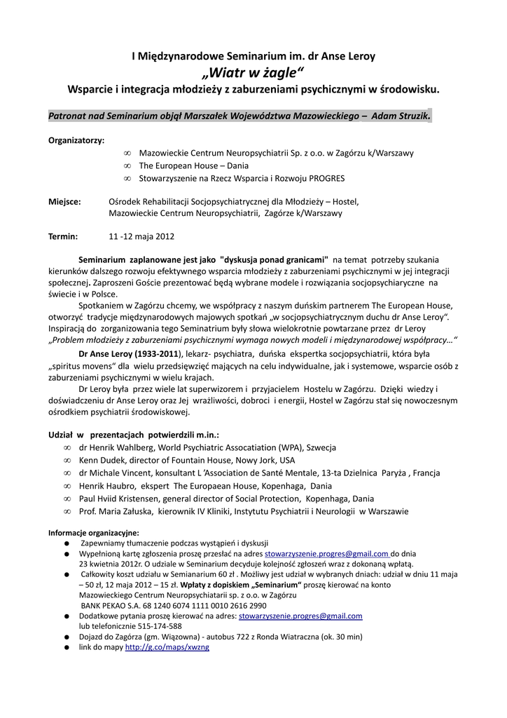 I Międzynarodowe Seminarium im. dr Anse Leroy „Wiatr w żagle“ Wsparcie i integracja młodzieży z zaburzeniami psychicznymi w środowisku. Patronat nad Seminarium objął Marszałek Województwa Mazowieckiego – Adam Struzik. Organizatorzy: • • • Mazowieckie Centrum Neuropsychiatrii Sp. z o.o. w Zagórzu k/Warszawy The European House – Dania Stowarzyszenie na Rzecz Wsparcia i Rozwoju PROGRES Miejsce: Ośrodek Rehabilitacji Socjopsychiatrycznej dla Młodzieży – Hostel, Mazowieckie Centrum Neuropsychiatrii, Zagórze k/Warszawy Termin: 11 -12 maja 2012 Seminarium zaplanowane jest jako "dyskusja ponad granicami" na temat potrzeby szukania kierunków dalszego rozwoju efektywnego wsparcia młodzieży z zaburzeniami psychicznymi w jej integracji społecznej. Zaproszeni Goście prezentować będą wybrane modele i rozwiązania socjopsychiaryczne na świecie i w Polsce. Spotkaniem w Zagórzu chcemy, we współpracy z naszym duńskim partnerem The European House, otworzyć tradycje międzynarodowych majowych spotkań „w socjopsychiatrycznym duchu dr Anse Leroy“. Inspiracją do zorganizowania tego Seminatrium były słowa wielokrotnie powtarzane przez dr Leroy „Problem młodzieży z zaburzeniami psychicznymi wymaga nowych modeli i międzynarodowej współpracy…“ Dr Anse Leroy (1933-2011), lekarz- psychiatra, duńska ekspertka socjopsychiatrii, która była „spiritus movens“ dla wielu przedsięwzięć mających na celu indywidualne, jak i systemowe, wsparcie osób z zaburzeniami psychicznymi w wielu krajach. Dr Leroy była przez wiele lat superwizorem i przyjacielem Hostelu w Zagórzu. Dzięki wiedzy i doświadczeniu dr Anse Leroy oraz Jej wrażliwości, dobroci i energii, Hostel w Zagórzu stał się nowoczesnym ośrodkiem psychiatrii środowiskowej. Udział w prezentacjach potwierdzili m.in.: • dr Henrik Wahlberg, World Psychiatric Assocatiation (WPA), Szwecja • Kenn Dudek, director of Fountain House, Nowy Jork, USA • dr Michale Vincent, konsultant L ’Association de Santé Mentale, 13-ta Dzielnica Paryża , Francja • Henrik Haubro, ekspert The Europaean House, Kopenhaga, Dania • Paul Hviid Kristensen, general director of Social Protection, Kopenhaga, Dania • Prof. Maria Załuska, kierownik IV Kliniki, Instytutu Psychiatrii i Neurologii w Warszawie Informacje organizacyjne: ● Zapewniamy tłumaczenie podczas wystąpień i dyskusji ● Wypełnioną kartę zgłoszenia proszę przesłać na adres [email protected] do dnia 23 kwietnia 2012r. O udziale w Seminarium decyduje kolejność zgłoszeń wraz z dokonaną wpłatą. ● Całkowity koszt udziału w Semianarium 60 zł . Możliwy jest udział w wybranych dniach: udział w dniu 11 maja – 50 zł, 12 maja 2012 – 15 zł. Wpłaty z dopiskiem „Seminarium“ proszę kierować na konto Mazowieckiego Centrum Neuropsychiatarii sp. z o.o. w Zagórzu BANK PEKAO S.A. 68 1240 6074 1111 0010 2616 2990 ● Dodatkowe pytania proszę kierować na adres: [email protected] lub telefonicznie 515-174-588 ● Dojazd do Zagórza (gm. Wiązowna) - autobus 722 z Ronda Wiatraczna (ok. 30 min) ● link do mapy http://g.co/maps/xwzng