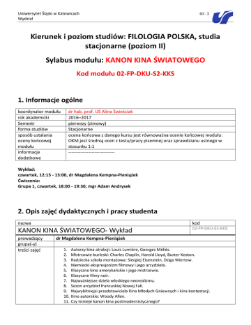 Uniwersytet Śląski w Katowicach Wydział str. 1 Kierunek i poziom studiów: FILOLOGIA POLSKA, studia stacjonarne (poziom II) Sylabus modułu: KANON KINA ŚWIATOWEGO Kod modułu 02-FP-DKU-S2-KKS 1. Informacje ogólne koordynator modułu rok akademicki Semestr forma studiów sposób ustalania oceny końcowej modułu informacje dodatkowe dr hab. prof. UŚ Alina Świeściak 2016–2017 pierwszy (zimowy) Stacjonarne ocena końcowa z danego kursu jest równoważna ocenie końcowej modułu: OKM jest średnią ocen z testu/pracy pisemnej oraz sprawdzianu ustnego w stosunku 1:1 ------------------------------ Wykład: czwartek, 12:15 - 13:00, dr Magdalena Kempna-Pieniążek Ćwiczenia: Grupa 1, czwartek, 18:00 - 19:30, mgr Adam Andrysek 2. Opis zajęć dydaktycznych i pracy studenta nazwa kod KANON KINA ŚWIATOWEGO- Wykład 02-FP-DKU-S2-KKS prowadzący grupa(-y) treści zajęć dr Magdalena Kempna-Pieniążek 1. 2. 3. 4. 5. 6. 7. 8. 9. 10. 11. Autorzy kina atrakcji: Louis Lumière, Georges Méliès. Mistrzowie burleski: Charles Chaplin, Harold Lloyd, Buster Keaton. Radziecka szkoła montażowa: Siergiej Eisenstein, Dziga Wiertow. Niemiecki ekspresjonizm filmowy i jego arcydzieła. Klasyczne kino amerykańskie i jego mistrzowie. Klasyczne filmy noir. Najważniejsze dzieła włoskiego neorealizmu. Sezon arcydzieł francuskiej Nowej Fali. Najwybitniejsi przedstawiciela Kina Młodych Gniewnych i kina kontestacji. Kino autorskie: Woody Allen. Czy istnieje kanon kina postmodernistycznego? Uniwersytet Śląski w Katowicach Wydział str. 2 Czas na realizację bloków określa prowadzący. metody prowadzenia zajęć liczba godzin dydaktycznych (kontaktowych) liczba godzin pracy własnej studenta opis pracy własnej studenta organizacja zajęć literatura obowiązkowa literatura uzupełniająca wykład 15 30 Praca ze wskazaną literaturą przedmiotu, samodzielne przyswajanie wiedzy z zagadnień wskazanych na wykładzie, zapoznanie się z filmami. Kurs obejmuje zajęcia o charakterze konwersatorium oraz wykład na ten sam temat. Wymaga się udziału studenta w obu składowych kursu. 1. Historia kina, t. 1: Kino nieme, red. T. Lubelski, I. Sowińska, R. Syska, Kraków 2009 (rozdziały wskazane przez prowadzącego). 2. Historia kina, t. 2: Kino klasyczne, red. T. Lubelski, I. Sowińska, R. Syska, Kraków 2012 (rozdziały wskazane przez prowadzącego). 3. Historia kina, t. 3: Kino epoki nowofalowej, red. T. Lubelski, I. Sowińska, R. Syska, Kraków 2015 (rozdziały wskazane przez prowadzącego). 4. T. Lubelski, Nowa Fala. O pewnej przygodzie kina francuskiego, Kraków 2002. 5. M. Przylipiak, Kino stylu zerowego, Gdańsk 1994. 1. L. Eisner, Ekran demoniczny, przeł. K. Eberhardt, Gdańsk 2011. 2. Encyklopedia kina, red. T. Lubelski, Kraków 2003 (hasła wskazane przez prowadzącego). 3. K. Klejsa, Filmowe oblicza kontestacji, Warszawa 2008. 4. G. McCann, Woody Allen, przeł. A. Kołodyński, Warszawa 1993. 5. Mistrzowie kina amerykańskiego, t. 3: Współczesność, red. Ł. Plesnar, R. Syska, Kraków 2010 (rozdziały wskazane przez prowadzącego). 6. R. Syska, Panorama kontekstów filmu noir, „Studia Filmoznawcze” 2010, nr 31. adres strony www zajęć informacje dodatkowe 3. Opis sposobów weryfikacji efektów kształcenia modułu Nazwa Kod KANON KINA ŚWIATOWEGO – Wykład 02-FP-DKU-S2-KKS kod zajęć osoba przeprowadzająca weryfikację Grupa wymagania merytoryczne 02-FP-DKU-S2-KKS dr Magdalena Kempna-Pieniążek Student zna podstawy historii kinematografii światowej, potrafi wskazać cechy kinematografii typowe dla danego czasu, filmy nowatorskie w swym czasie, zmieniające kino w danym okresie i w jakikolwiek inny sposób wpisujące się przez Uniwersytet Śląski w Katowicach Wydział kryteria oceny przebieg procesu weryfikacji informacje dodatkowe str. 3 swój wyjątkowy charakter w historię kina; wie, na czym polega problem autorstwa w kinie, gatunkowości, potrafi wskazać wartości estetyczne kina, usytuować film w kontekście historycznym oraz w obrębie poetyki kina. Test/praca pisemna. Test odbędzie się 26.01.2017 r. 2. Opis zajęć dydaktycznych i pracy studenta nazwa kod KANON KINA ŚWIATOWEGO - Ćwiczenia 02-FP-DKU-S2-KKS prowadzący grupa(-y) treści zajęć metody prowadzenia zajęć liczba godzin dydaktycznych (kontaktowych) liczba godzin pracy własnej studenta opis pracy własnej studenta organizacja zajęć literatura mgr Adam Andrysek Grupa 1 1. Początki kina. 2. Neorealizm włoski. 3. Francuska Nowa Fala. 4. Twórczość Alfreda Hitchcocka. 5. Młodzi Gniewni. 6. Kino amerykańskie. 7. Kino kultu. 8. Kino Nowej Przygody. 9. Przemoc w kinie. 10. Twórczość Todda Solondza. 11. Twórczość Davida Lyncha. 12. Twórczość Quentina Tarantino. Czas na realizację poszczególnych tematów ustala prowadzący. Studenci mogą zgłaszać propozycje struktury czasowej dla podanych tematów. laboratorium 15 30 Praca z literaturą przedmiotu, samodzielne interpretacje obejrzanych filmów, lektura wybranych tekstów poszerzających wiedzę. Kurs obejmuje zajęcia o charakterze konwersatorium oraz wykład na ten sam temat. Wymaga się udziału studenta w obu składowych kursu. Anderson, Baczność! Baczność!, w: Europejskie manifesty kina, red. A. Gwóźdź, Uniwersytet Śląski w Katowicach Wydział obowiązkowa literatura uzupełniająca adres strony www zajęć informacje dodatkowe str. 4 Warszawa 2002. J.-L. Godard, Montaż, moje piękne zmartwienie, w: Europejskie manifesty kina, red. A. Gwóźdź, Warszawa 2002. K. Klejsa, Filmowe oblicza kontestacji, Warszawa 2008 (tu: Easy Rider). M. Kornatowska, Baśń – świadectwo czasu, „Kwartalnik Filmowy” 1995/1996 nr 12 – 13. K. Lipka, Linia mety nie kończy biegu… Tony Richardson, „Samotność długodystansowca”, „Kwartalnik Filmowy” 2006, nr 53. T. Lubelski, Orfeusz jedzie do Hiroszimy, „Kwartalnik Filmowy” 1995–1996, nr 12–13. T. Lubelski, Nowa fala. O pewnej przygodzie kina francuskiego, Kraków 2000 (rozdz. 