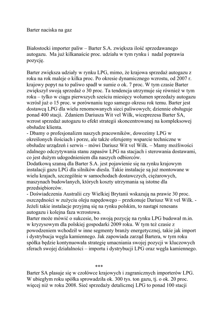 Barter naciska na gaz Białostocki importer paliw – Barter S.A. zwiększa ilość sprzedawanego autogazu. Ma już kilkanaście proc. udziału w tym rynku i nadal poprawia pozycję. Barter zwiększa udziały w rynku LPG, mimo, że krajowa sprzedaż autogazu z roku na rok maleje o kilka proc. Po okresie dynamicznego wzrostu, od 2007 r. krajowy popyt na to paliwo spadł w sumie o ok. 7 proc. W tym czasie Barter zwiększył swoją sprzedaż o 30 proc. Ta tendencja utrzymuje się również w tym roku – tylko w ciągu pierwszych sześciu miesięcy wolumen sprzedaży autogazu wzrósł już o 15 proc. w porównaniu tego samego okresu rok temu. Barter jest dostawcą LPG dla wielu renomowanych sieci paliwowych; dziennie obsługuje ponad 400 stacji. Zdaniem Dariusza Wit vel Wilk, wiceprezesa Barter SA, wzrost sprzedaż autogazu to efekt strategii skoncentrowanej na kompleksowej obsłudze klienta. - Dbamy o profesjonalizm naszych pracowników, dowozimy LPG w określonych ilościach i porze, ale także oferujemy wsparcie techniczne w obsłudze urządzeń i serwis – mówi Dariusz Wit vel Wilk. – Mamy możliwości zdalnego odczytywania stanu zapasów LPG na stacjach i sterowania dostawami, co jest dużym udogodnieniem dla naszych odbiorców. Dodatkową szansą dla Barter S.A. jest pojawienie się na rynku krajowym instalacji gazu LPG dla silników diesla. Takie instalacje są już montowane w wielu krajach, szczególnie w samochodach dostawczych, ciężarowych, maszynach budowlanych, których koszty utrzymania są istotne dla przedsiębiorców. - Doświadczenia Australii czy Wielkiej Brytanii wskazują na prawie 30 proc. oszczędności w zużyciu oleju napędowego – przekonuje Dariusz Wit vel Wilk. Jeżeli takie instalacje przyjmą się na rynku polskim, to nastąpi renesans autogazu i kolejna faza wzrostowa. Barter może mówić o sukcesie, bo swoją pozycję na rynku LPG budował m.in. w kryzysowym dla polskiej gospodarki 2009 roku. W tym też czasie z powodzeniem wchodził w inne segmenty branży energetycznej, takie jak import i dystrybucja węgla kamiennego. Jak zapowiada zarząd Bartera, w tym roku spółka będzie kontynuowała strategię umacniania swojej pozycji w kluczowych sferach swojej działalności – importu i dystrybucji LPG oraz węgla kamiennego. *** Barter SA plasuje się w czołówce krajowych i zagranicznych importerów LPG. W ubiegłym roku spółka sprowadziła ok. 300 tys. ton gazu, tj. o ok. 20 proc. więcej niż w roku 2008. Sieć sprzedaży detalicznej LPG to ponad 100 stacji własnych i patronackich. W strukturze firmy Barter S.A. funkcjonują cztery rozlewnie gazu LPG w: Barczewie, Bydgoszczy, Kutnie i Sokółce. Barter handluje też gazem w butlach. Należy do niego kilka tysięcy punktów sprzedaży. Firma stale inwestuje: kupuje kolejne butle, powiększa flotę samochodów i cystern. Codziennie obsługuje kilkanaście tysięcy podmiotów gospodarczych w zakresie hurtowej i detalicznej sprzedaży LPG. Przychody spółki za ubiegły rok: 1,8 mld zł, zysk – ponad 30 mln zł. Firma zatrudnia ok. 500 osób.