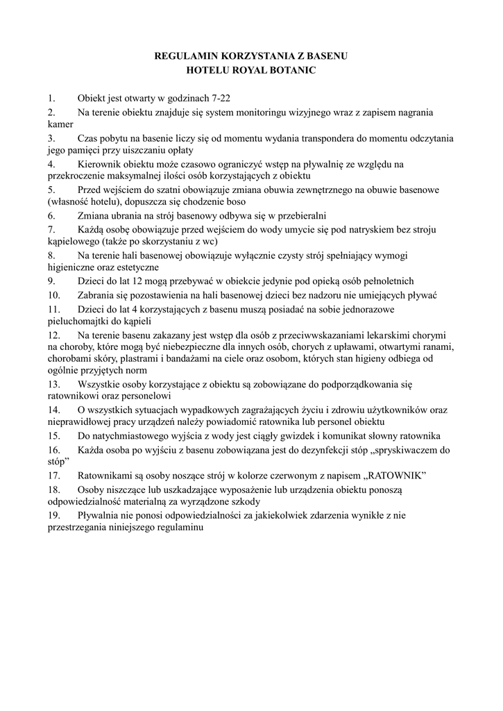 REGULAMIN KORZYSTANIA Z BASENU HOTELU ROYAL BOTANIC 1. Obiekt jest otwarty w godzinach 7-22 2. Na terenie obiektu znajduje się system monitoringu wizyjnego wraz z zapisem nagrania kamer 3. Czas pobytu na basenie liczy się od momentu wydania transpondera do momentu odczytania jego pamięci przy uiszczaniu opłaty 4. Kierownik obiektu może czasowo ograniczyć wstęp na pływalnię ze względu na przekroczenie maksymalnej ilości osób korzystających z obiektu 5. Przed wejściem do szatni obowiązuje zmiana obuwia zewnętrznego na obuwie basenowe (własność hotelu), dopuszcza się chodzenie boso 6. Zmiana ubrania na strój basenowy odbywa się w przebieralni 7. Każdą osobę obowiązuje przed wejściem do wody umycie się pod natryskiem bez stroju kąpielowego (także po skorzystaniu z wc) 8. Na terenie hali basenowej obowiązuje wyłącznie czysty strój spełniający wymogi higieniczne oraz estetyczne 9. Dzieci do lat 12 mogą przebywać w obiekcie jedynie pod opieką osób pełnoletnich 10. Zabrania się pozostawienia na hali basenowej dzieci bez nadzoru nie umiejących pływać 11. Dzieci do lat 4 korzystających z basenu muszą posiadać na sobie jednorazowe pieluchomajtki do kąpieli 12. Na terenie basenu zakazany jest wstęp dla osób z przeciwwskazaniami lekarskimi chorymi na choroby, które mogą być niebezpieczne dla innych osób, chorych z upławami, otwartymi ranami, chorobami skóry, plastrami i bandażami na ciele oraz osobom, których stan higieny odbiega od ogólnie przyjętych norm 13. Wszystkie osoby korzystające z obiektu są zobowiązane do podporządkowania się ratownikowi oraz personelowi 14. O wszystkich sytuacjach wypadkowych zagrażających życiu i zdrowiu użytkowników oraz nieprawidłowej pracy urządzeń należy powiadomić ratownika lub personel obiektu 15. Do natychmiastowego wyjścia z wody jest ciągły gwizdek i komunikat słowny ratownika 16. Każda osoba po wyjściu z basenu zobowiązana jest do dezynfekcji stóp „spryskiwaczem do stóp” 17. Ratownikami są osoby noszące strój w kolorze czerwonym z napisem „RATOWNIK” 18. Osoby niszczące lub uszkadzające wyposażenie lub urządzenia obiektu ponoszą odpowiedzialność materialną za wyrządzone szkody 19. Pływalnia nie ponosi odpowiedzialności za jakiekolwiek zdarzenia wynikłe z nie przestrzegania niniejszego regulaminu