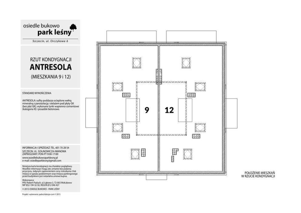 osiedle bukowo park leśny Szczecin, ul. Orczykowa 6 RZUT KONDYGNACJI ANTRESOLA (MIESZKANIA 9 i 12) STANDARD WYKOŃCZENIA ANTRESOLA: sufity poddasza ocieplone wełną mineralną z paroizolacją i stelażem pod płyty GK (bez płyt GK); wykonane tynki wapienno-cementowe (kategoria III) i posadzki betonowe. 9 12 INFORMACJA I SPRZEDAŻ: TEL. 601 70 28 54 SZCZECIN, UL. SZAJNOWICZA-IWANOWA ZAPRASZAMY: PON-PT 9:00-17:00 www.osiedlebukowoparklesny.pl e-mail: [email protected] Niniejsza karta kondygnacji ma charakter poglądowy. Wszelkie informacje mogą ulec zmianie bez podania przyczyny. Jedynym zapewnieniem ceny mieszkania i/lub miejsca w garażu podziemnym oraz miejsca parkingowego przed budynkiem jest notarialna umowa kupna. Wykonawca: PHU Robert Paduch, ul. Łąkowa 3, 72-003 Wołczkowo NIP 852-194-32-92, REGON 812 046 427 © 2015 OSIEDLE BUKOWO - PARK LEŚNY Projekt i wykonanie: paduchdesign.com © 2015 POŁOŻENIE MIESZKAÑ W RZUCIE KONDYGNACJI