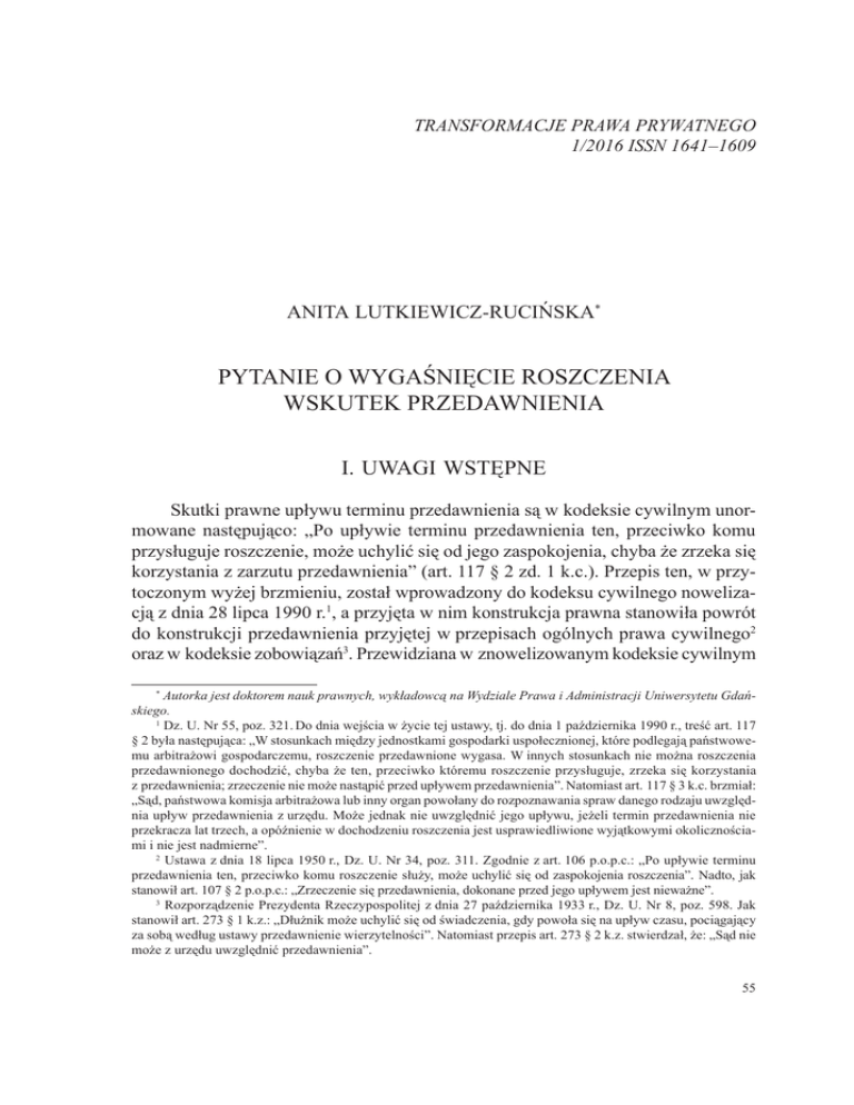 Transformacje Prawa Prywatnego 1/2016 ISSN 1641–1609 Anita Lutkiewicz-Rucińska* Pytanie o wygaśnięcie roszczenia wskutek przedawnienia I. Uwagi wstępne Skutki prawne upływu terminu przedawnienia są w kodeksie cywilnym unormowane następująco: „Po upływie terminu przedawnienia ten, przeciwko komu przysługuje roszczenie, może uchylić się od jego zaspokojenia, chyba że zrzeka się korzystania z zarzutu przedawnienia” (art. 117 § 2 zd. 1 k.c.). Przepis ten, w przytoczonym wyżej brzmieniu, został wprowadzony do kodeksu cywilnego nowelizacją z dnia 28 lipca 1990 r., a przyjęta w nim konstrukcja prawna stanowiła powrót do konstrukcji przedawnienia przyjętej w przepisach ogólnych prawa cywilnego oraz w kodeksie zobowiązań. Przewidziana w znowelizowanym kodeksie cywilnym * Autorka jest doktorem nauk prawnych, wykładowcą na Wydziale Prawa i Administracji Uniwersytetu Gdańskiego. Dz. U. Nr 55, poz. 321. Do dnia wejścia w życie tej ustawy, tj. do dnia 1 października 1990 r., treść art. 117 § 2 była następująca: „W stosunkach między jednostkami gospodarki uspołecznionej, które podlegają państwowemu arbitrażowi gospodarczemu, roszczenie przedawnione wygasa. W innych stosunkach nie można roszczenia przedawnionego dochodzić, chyba że ten, przeciwko któremu roszczenie przysługuje, zrzeka się korzystania z przedawnienia; zrzeczenie nie może nastąpić przed upływem przedawnienia”. Natomiast art. 117 § 3 k.c. brzmiał: „Sąd, państwowa komisja arbitrażowa lub inny organ powołany do rozpoznawania spraw danego rodzaju uwzględnia upływ przedawnienia z urzędu. Może jednak nie uwzględnić jego upływu, jeżeli termin przedawnienia nie przekracza lat trzech, a opóźnienie w dochodzeniu roszczenia jest usprawiedliwione wyjątkowymi okolicznościami i nie jest nadmierne”. Ustawa z dnia 18 lipca 1950 r., Dz. U. Nr 34, poz. 311. Zgodnie z art. 106 p.o.p.c.: „Po upływie terminu przedawnienia ten, przeciwko komu roszczenie służy, może uchylić się od zaspokojenia roszczenia”. Nadto, jak stanowił art. 107 § 2 p.o.p.c.: „Zrzeczenie się przedawnienia, dokonane przed jego upływem jest nieważne”. Rozporządzenie Prezydenta Rzeczypospolitej z dnia 27 października 1933 r., Dz. U. Nr 8, poz. 598. Jak stanowił art. 273 § 1 k.z.: „Dłużnik może uchylić się od świadczenia, gdy powoła się na upływ czasu, pociągający za sobą według ustawy przedawnienie wierzytelności”. Natomiast przepis art. 273 § 2 k.z. stwierdzał, że: „Sąd nie może z urzędu uwzględnić przedawnienia”. 55 Transformacje Prawa Prywatnego 1/2016 regulacja skutków przedawnienia spotkała się w nauce z powszechną aprobatą. Za jej utrzymaniem opowiedziała się także Komisja Kodyfikacyjna Prawa Cywilnego. W ostatnich latach dostrzeżono jednak wady aktualnie przyjętej konstrukcji przedawnienia. Szczególną uwagę zwraca stanowisko A. Brzozowskiego, W.J. Kocota oraz E. Skowrońskiej-Bocian, którzy istniejące obecnie rozwiązanie uznali za chroniące w niedostatecznym stopniu interes dłużników. Powołani autorzy, odnosząc się do uregulowania trybu uwzględniania przedawnienia w następstwie podniesienia zarzutu przedawnienia stwierdzili, że: „Oceniając je z perspektywy dokonanych innych zmian legislacyjnych, w szczególności uregulowań procedury cywilnej (np.: uznanie nieodebranych wezwań sądowych za doręczone; przepisów o egzekucji; nieuczciwych praktyk firm windykacyjnych polegających na podawaniu nieprawdziwych adresów pozwanych; wpisów na listy dłużników) zasygnalizować należy potrzebę powrotu do dyskusji nad uregulowaniem skutków przedawnienia, której celem byłoby przywrócenie właściwej ochrony dłużników. Nie może bowiem zostać uznane za usprawiedliwione rozwiązanie (szczególnie w obrocie z udziałem konsumentów), zgodnie z którym o wyroku zasądzającym dłużnik roszczenia przedawnionego (który z powodów przez siebie niezawinionych nie wiedział o toczącym się postępowaniu i nie mógł złożyć zarzutu przedawnienia), dowiaduje się dopiero od komornika, a przekazane przez komornika firmie windykacyjnej (często z siedzibą poza granicami Polski) sumy pieniężne są niemożliwe do odzyskania”. Traktując przytoczoną wypowiedź jako inspirację i zaproszenie do dyskusji, w niniejszym opracowaniu podejmę próbę odniesienia się do rozwiązania przyję Zob. w szczególności: S. Wójcik: Przedawnienie w prawie cywilnym po zmianie kodeksu cywilnego ustawą z 28 lipca 1990 r., Przegląd Sądowy 1991, nr 1–2, s. 46–47; A. Brzozowski: Nowa regulacja przedawnienia w prawie cywilnym, Państwo i Prawo 1992, z. 3, s. 21, 25, 26 i 31; B. Kordasiewicz (w:) System prawa prywatnego, t. 2, Prawo cywilne — część ogólna, pod red. Z. Radwańskiego, Warszawa 2002, s. 563–564; A. Szpunar: Uwagi o zrzeczeniu się zarzutu przedawnienia, Rejent 2002, nr 10, s. 18–19; T. Pałdyna: Przedawnienie w polskim prawie cywilnym, Warszawa 2012, s. 249–254; M. Pyziak-Szafnicka (w:) Kodeks cywilny. Część ogólna, pod red. M. Pyziak-Szafnickiej, P. Księżaka, Warszawa 2014, s. 1158. Zgodnie z art. 181 § 3 projektu pierwszej księgi kodeksu cywilnego opracowanej przez Komisję Kodyfikacyjną Prawa Cywilnego: „Po upływie terminu przedawnienia ten, przeciwko komu przysługuje roszczenie, może uchylić się od spełnienia świadczenia”. Powołany projekt został opublikowany (w:) Komisja Kodyfikacyjna Prawa Cywilnego działająca przy Ministrze Sprawiedliwości, Księga pierwsza Kodeksu cywilnego. Projekt z uzasadnieniem, Warszawa 2009. Zob. też stanowisko Komisji Kodyfikacyjnej Prawa Cywilnego (w:) Ministerstwo Sprawiedliwości, Komisja Kodyfikacyjna Prawa Cywilnego, Zielona Księga. Optymalna wizja Kodeksu cywilnego w Rzeczypospolitej Polskiej, pod red. Z. Radwańskiego, Warszawa 2006, s. 60 oraz (w:) Księga…, op. cit., s. 177. A. Brzozowski, W.J. Kocot, E. Skowrońska-Bocian: Prawo cywilne. 