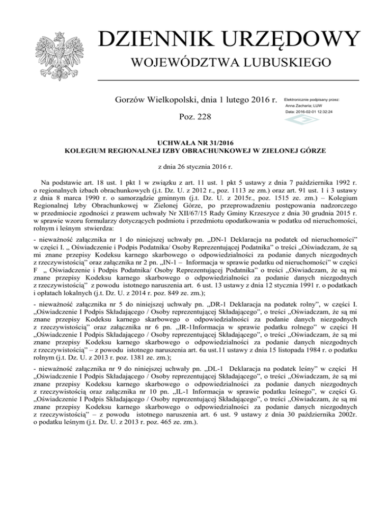 DZIENNIK URZĘDOWY WOJEWÓDZTWA LUBUSKIEGO Gorzów Wielkopolski, dnia 1 lutego 2016 r. Elektronicznie podpisany przez: Anna Zacharia; LUW Poz. 228 Data: 2016-02-01 12:32:24 UCHWAŁA NR 31/2016 KOLEGIUM REGIONALNEJ IZBY OBRACHUNKOWEJ W ZIELONEJ GÓRZE z dnia 26 stycznia 2016 r. Na podstawie art. 18 ust. 1 pkt 1 w związku z art. 11 ust. 1 pkt 5 ustawy z dnia 7 października 1992 r. o regionalnych izbach obrachunkowych (j.t. Dz. U. z 2012 r., poz. 1113 ze zm.) oraz art. 91 ust. 1 i 3 ustawy z dnia 8 marca 1990 r. o samorządzie gminnym (j.t. Dz. U. z 2015r., poz. 1515 ze. zm.) – Kolegium Regionalnej Izby Obrachunkowej w Zielonej Górze, po przeprowadzeniu postępowania nadzorczego w przedmiocie zgodności z prawem uchwały Nr XII/67/15 Rady Gminy Krzeszyce z dnia 30 grudnia 2015 r. w sprawie wzoru formularzy dotyczących podmiotu i przedmiotu opodatkowania w podatku od nieruchomości, rolnym i leśnym stwierdza: - nieważność załącznika nr 1 do niniejszej uchwały pn. „DN-1 Deklaracja na podatek od nieruchomości” w części I. „ Oświadczenie i Podpis Podatnika/ Osoby Reprezentującej Podatnika” o treści „Oświadczam, że są mi znane przepisy Kodeksu karnego skarbowego o odpowiedzialności za podanie danych niezgodnych z rzeczywistością” oraz załącznika nr 2 pn. „IN-1 – Informacja w sprawie podatku od nieruchomości” w części F „ Oświadczenie i Podpis Podatnika/ Osoby Reprezentującej Podatnika” o treści „Oświadczam, że są mi znane przepisy Kodeksu karnego skarbowego o odpowiedzialności za podanie danych niezgodnych z rzeczywistością” z powodu istotnego naruszenia art. 6 ust. 13 ustawy z dnia 12 stycznia 1991 r. o podatkach i opłatach lokalnych (j.t. Dz. U. z 2014 r. poz. 849 ze. zm.); - nieważność załącznika nr 5 do niniejszej uchwały pn. „DR-1 Deklaracja na podatek rolny”, w części I. „Oświadczenie I Podpis Składającego / Osoby reprezentującej Składającego”, o treści „Oświadczam, że są mi znane przepisy Kodeksu karnego skarbowego o odpowiedzialności za podanie danych niezgodnych z rzeczywistością” oraz załącznika nr 6 pn. „IR-1Informacja w sprawie podatku rolnego” w części H „Oświadczenie I Podpis Składającego / Osoby reprezentującej Składającego”, o treści „Oświadczam, że są mi znane przepisy Kodeksu karnego skarbowego o odpowiedzialności za podanie danych niezgodnych z rzeczywistością” – z powodu istotnego naruszenia art. 6a ust.11 ustawy z dnia 15 listopada 1984 r. o podatku rolnym (j.t. Dz. U. z 2013 r. poz. 1381 ze. zm.); - nieważność załącznika nr 9 do niniejszej uchwały pn. „DL-1 Deklaracja na podatek leśny” w części H „Oświadczenie I Podpis Składającego / Osoby reprezentującej Składającego”, o treści „Oświadczam, że są mi znane przepisy Kodeksu karnego skarbowego o odpowiedzialności za podanie danych niezgodnych z rzeczywistością oraz załącznika nr 10 pn. „IL-1 Informacja w sprawie podatku leśnego”, w części G. „Oświadczenie I Podpis Składającego / Osoby reprezentującej Składającego”, o treści „Oświadczam, że są mi znane przepisy Kodeksu karnego skarbowego o odpowiedzialności za podanie danych niezgodnych z rzeczywistością” – z powodu istotnego naruszenia art. 6 ust. 9 ustawy z dnia 30 października 2002r. o podatku leśnym (j.t. Dz. U. z 2013 r. poz. 465 ze. zm.). Dziennik Urzędowy Województwa Lubuskiego –2– Poz. 228 Uzasadnienie Uchwała Nr XII/67/15 Rady Gminy Krzeszyce z dnia 30 grudnia 2015 r. w sprawie wzoru formularzy dotyczących podmiotu i przedmiotu opodatkowania w podatku od nieruchomości, rolnym i leśnym została doręczona Regionalnej Izbie Obrachunkowej w Zielonej Górze w dniu 15 stycznia 2016 r. i objęta postępowaniem nadzorczym na podstawie art. 11 ust. 1 pkt 5 ustawy o regionalnych izbach obrachunkowych. Oceniając zgodność postanowień powołanej wyżej uchwały z przepisami prawa, Kolegium Regionalnej Izby Obrachunkowej w Zielonej Górze ustaliło, że zgodnie z §1 badanej uchwały – w załączniku nr 1 określony został wzór formularza zawierający dane podmiotu i przedmiotu opodatkowania, niezbędne do wymiaru i poboru podatku od nieruchomości pn. „DN-1 Deklaracja na podatek od nieruchomości” w załączniku nr 2 Informacji w sprawie podatku od nieruchomości”. W tych załącznikach odpowiednio w części I oraz części F „Oświadczenie I Podpis Składającego / Osoby reprezentującej Składającego” – zawarte zostało oświadczenie o treści „Oświadczam, że są mi znane przepisy Kodeksu karnego skarbowego o odpowiedzialności za podanie danych niezgodnych z rzeczywistością”. Złożenie oświadczenia o ww. treści zostało również zawarte części I. formularza pn. „DR-1 Deklaracja na podatek rolny, w części H formularza pn. IR-1 Informacja w sprawie podatku rolnego, w części H formularza pn. Deklaracja na podatek leśny oraz w części G formularza pn. Informacja w sprawie podatku leśnego. Zapisy odnoszące się do złożenia przez podatnika ww. oświadczeń jest sprzeczne z przepisami art. 6 ust. 13 ustawy z dnia 12 stycznia 1991 r. o podatkach i opłatach lokalnych, art. 6a ust. 11 ustawy z dnia 15 listopada 1984 r. o podatku rolnym, art. 6 ust. 9 ustawy z dnia 30 października 2002r. o podatku leśnym stanowiącymi o kompetencji rady gminy do określenia, w drodze uchwały, wzorów formularzy zawierających dane dotyczące podmiotu i przedmiotu opodatkowania, niezbędne do wymiaru i poboru podatków lokalnych. Rada Gminy podejmując przedmiotową uchwałę w której wskazuje na obowiązek złożenia ww. oświadczeń przez podatnika lub osobę ją reprezentującą, wykroczyła poza zakres ww. ustawowych upoważnień udzielonych organowi stanowiącemu gminy z uwagi na fakt, iż nie są to dane niezbędne do wymiaru i poboru podatków od nieruchomości, podatku rolnego i leśnego. W orzecznictwie wojewódzkich sądów administracyjnych