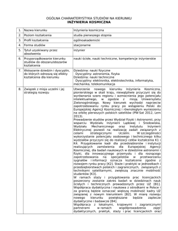 OGÓLNA CHARAKTERYSTYKA STUDIÓW NA KIERUNKU INŻYNIERIA KOSMICZNA 1. Nazwa kierunku Inżynieria kosmiczna 2. Poziom kształcenia studia pierwszego stopnia 3. Profil kształcenia ogólnoakademicki 4. Forma studiów stacjonarne 5. Tytuł uzyskiwany przez absolwenta inżynier 6. Przyporządkowanie kierunku studiów do obszaru/obszarów kształcenia nauki ścisłe, nauki techniczne, kompetencje inżynierskie 7. Wskazanie dziedzin i dyscyplin, do których odnoszą się efekty kształcenia dla kierunku Dziedzina: nauki fizyczne Dyscypliny: astronomia, fizyka Dziedzina: nauki techniczne Dyscypliny: elektronika, elektrotechnika, informatyka, mechanika, telekomunikacja 8. Związek z misja uczelni i jej strategią rozwoju Utworzenie nowego kierunku Inżynieria Kosmiczna, pionierskiego w skali kraju, niewątpliwie przyczyni się do wyrównania szans regionu i wzmocnienia jego potencjału intelektualnego, w zgodzie z misją Uniwersytetu Zielonogórskiego. Nowy kierunek wychodzi naprzeciw zapotrzebowaniu rynku pracy po wstąpieniu Polski do Europejskiej Agencji Kosmicznej i równoległym wyniesieniu na orbitę pierwszych polskich satelitów (PW-Sat 2012, Lem 2013). Prowadzenie studiów przez Wydział Fizyki i Astronomii, przy wsparciu Wydziału Inżynierii Lądowej i Środowiska, Wydziału Mechanicznego oraz Instytutu Inżynierii Elektrycznej pozwoli na realizację zadań związanych z celami strategicznymi Uczelni. W szczególności wykorzystanie potencjału osobowego i technicznego kilku wydziałów przyczyni się do realizacji cełów kształcenia K1 i K4. Przygotowanie kadr dla przedsiębiorstw i instytucji realizujących zamówienia dla Europejskiej Agencji Kosmicznej, dla badań naukowych w dziedzinie astronomii i fizyki, dla innowacyjnego przemysłu i dla rosnącego zapotrzebowania na specjalistów w przetwarzaniu sygnałów i informacji oznacza kształcenie zgodne z rozwojem rynku pracy [K2]. Staże i praktyki w jednostkach i przedsiębiorstwach polskich i zagranicznych, związanych z technikami satelitarnymi, zwiększą znacznie mobilność studentów [K3]. W ramach staży i przygotowania prac licencjackich poszerzony zostanie zakres badań w dziedzinach nauk ścisłych i technicznych prowadzonych przez UZ [B1]. Współpraca dydaktyczna i naukowa z ośrodkami w Polsce i za granicą będzie oznaczać większą mobilność kadry UZ związanej z nowym kierunkiem [B2]. W miarę rozwoju nowego kierunku powiększane będzie zaplecze dydaktyczne i badawcze [B4]. Współpraca z lokalnymi, krajowymi i zagranicznymi partnerami w ramach współprowadzenia zajęć dydaktycznych, praktyk, staży i prac licencjackich oraz wspólnej realizacji zadań badawczo-rozwojowych rozszerzy relacje Uczelni z partnerami zewnętrznymi [R1, R2, R4]. 9. Ogólne cele kształcenia oraz możliwości zatrudnienia i kontynuacji kształcenia przez absolwentów studiów Celem kształcenia na kierunku Inżynieria Kosmiczna jest wszechstronne przygotowanie studentów do: • pracy nad przetwarzaniem oraz analizą sygnałów i danych satelitarnych i naukowych, • wspomagania projektowania, testowania, budowy i nadzoru działania urządzeń satelitarnych i astronomicznych obserwatoriów naziemnych, • prac badawczo-rozwojowych nad nowymi technikami satelitarnymi i nowymi technologiami w ogólności. Po zakończeniu studiów pierwszego stopnia absolwenci będą mogli kontynuować naukę na studiach magisterskich wielu kierunków technicznych oraz fizyki i astronomii. Wyróżniający się studenci będą mogli się ubiegać o granty Europejskiej Agencji Kosmicznej umożliwiające studia magisterskie w ramach programu Erasmus Mundus Master Course in Space Science and Technology. Absolwenci kierunku Inżynieria Kosmiczna będą mogli znaleźć zatrudnienie w: • przemyśle i instytucjach badawczo-rozwojowych lub naukowych związanych z technikami satelitarnymi i astronomicznymi obserwatoriami naziemnymi, a także jednostkach zajmujących się fizyką doświadczalną, • przedsiębiorstwach i instytucjach wykorzystujących lub opracowujących nowe technologie lub nowe metody badań, • wszelkich ośrodkach zajmujących się przetwarzaniem różnego rodzaju sygnałów na informacje i analizą tych informacji. 10. Wymagania wstępne (kompetencje kandydata) Warunkiem przyjęcia na studia pierwszego stopnia na kierunek Inżynieria Kosmiczna jest posiadanie przez kandydata świadectwa dojrzałości. 11. Zasady rekrutacji Przedstawiono w osobnym dokumencie. 12. Różnice w stosunku do innych programów o podobnie zdefiniowanych celach i efektach kształcenia prowadzonych na uczelni Wśród kierunków prowadzonych na UZ nie ma żadnego zbliżonego pod względem celów i efektów kształcenia do kierunku Inżynieria Kosmiczna. Nowy kierunek ma charakter interdyscyplinarny, łącząc w sobie różne elementy programu nauczania z dziedzin fizyki i astronomii, informatyki oraz nauk technicznych, w szczególności elektroniki, telekomunikacji i mechaniki. Bardzo dużą część programu studiów stanowią nowe przedmioty kierunkowe, związane ze specyfiką projektowania, testowania i użytkowania urządzeń w przestrzeni kosmicznej oraz z nowymi technikami przetwarzania sygnałów na informacje i analizą tych informacji.