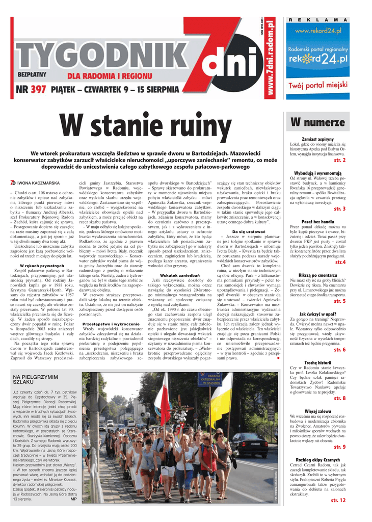 R W stanie ruiny E K L A M A W numerze Zamiast aspiryny We wtorek prokuratura wszczęła śledztwo w sprawie dworu w Bartodziejach. Mazowiecki konserwator zabytków zarzucił właścicielce nieruchomości „uporczywe zaniechanie” remontu, co może doprowadzić do unicestwienia całego zabytkowego zespołu pałacowo-parkowego Lokal, gdzie do wiosny mieściła się historyczna Apteka pod Białym Orłem, wynajęła instytucja finansowa. str. 2 Wybudują i wyremontują IWONA KACZMARSKA – Chodzi o art. 108 ustawy o ochronie zabytków i opiece nad zabytkami, którego punkt pierwszy mówi o niszczeniu lub uszkadzaniu zabytku – tłumaczy Andrzej Alberski, szef Prokuratury Rejonowej Radom – Zachód, która zajmuje się sprawą. – Postępowanie dopiero się zaczęło; na razie musimy zapoznać się z całą dokumentacją, a jest jej sporo – już w tej chwili mamy dwa tomy akt. Uszkodzenie lub niszczenie zabytku zagrożone jest karą pozbawienie wolności od trzech miesięcy do pięciu lat. W rękach prywatnych Zespół pałacowo-parkowy w Bartodziejach, przypomnijmy, jest własnością prywatną. Od rodziny Janowskich kupiła go w 1988 roku, Krystyna Gancarczyk-Hjorth. Wpisany do rejestru zabytków w 1957 roku miał być odrestaurowany i prace nawet się zaczęły, ale wkrótce zostały przerwane. W połowie lat 90. właścicielka przeniosła się do Szwecji. W żaden sposób niezabezpieczony dwór popadał w ruinę. Pożar w listopadzie 2003 roku zniszczył wnętrze głównego budynku i cały dach, zawaliły się stropy. Na początku tego roku sprawą dworu w Bartodziejach zainteresował się wojewoda Jacek Kozłowski. Zaprosił do Warszawy przedstawi- cieli gminy Jastrzębia, Starostwa Powiatowego w Radomiu, wojewódzkiego konserwatora zabytków oraz wydziału skarbu urzędu wojewódzkiego. Zastanawiano się wspólnie, co zrobić – wyegzekwować na właścicielce obowiązek opieki nad zabytkiem, a może przejąć obiekt na rzecz skarbu państwa. – W maju odbyło się kolejne spotkanie, podczas którego omówiono możliwości wywłaszczenia nieruchomości. Podkreślono, że zgodnie z prawem można to zrobić jedynie na cel publiczny – mówi Ivetta Biały, rzecznik wojewody mazowieckiego. – Konserwator zabytków wysłał pisma do wójta gminy Jastrzębia oraz do starosty radomskiego z prośbą o wskazanie takiego celu. Niestety, żaden z tych organów nie był w stanie tego zrobić ze względu na brak środków na zagospodarowanie obiektu. W czerwcu strażacy przeprowadzili wizję lokalną na terenie obiektu. Ustalono, że nie jest on należycie zabezpieczony przed dostępem osób postronnych. Przestępstwo i wykroczenie Wtedy wojewódzki konserwator zabytków zdecydował się na działania bardziej radykalne – powiadomił prokuraturę o podejrzeniu popełnienia przestępstwa polegającego na „uszkodzeniu, niszczeniu i braku zabezpieczenia zabytkowego ze- społu dworskiego w Bartodziejach” – Sprawę skierowano do prokuratury w momencie ujawnienia miejsca pobytu właścicielki zabytku – mówi Agnieszka Żukowska, rzecznik wojewódzkiego konserwatora zabytków. – W przypadku dworu w Bartodziejach, zdaniem konserwatora, mamy do czynienia zarówno z przestępstwem, jak i z wykroczeniem z innego artykułu ustawy o ochronie zabytków, który mówi, że kto będąc właścicielem lub posiadaczem zabytku nie zabezpieczył go w należyty sposób przed uszkodzeniem, zniszczeniem, zaginięciem lub kradzieżą, podlega karze aresztu, ograniczenia wolności albo grzywny. Wskutek zaniedbań Jeśli rzeczywiście doszłoby do takiego wykroczenia, można orzec nawiązkę do wysokości 20-krotnego minimalnego wynagrodzenia na wskazany cel społeczny związany z opieką nad zabytkami. „Od ok. 1990 r. do czasu obecnego stan zachowania zespołu uległ znacznemu pogorszeniu: dwór znajduje się w stanie ruiny, całe założenie pozbawione jest jakiejkolwiek opieki i ulegało dewastacji wskutek stopniowego niszczenia obiektów” – czytamy w uzasadnieniu pisma konserwatora do prokuratury. – „Wielokrotnie przeprowadzane oględziny zespołu dworskiego wykazały pogar- szający się stan techniczny obiektów wskutek zaniedbań, niewłaściwego użytkowania, braku opieki i braku prowadzenia prac remontowych oraz zabezpieczających. Pozostawienie zespołu dworskiego w dalszym ciągu w takim stanie spowoduje jego całkowite zniszczenie, a w konsekwencji utratę cennego dobra kultury”. Da się uratować – Jeszcze w sierpniu planowane jest kolejne spotkanie w sprawie dworu w Bartodziejach – informuje Ivetta Biały. – Kwestia ta będzie także poruszana podczas narady wojewódzkich konserwatorów zabytków. Choć sam dworek to kompletna ruina, w niezłym stanie technicznym są obie oficyny. Park – z kilkunastoma pomnikami przyrody – pełen teraz samosiejek i chwastów wymaga uporządkowania i pielęgnacji. – Zespół dworski w obecnym stanie da się uratować – twierdzi Agnieszka Żukowska. – Konserwator ma możliwości administracyjne wydawania decyzji nakazujących stosowne zabezpieczenie przez właściciela zabytku. Ich realizacja zależy jednak wyłącznie od właściciela. Ten właściciel znajduje się poza granicami Polski i nie odpowiada na korespondencję, co uniemożliwiło przeprowadzenie postępowań administracyjnych – w tym kontroli – zgodnie z przepisami prawa. • str. 3 Pasaż bez handlu Przez ponad dekadę można tu było kupić pieczywo i owoce, biżuterię i odzież. Teraz pasaż przy dworcu PKP jest pusty – został tylko jeden pawilon. Zniknęły także kontenery, które przez dwa lata służyły podróżującym pociągami. str.4 Rikszą po cmentarzu Nie masz siły iść na groby bliskich? Dowiezie cię riksza. Na cmentarzu przy ul. Limanowskiego już można skorzystać z tego środka transportu. str. 5 Jak ćwiczyć w upał? Za gorąco na trening? Nieprawda. Ćwiczyć można nawet w upale. Wystarczy tylko odpowiednio się przygotować, wtedy a