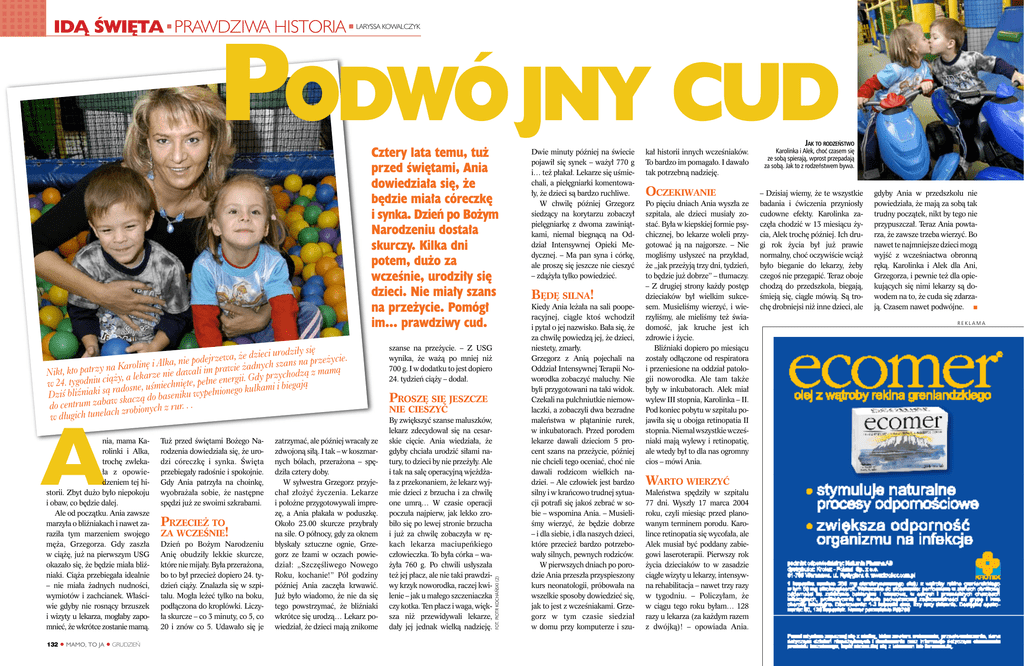 nnnn Podwó jny cud IDĄ ŚWIĘTA PRAWDZIWA HISTORIA n n LARYSSA KOWALCZYK Cztery lata temu, tuż przed świętami, Ania dowiedziała się, że będzie miała córeczkę i synka. Dzień po Bożym Narodzeniu dostała skurczy. Kilka dni potem, dużo za wcześnie, urodziły się dzieci. Nie miały szans na przeżycie. Pomógł im... prawdziwy cud. ziły się a, że dzieci urod w ze jr de po zeżycie. e ni dnych szans na pr amą Karolinę i Alka, ża na ie zy aw tr pr pa im o i kt al m t, Nik zą z e daw ąży, a lekarze ni gii. Gdy pr zychod w 24. tygodniu ci dosne, uśmiechnięte, pełne ener ą aj eg ra o kulkami i bi Dziś bliźniaki są skaczą do baseniku wypełnioneg w do centrum zaba zrobionych z rur. . . ch la w długich tune A nia, mama Karolinki i Alka, trochę zwlekała z opowiedzeniem tej historii. Zbyt dużo było niepokoju i obaw, co będzie dalej. Ale od początku. Ania zawsze marzyła o bliźniakach i nawet zaraziła tym marzeniem swojego męża, Grzegorza. Gdy zaszła w ciążę, już na pierwszym USG okazało się, że będzie miała bliźniaki. Ciąża przebiegała idealnie – nie miała żadnych nudności, wymiotów i zachcianek. Właściwie gdyby nie rosnący brzuszek i wizyty u lekarza, mogłaby zapomnieć, że wkrótce zostanie mamą. 132 l MAMO, TO JA l GRUDZIEŃ Tuż przed świętami Bożego Narodzenia dowiedziała się, że urodzi córeczkę i synka. Święta przebiegały radośnie i spokojnie. Gdy Ania patrzyła na choinkę, wyobrażała sobie, że następne spędzi już ze swoimi szkrabami. Przecież to za wcześnie! Dzień po Bożym Narodzeniu Anię obudziły lekkie skurcze, które nie mijały. Była przerażona, bo to był przecież dopiero 24. tydzień ciąży. Znalazła się w szpitalu. Mogła leżeć tylko na boku, podłączona do kroplówki. Liczyła skurcze – co 3 minuty, co 5, co 20 i znów co 5. Udawało się je zatrzymać, ale później wracały ze zdwojoną siłą. I tak – w koszmarnych bólach, przerażona – spędziła cztery doby. W sylwestra Grzegorz przyjechał złożyć życzenia. Lekarze i położne przygotowywali imprezę, a Ania płakała w poduszkę. Około 23.00 skurcze przybrały na sile. O północy, gdy za oknem błyskały sztuczne ognie, Grzegorz ze łzami w oczach powiedział: „Szczęśliwego Nowego Roku, kochanie!” Pół godziny później Ania zaczęła krwawić. Już było wiadomo, że nie da się tego powstrzymać, że bliźniaki wkrótce się urodzą… Lekarz powiedział, że dzieci mają znikome szanse na przeżycie. – Z USG wynika, że ważą po mniej niż 700 g. I w dodatku to jest dopiero 24. tydzień ciąży – dodał. Proszę się jeszcze nie cieszyć By zwiększyć szanse maluszków, lekarz zdecydował się na cesarskie cięcie. Ania wiedziała, że gdyby chciała urodzić siłami natury, to dzieci by nie przeżyły. Ale i tak na salę operacyjną wjeżdżała z przekonaniem, że lekarz wyjmie dzieci z brzucha i za chwilę one umrą… W czasie operacji poczuła najpierw, jak lekko zrobiło się po lewej stronie brzucha i już za chwilę zobaczyła w rękach lekarza maciupeńkiego człowieczka. To była córka – ważyła 760 g. Po chwili usłyszała też jej płacz, ale nie taki prawdziwy krzyk noworodka, raczej kwilenie – jak u małego szczeniaczka czy kotka. Ten płacz i waga, większa niż przewidywali lekarze, dały jej jednak wielką nadzieję. Fot. piotr kochański (2) nnnnnnnn nnnnnnnn nnnnnnnn Dwie minuty później na świecie pojawił się synek – ważył 770 g i… też płakał. Lekarze się uśmiechali, a pielęgniarki komentowały, że dzieci są bardzo ruchliwe. W chwilę później Grzegorz siedzący na korytarzu zobaczył pielęgniarkę z dwoma zawiniątkami, niemal biegnącą na Oddział Intensywnej Opieki Medycznej. – Ma pan syna i córkę, ale proszę się jeszcze nie cieszyć – zdążyła tylko powiedzieć. Będę silna! Kiedy Ania leżała na sali pooperacyjnej, ciągle ktoś wchodził i pytał o jej nazwisko. Bała się, że za chwilę powiedzą jej, że dzieci, niestety, zmarły. Grzegorz z Anią pojechali na Oddział Intensywnej Terapii Noworodka zobaczyć maluchy. Nie byli przygotowani na taki widok. Czekali na pulchniutkie niemowlaczki, a zobaczyli dwa bezradne maleństwa w plątaninie rurek, w inkubatorach. Przed porodem lekarze dawali dzieciom 5 procent szans na przeżycie, później nie chcieli tego oceniać, choć nie dawali rodzicom wielkich nadziei. – Ale człowiek jest bardzo silny i w krańcowo trudnej sytuacji potrafi się jakoś zebrać w sobie – wspomina Ania. – Musieliśmy wierzyć, że będzie dobrze – i dla siebie, i dla naszych dzieci, które przecież bardzo potrzebowały silnych, pewnych rodziców. W pierwszych dniach po porodzie Ania przeszła przyspieszony kurs neonatologii, próbowała na wszelkie sposoby dowiedzieć się, jak to jest z wcześniakami. Grzegorz w tym czasie siedział w domu przy komputerze i szu- kał historii innych wcześniaków. To bardzo im pomagało. I dawało tak potrzebną nadzieję. Oczekiwanie Po pięciu dniach Ania wyszła ze szpitala, ale dzieci musiały zostać. Była w kiepskiej formie psychicznej, bo lekarze woleli przygotować ją na najgorsze. – Nie mogliśmy usłyszeć na przykład, że „jak przeżyją trzy dni, tydzień, to będzie już dobrze” – tłumaczy. – Z drugiej strony każdy postęp dzieciaków był wielkim sukcesem. Musieliśmy wierzyć, i wierzyliśmy, ale mieliśmy też świadomość, jak kruche jest ich zdrowie i życie. Bliźniaki dopiero po miesiącu zostały odłączone od respiratora i przeniesione na oddział patologii noworodka. Ale tam także były w inkubatorach. Alek miał wylew III stopnia, Karolinka – II. Pod koniec pobytu w szpitalu pojawiła się u obojga retinopatia II stopnia. Niemal wszystkie wcześniaki mają wylewy i retinopatię, ale wtedy był to dla nas ogromny cios – mówi Ania. Warto wierzyć Maleństwa spędziły w szpitalu 77 dni. Wyszły 17 marca 2004 roku, czyli mi